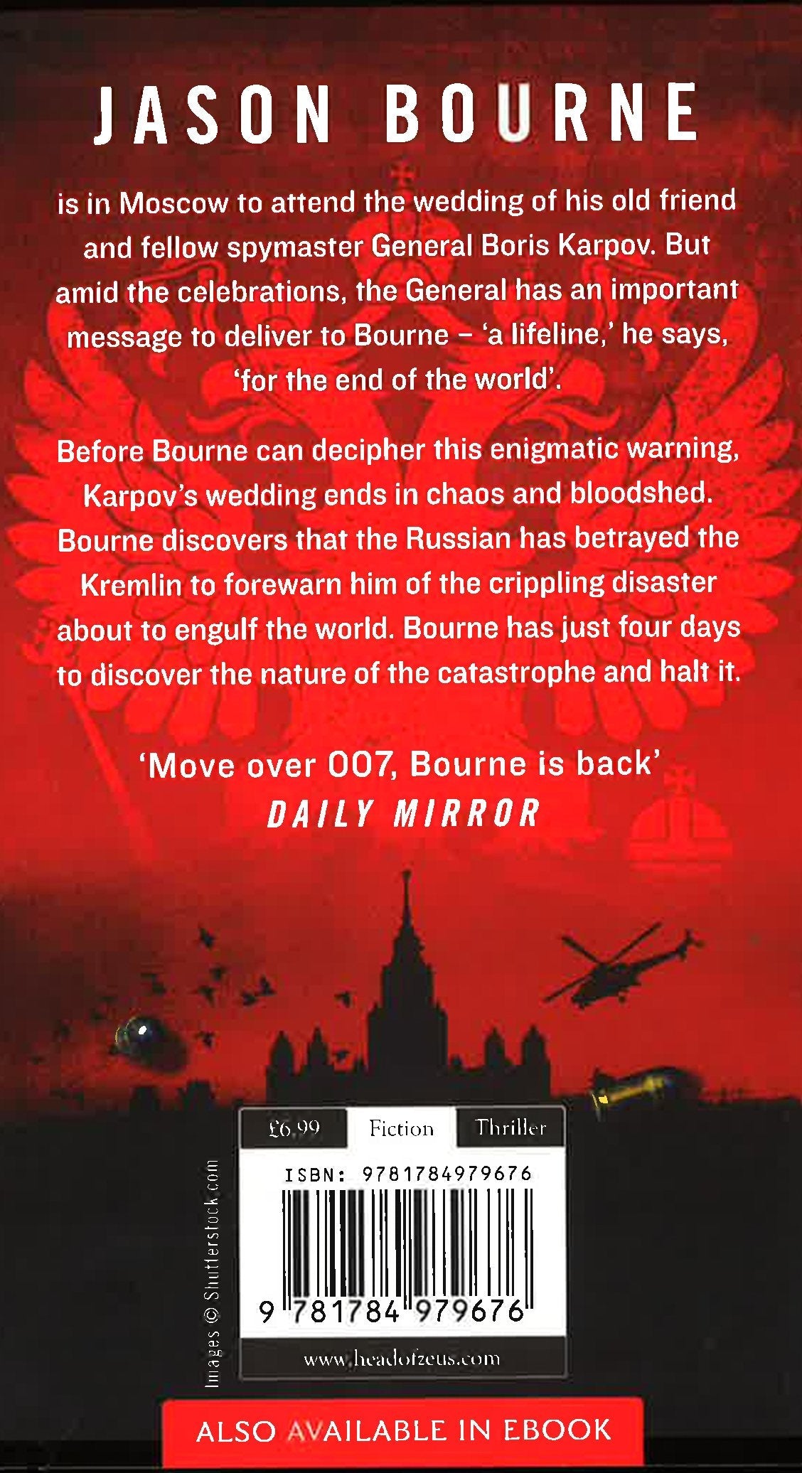 Jason Bourne's old friend and covert brother-in-arms, Colonel Boris Karpov, is brutally murdered. The main suspect is Sara Yadin, a Mossad agent and Bourne's lover. Jason Bourne is in Moscow to attend the wedding of his old friend and fellow spymaster General Boris Karpov. But amid the celebrations, the General has an important message to deliver to Bourne - 'a lifeline,' he says, 'for the end of the world'. Before Bourne can decipher this enigmatic warning, Karpov's wedding ends in chaos and bloodshed. Bourne discovers that the Russian has betrayed the Kremlin to forewarn him of the crippling disaster about to engulf the world. Bourne has just four days to discover the nature of the catastrophe and halt it. To get to the truth, Bourne must first track down an infamous and elusive arms dealer - a man both he and Karpov have been hunting for years. With the clock ticking, Bourne follows a labyrinthine path that weaves from the underbelly of Moscow to the pyramids of Egypt and the war-torn border between Syria and Turkey as he races to stop a world-threatening conspiracy in its tracks.