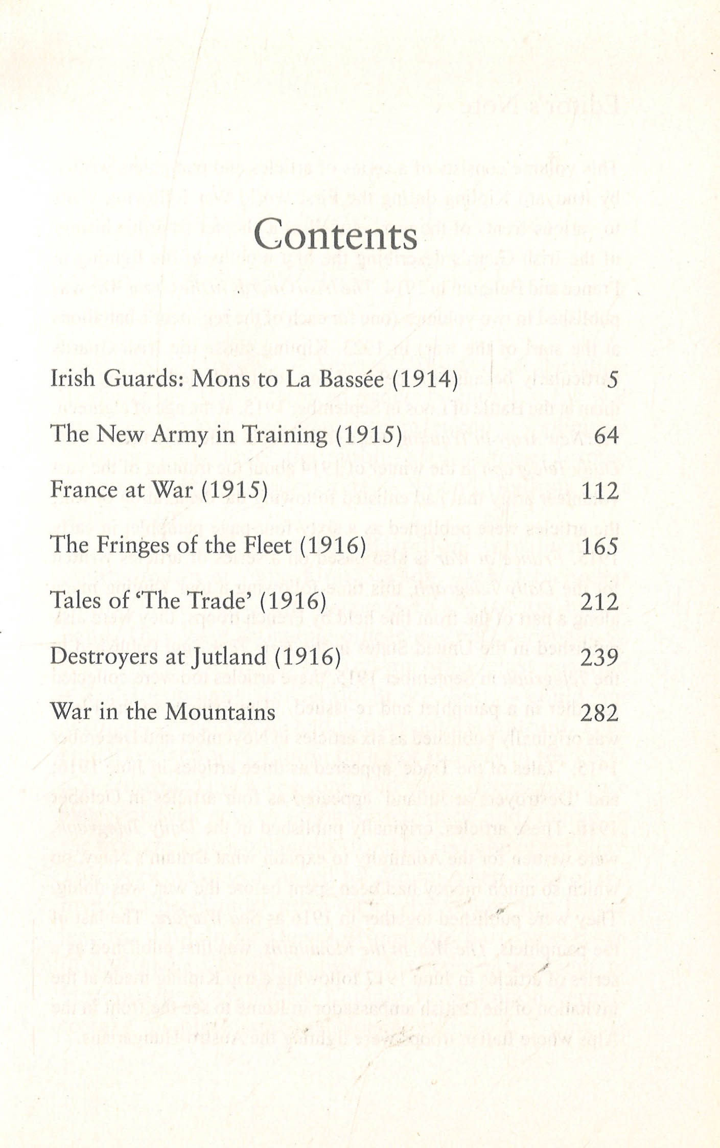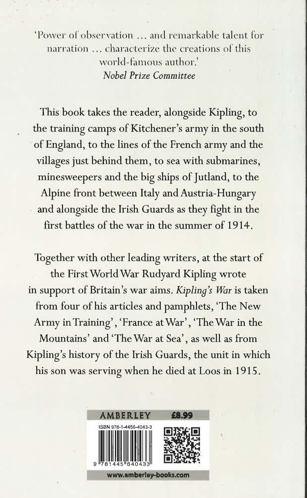 This book takes the reader, alongside Kipling, to the training camps of Kitchener's army in the south of England, to the lines of the French army and the villages just behind them, to sea with submarines, minesweepers and the big ships of Jutland, to the Alpine front between Italy and Austria-Hungary and alongside the Irish Guards as they fight in the first battles of the war in the summer of 1914. Together with other leading writers, at the start of the First World War Rudyard Kipling wrote in support of Britain's war aims. Kipling's War is taken from four of his articles and pamphlets, 'The New Army in Training', 'France at War', 'The War in the Mountains' and 'The War at Sea', as well as from Kipling's history of the Irish Guards, the unit in which his son was serving when he died at Loos in 1915.