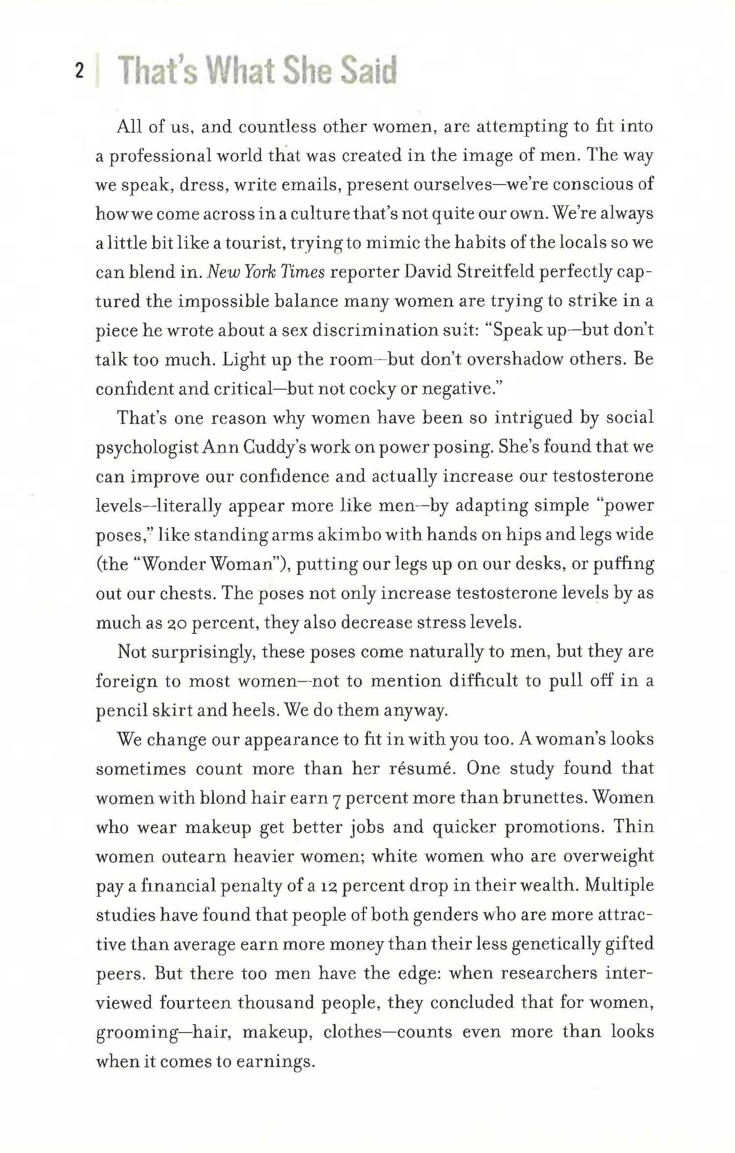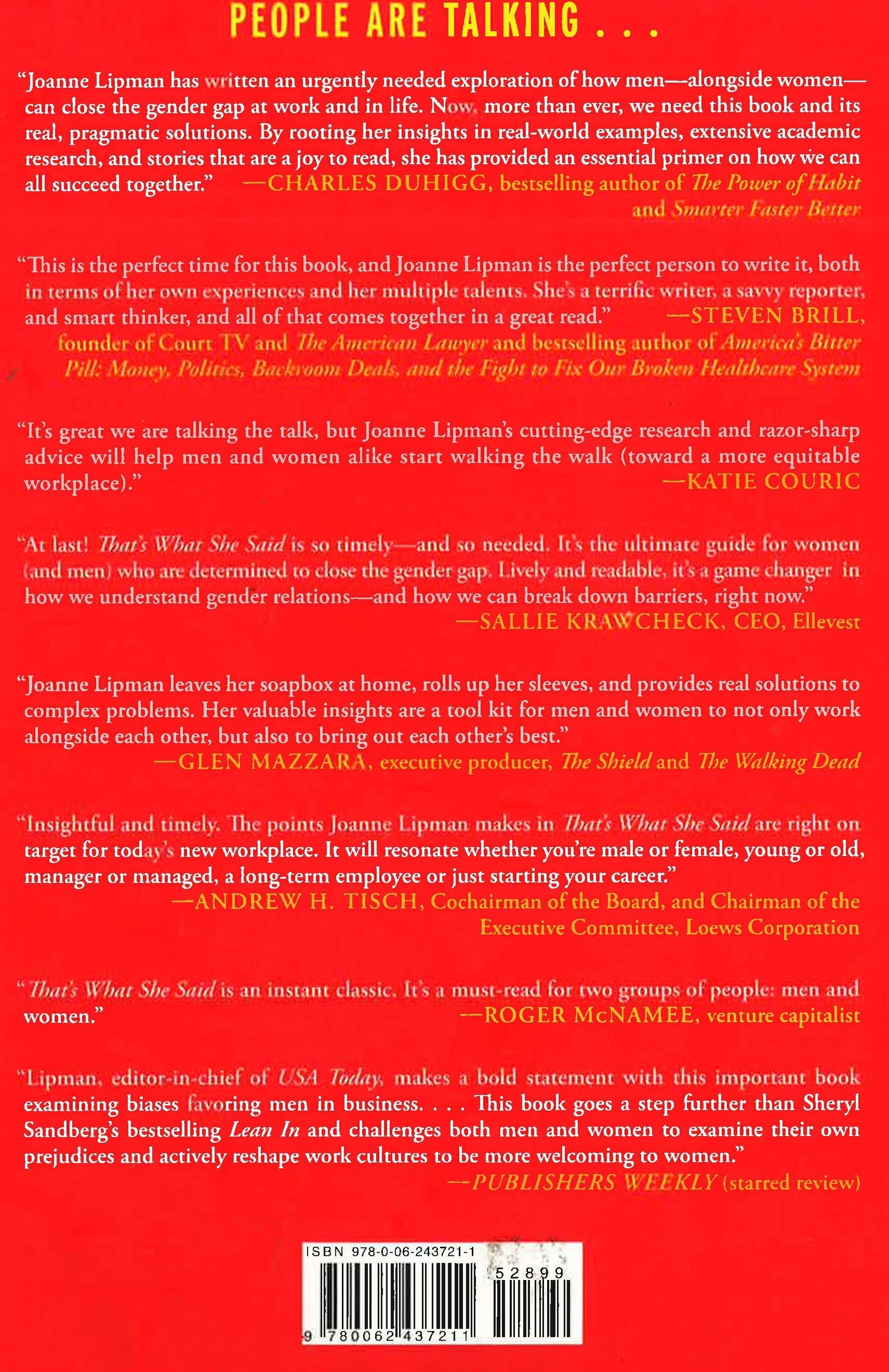 First things first: There will be no man shaming in That’s What She Said. A recent Harvard study found that corporate “diversity training” has actually made the gender gap worse - in part because it makes men feel demonized. Women, meanwhile, have been told closing the gender gap is up to them: they need to speak up, to be more confident, to demand to be paid what they’re worth. They discuss these issues amongst themselves all the time. What they don’t do is talk to men about it. It’s time to end that disconnect. More people in leadership roles are genuinely trying to transform the way we work together, because there's abundant evidence that companies with more women in senior leadership perform better by virtually every measure. Yet despite good intentions, men often lack the tools they need, leading to fumbles, missteps, frustration and misunderstanding that continue to inflict real and lasting damage on women's careers.That's What She Said solves for that dilemma. Filled with illuminating anecdotes, data from the most recent studies, and stories from Joanne Lipman’s own journey to the top of a male-dominated industry, it shows how we can win by reaching across the gender divide. What can the Enron scandal teach us about the way men and women communicate professionally? How does brain chemistry help explain men’s fear of women’s emotions at work? Why did Kimberly Clark have an all-male team of executives in charge of their Kotex tampon line? What can we learn from Iceland’s campaign to “feminize” an entire nation? That’s What She Said shows why empowering women as true equals is an essential goal for women and men - and offers a roadmap for getting there.