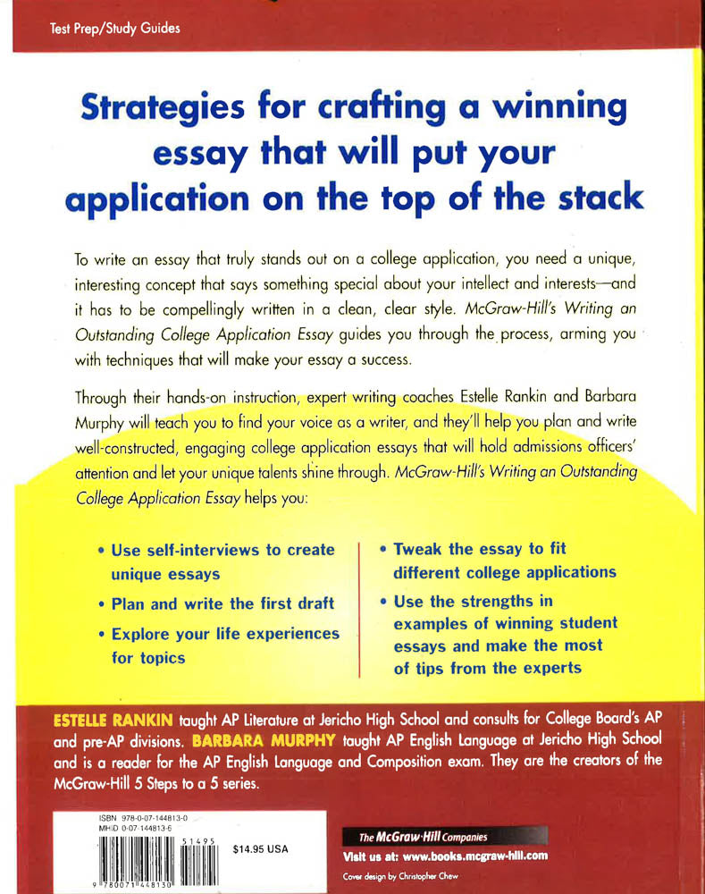 Your college application essay is your big chance to make a lasting impression. This book shows you how. It helps you: use self-interviews to create unique essays; plan and write the first draft; mine life experiences for topics; and tweak the essay to fit different college applications.Write an original, show-stopping essay and get into the college of your dreams. How would you rather be defined - as a series of numbers representing four years of high school or in an articulate explanation of who you really are and what you want to be? Your college application essay is your big chance to make a lasting impression, and the expert guidance in "McGraw-Hill's Writing an Outstanding College Application Essay" shows you how.Expert writing coaches Estelle Rankin and Barbara Murphy show you how to craft a creative and original essay that will get you into the top college of your choice. Through their hands-on instruction, they'll teach you to find your voice as a writer, and they'll help you plan and write well-constructed, engaging college application essays that will hold admissions officers' attention and let your unique talents shine through. "McGraw-Hill's Writing an Outstanding College Application Essay" helps you: use self-interviews to create unique essays; plan and write the first draft; mine life experiences for topics; tweak the essay to fit different college applications; and use the strengths in examples of winning student essays and make the most of tips from the experts.