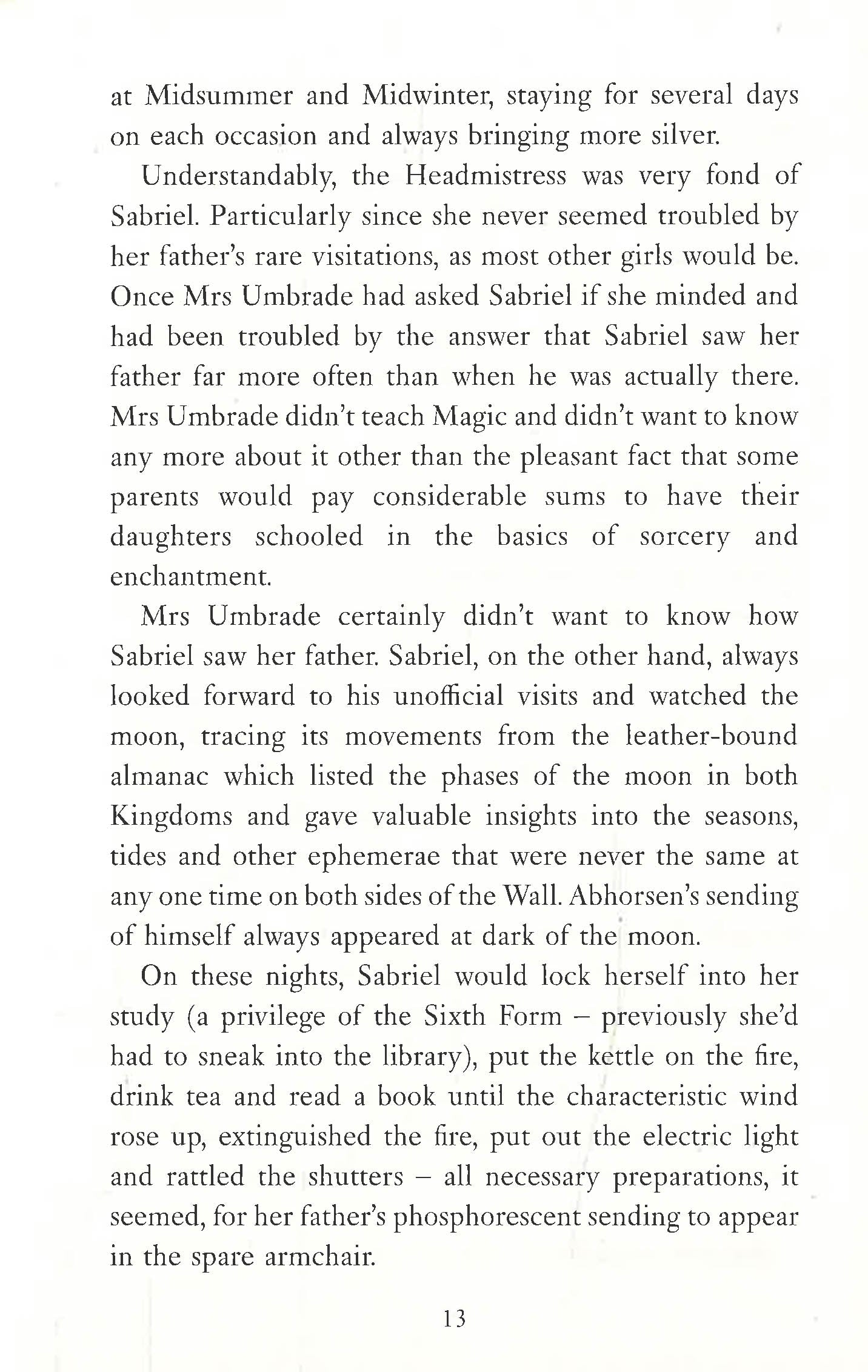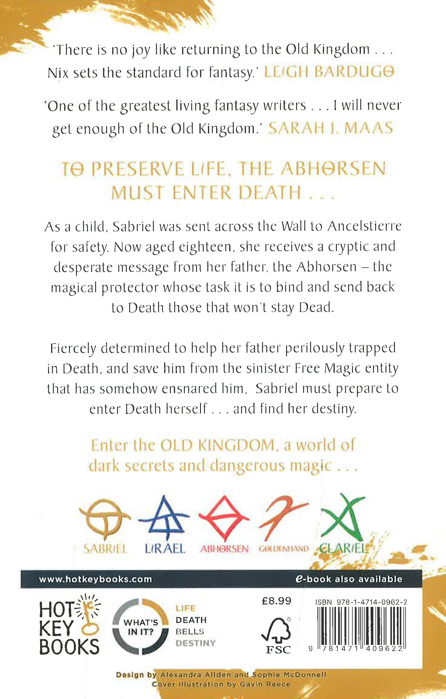 The Old Kingdom is a place of free magic, necromancers and ancient spirits bound to elemental forces. Who will guard the living when the dead arise? Sabriel has spent most of her young life far away from the magical realm of the Old Kingdom, and the Dead that roam it. But then a creature from across the Wall arrives at her all-girls boarding school with a message from her father, the Abhorsen - the magical protector of the realm whose task it is to bind and send back to Death those that won't stay Dead. Since the demise of the Royal Family the Dead have become stronger and more fearless, and now it seems their forces are threatening to overwhelm the Old Kingdom. Sabriel's father has been trapped in Death by a dangerous Free Magic creature. He urges her to return to her homeland, and to discover who or what is behind this uprising. Armed with her father's binding-bells and sword, she soon finds companions in Mogget, an ancient spirit bound into the body of a cat, and Touchstone, a young Charter Mage whom Sabriel frees from a long, magical imprisonment. As the three travel deep into the Old Kingdom, threats mount on all sides. And every step brings them closer to a battle that will pit them against the true forces of life and death - and bring Sabriel face-to-face with her own destiny.