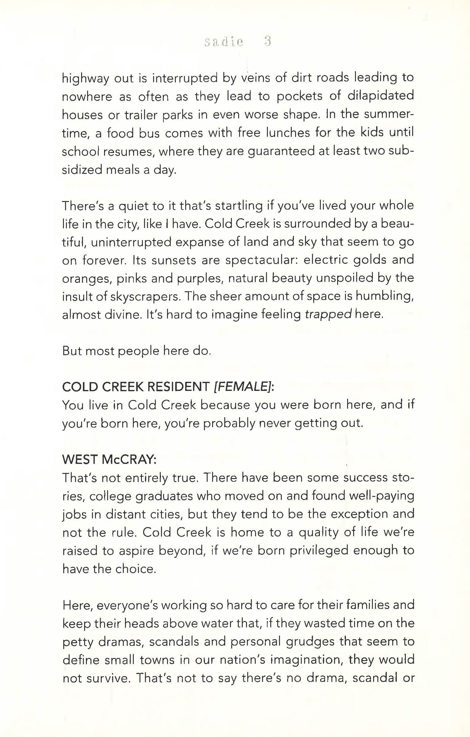 When popular radio personality West McCray receives a desperate phone call from a stranger imploring him to find nineteen-year-old runaway Sadie Hunter, he's not convinced there's a story there; girls go missing all the time. But when it's revealed that Sadie fled home after the brutal murder of her little sister, Mattie, West travels to the small town of Cold Creek, Colorado, to uncover what happened.