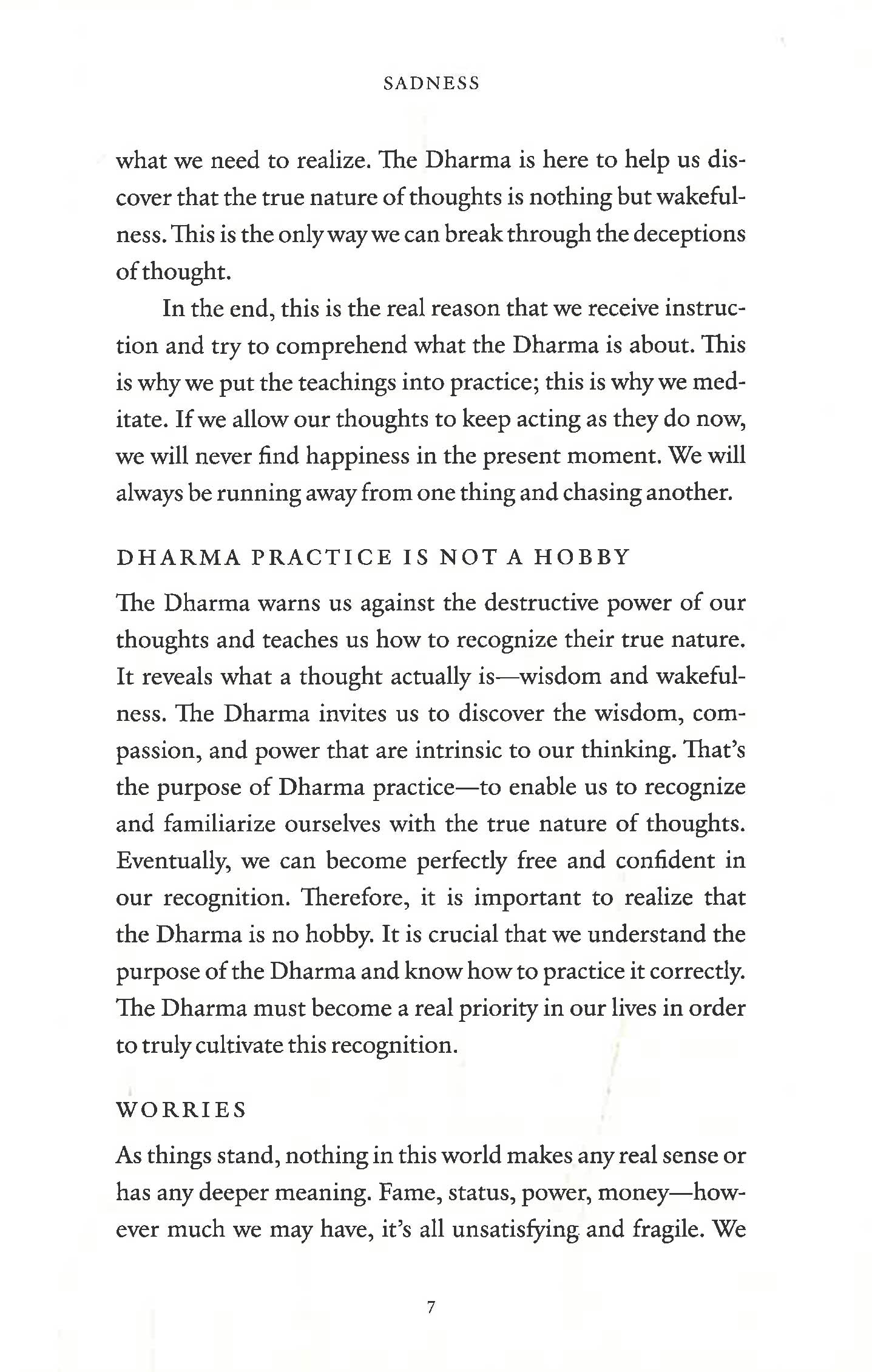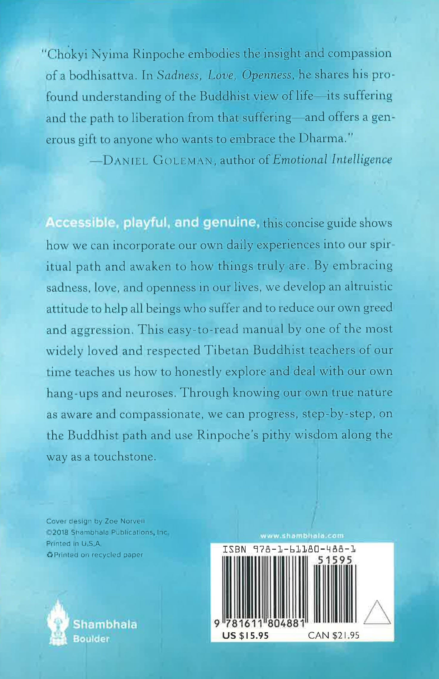 Accessible, playful, and genuine, this concise guide shows how we can incorporate our own daily experiences into our spiritual path and awaken to how things truly are. By embracing sadness, love, and openness in our lives, we develop an altruistic attitude to help all beings who suffer and to reduce our own greed and aggression. This easy-to-read manual by one of the most widely loved and respected Tibetan Buddhist teachers of our time teaches us how to honestly explore and deal with our own hang-ups and neuroses. Through knowing our own true nature as aware and compassionate, we can progress, step-by-step, on the Buddhist path and use Rinpoche's pithy wisdom along the way as a touchstone.