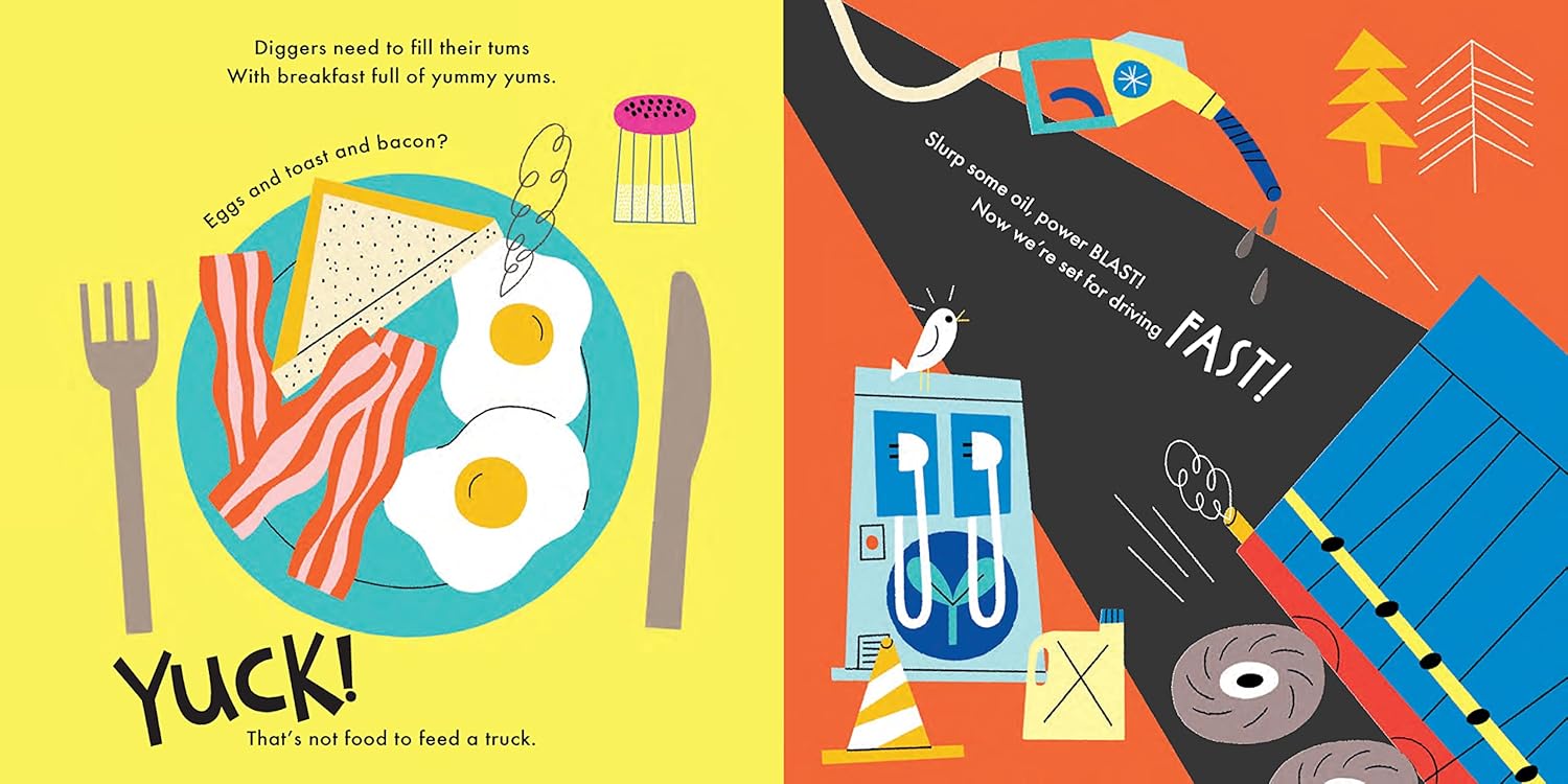 Follow the trusty truck crew as they go about their everyday routine: from what they eat for breakfast (definitely NOT eggs and bacon – yuck!) to digging pits and rolling roads. Hold on to your hard hats – it’s going to be a busy day!