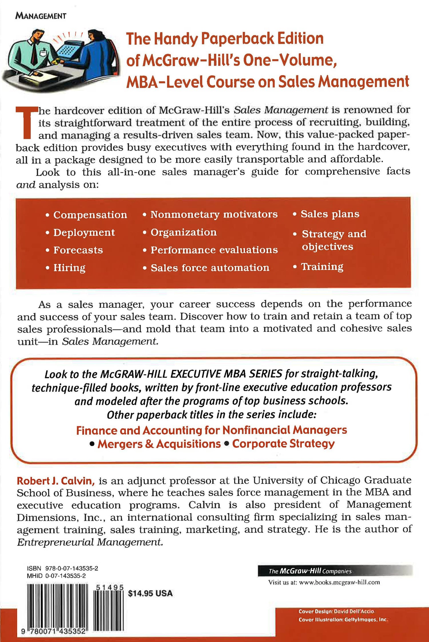This is the handy paperback edition of McGraw-Hill's One-Volume, "MBA-Level Course on Sales Management". The hardcover edition of McGraw-Hill's "Sales Management" is renowned for its straightforward treatment of the entire process of recruiting, building, and managing a results-driven sales team. Now, this value-packed paperback edition provides busy executives with everything found in the hardcover, all in a package designed to be more easily transportable and affordable.Look to this all-in-one sales manager's guide for comprehensive facts and analysis on: strategy and objectives; hiring; training; compensation; organization; deployment; forecasts; sales plans; nonmonetary motivators; sales force automation; and, performance evaluations. As a sales manager, your career success depends on the performance and success of your sales team. Discover how to train and retain a team of top sales professionals - and mold that team into a motivated and cohesive sales unit - in sales management. Look to the McGraw-Hill "Executive MBA Series" for straight-talking, technique-filled books, written by front-line executive education professors and modeled after the programs of top business schools. The other paperback titles in the series include: "Finance and Accounting for Nonfinancial Managers", "Mergers & Acquisitions", and "Corporate Strategy".