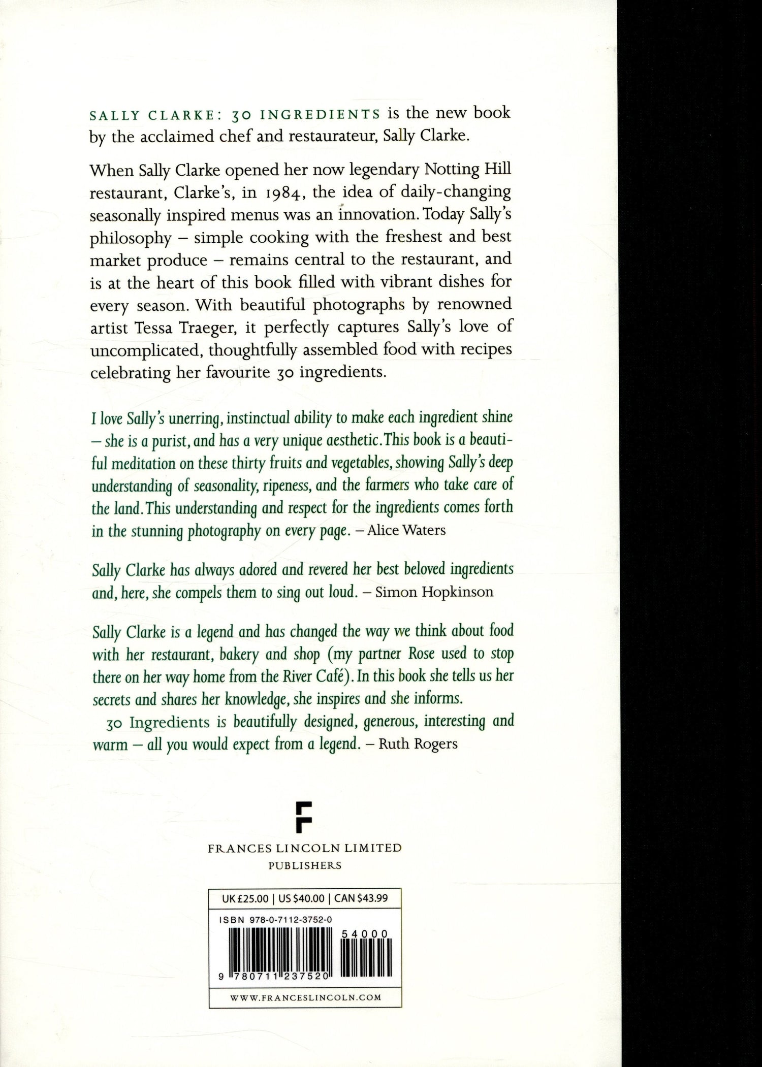 Beautifully simple recipes from one of Britain's unsung culinary heroes.'(Nigel Slater Observer Food Monthly) 'If you only buy one cookbook this year, it should probably be this one'.(Telegraph Magazine) Britain's pioneer of seasonal cooking Sally Clarke is back with a new collection of seasonal recipes to mark the 30th birthday year of her legendary Notting Hill restaurant. Known for pioneering seasonal fine dining in British cuisine, the award winning chef, restaurateur and author has chosen a handful of recipes for each of her favourite 30 ingredients in her stunning new cookery book. The simple idea of cooking with the freshest and best market produce, Sally Clarke's vision for thirty years, is at the heart of her new book of ninety-five recipes.