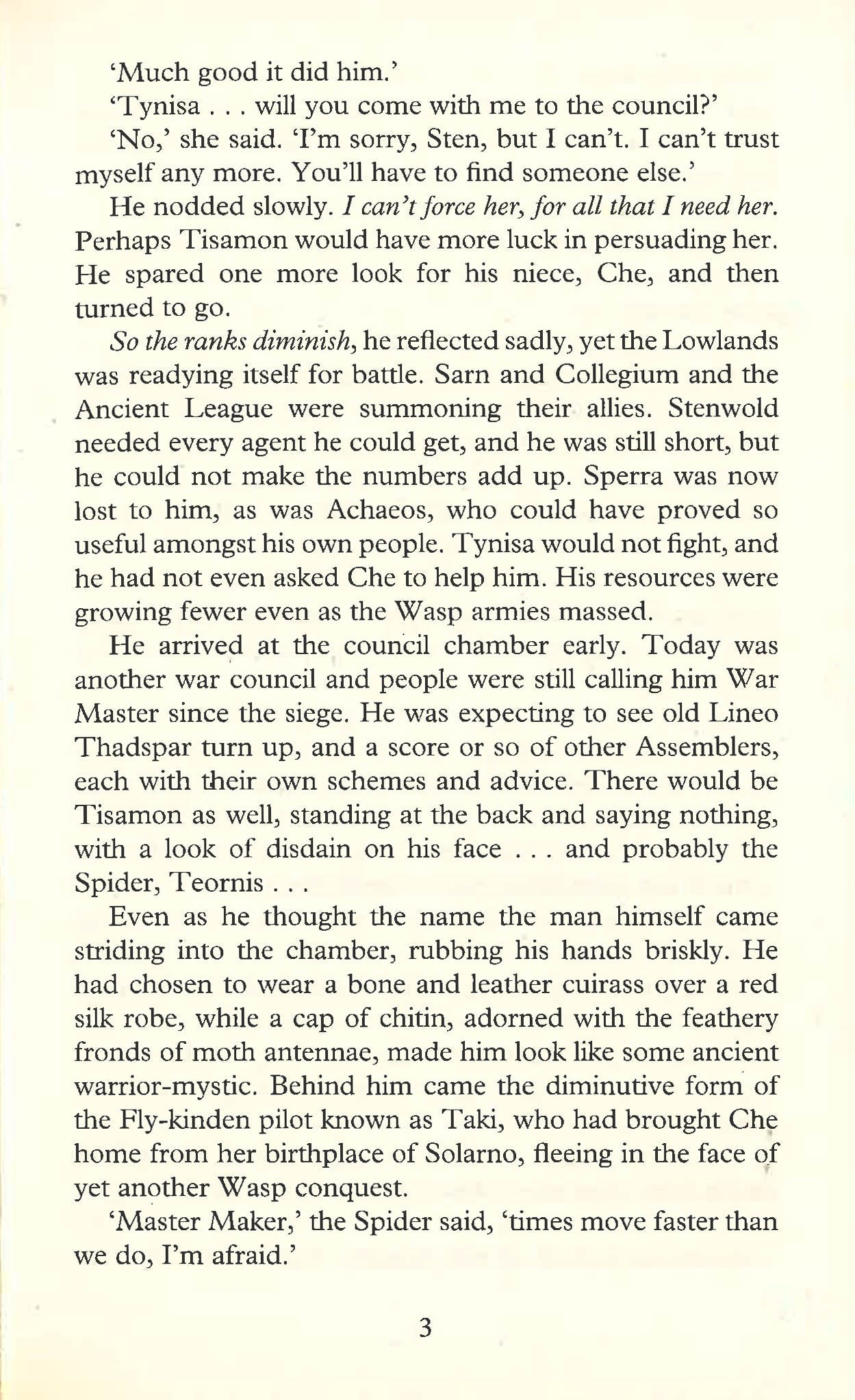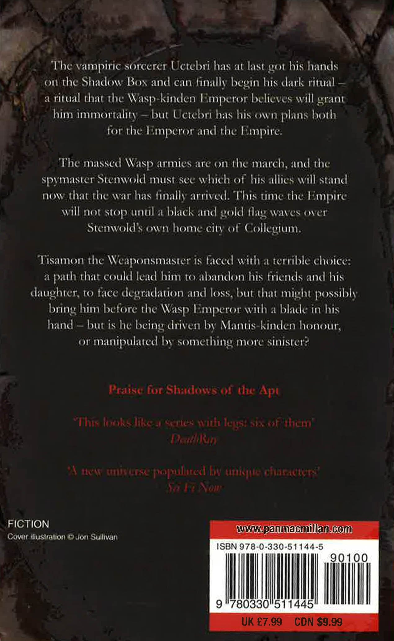 The vampiric sorcerer Uctebri has at last got his hands on the Shadow Box and can finally begin his dark ritual - a ritual that the Wasp-kinden Emperor believes will grant him immortality - but Uctebri has his own plans both for the Emperor and the Empire. The massed Wasp armies are on the march, and the spymaster Stenwold must see which of his allies will stand now that the war has finally arrived. This time the Empire will not stop until a black and gold flag waves over Stenwold's own home city of Collegium. Tisamon the Weaponsmaster is faced with a terrible choice: a path that could lead him to abandon his friends and his daughter, to face degradation and loss, but that might possibly bring him before the Wasp Emperor with a blade in his hand - but is he being driven by Mantis-kinden honour, or manipulated by something more sinister?