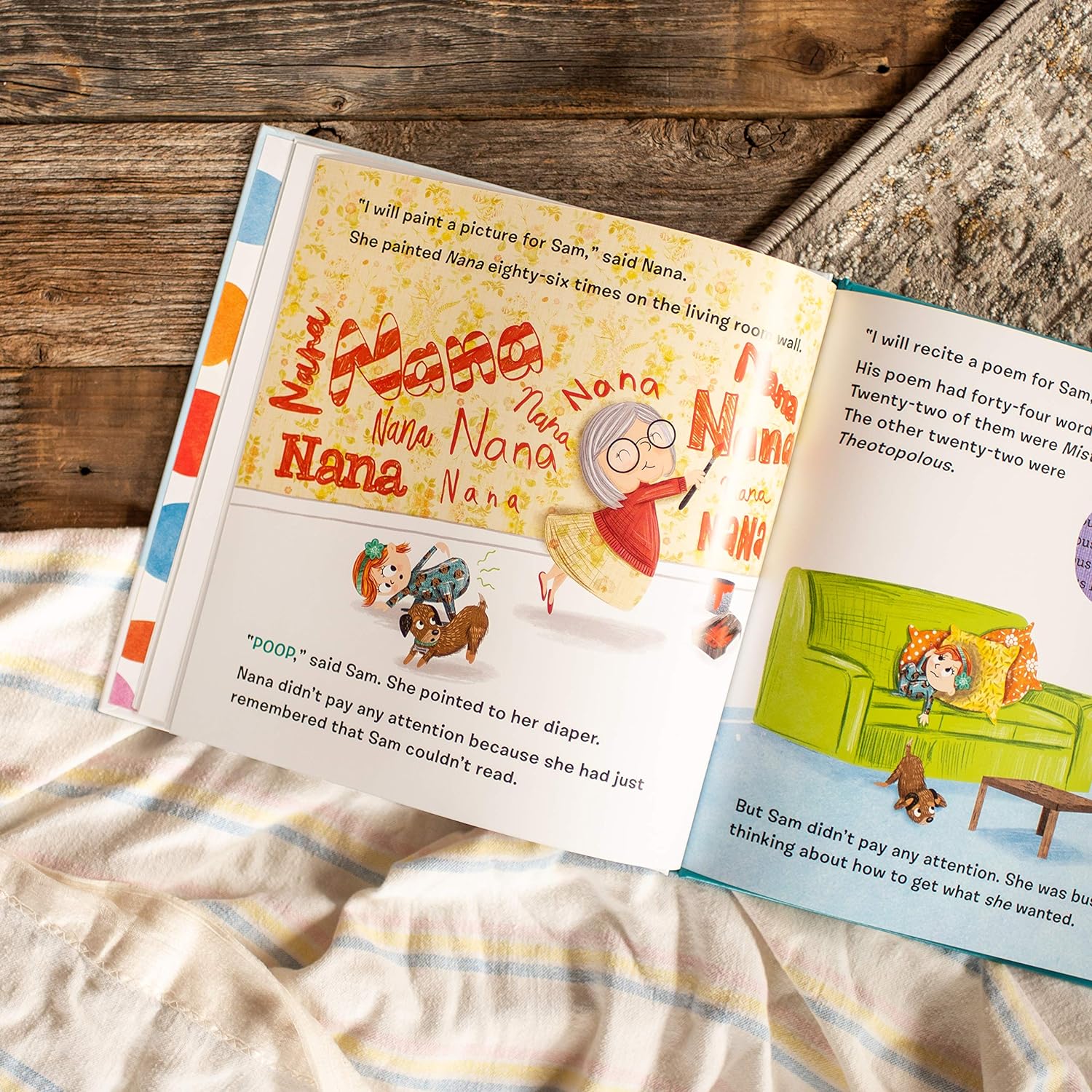 Everyone in Sam's family wants her to say their name for her first word. To convince her, Mama sings, Papa tells a story, and Nana draws. Even their neighbor Mr. Theotopolous gets in on the action by performing an epic poem. Sam definitely has something to say, something urgent, but how can she make her family stop thinking about themselves and listen? When all else fails, she may have to do something drastic to make them hear her first word--POOP!--loud and clear.