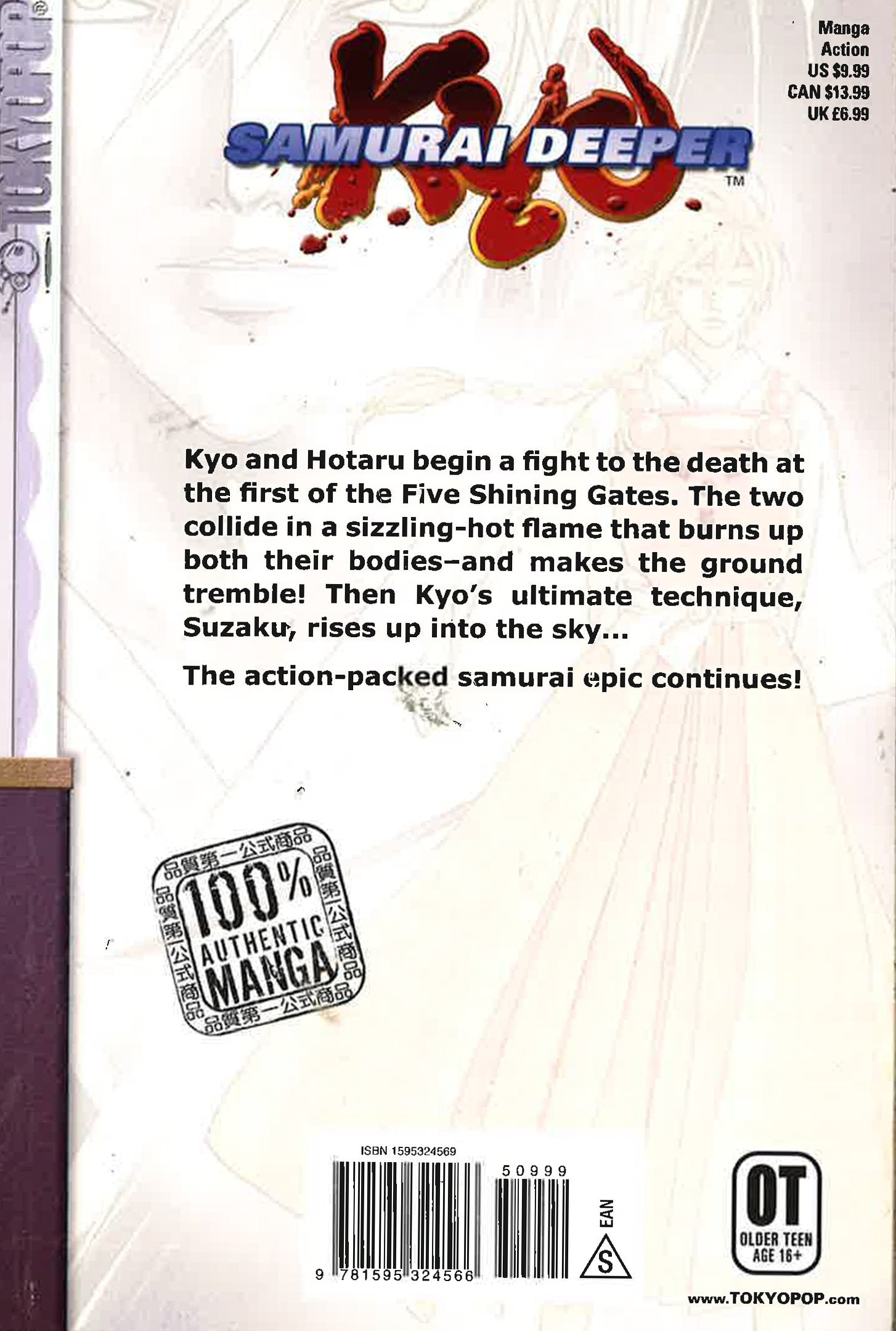 Kyo and Hotaru begin a fight to the death at the first of the Five Shining Gates. The two collide in a sizzling-hot flame that burns up both their bodies - and makes the ground tremble! Then Kyo's ultimate technique, Suzaku, rises up into the sky...The action-packed samurai epic continues!