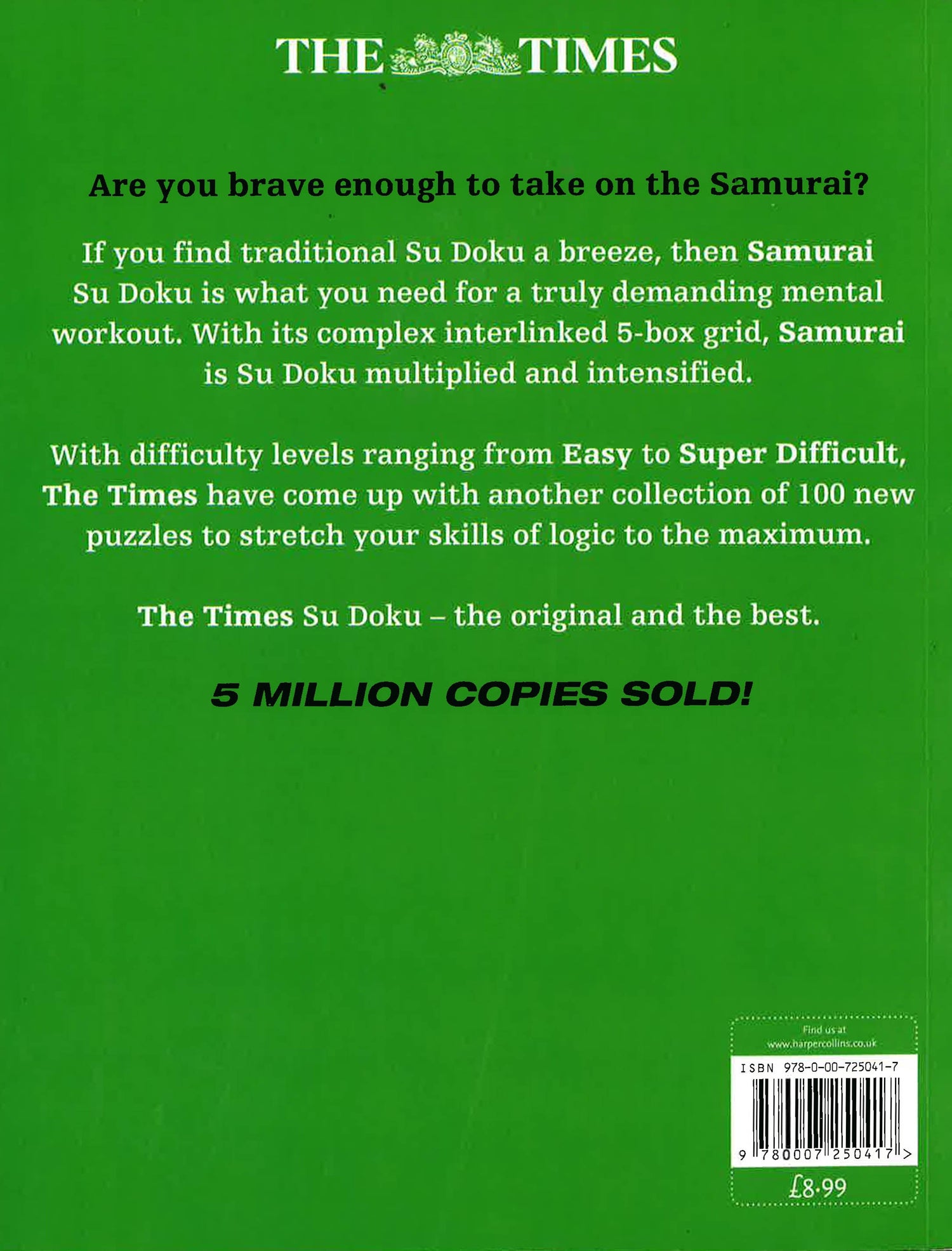 If you find traditional Su Doku a breeze, then Samurai Su Doku is what you need for a truly demanding mental workout. With its complex, interlinked 5-box grid, Samurai is Su Doku multiplied and intensified. With difficulty levels ranging from Easy to Super Difficult, The Times have come up with another collection of 100 new puzzles to stretch your skills of logic to the utmost.