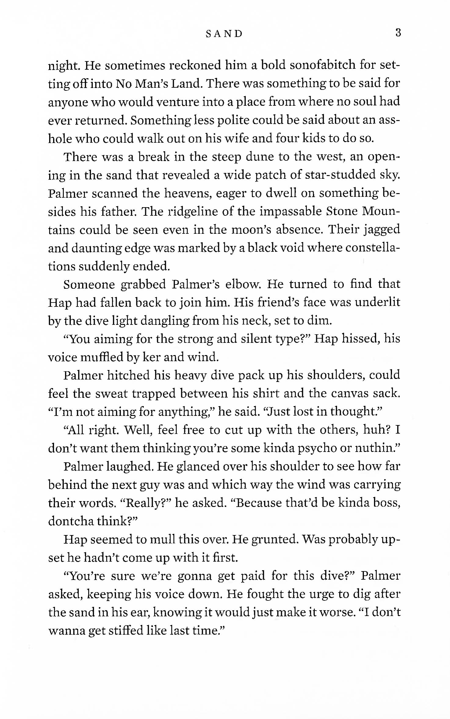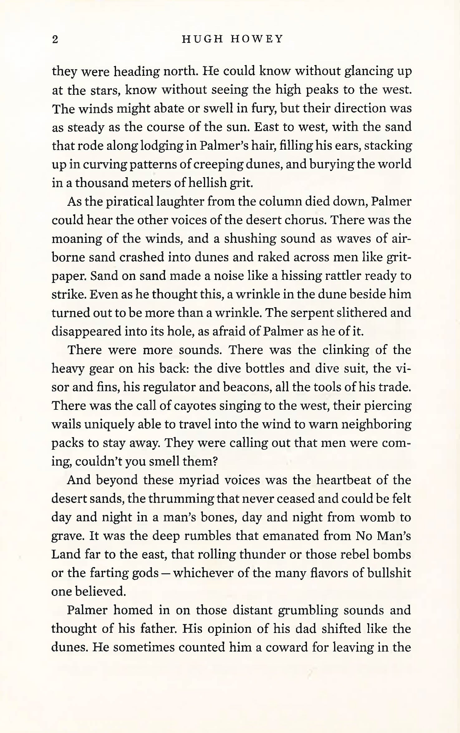 "The old world is buried. A new one has been forged atop the shifting dunes. Here in this land of howling wind and infernal sand, four siblings find themselves scattered and lost. Their father was a sand diver, one of the elite few who could travel deep beneath the desert floor and bring up the relics and scraps that keep their people alive. But their father is gone. And the world he left behind might be next. Welcome to the world of Sand, a novel by New York Times best-selling author Hugh Howey. Sand isan exploration of lawlessness, the tale of a land ignored. Here is a people left to fend for themselves.