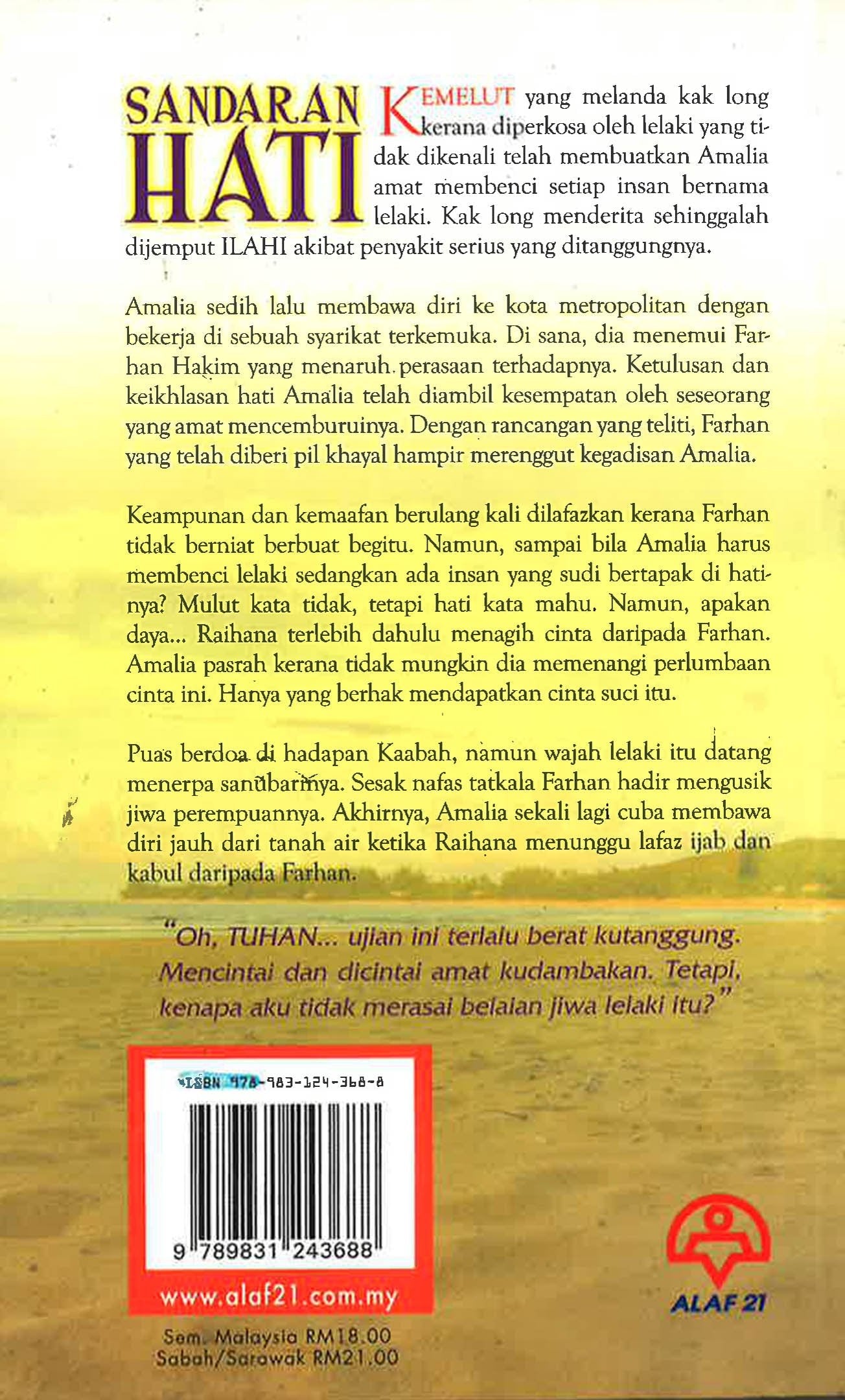 KEMELUT yang melanda kak long HATI kerana diperkosa oleh lelaki yang ti- dak dikenali telah membuatkan Amalia amat membenci setiap insan bernama lelaki. Kak long menderita sehinggalah dijemput ILAHI akibat penyakit serius yang ditanggungnya. Amalia sedih lalu membawa diri ke kota metropolitan dengan bekerja di sebuah syarikat terkemuka. Di sana, dia menemui Far han Hakim yang menaruh perasaan terhadapnya. Ketulusan dan keikhlasan hati Amalia telah diambil kesempatan oleh seseorang yang amat mencemburuinya. Dengan rancangan yang teliti, Farhan yang telah diberi pil khayal hampir merenggut kegadisan Amalia. Keampunan dan kemaafan berulang kali dilafazkan kerana Farhan tidak berniat berbuat begitu. Namun, sampai bila Amalia harus membenci lelaki sedangkan ada insan yang sudi bertapak di hati nya? Mulut kata tidak, tetapi hati kata mahu. Namun, apakan daya... Raihana terlebih dahulu menagih cinta daripada Farhan. Amalia pasrah kerana tidak mungkin dia memenangi perlumbaan cinta ini. Hanya yang berhak mendapatkan cinta suci itu. Puas berdoa di hadapan Kaabah, namun wajah lelaki itu datang menerpa sanubarinya. Sesak nafas tatkala Farhan hadir mengusik jiwa perempuannya. Akhirnya, Amalia sekali lagi cuba membawa diri jauh dari tanah air ketika Raihana menunggu lafaz ijab dan kabul daripada Farhan