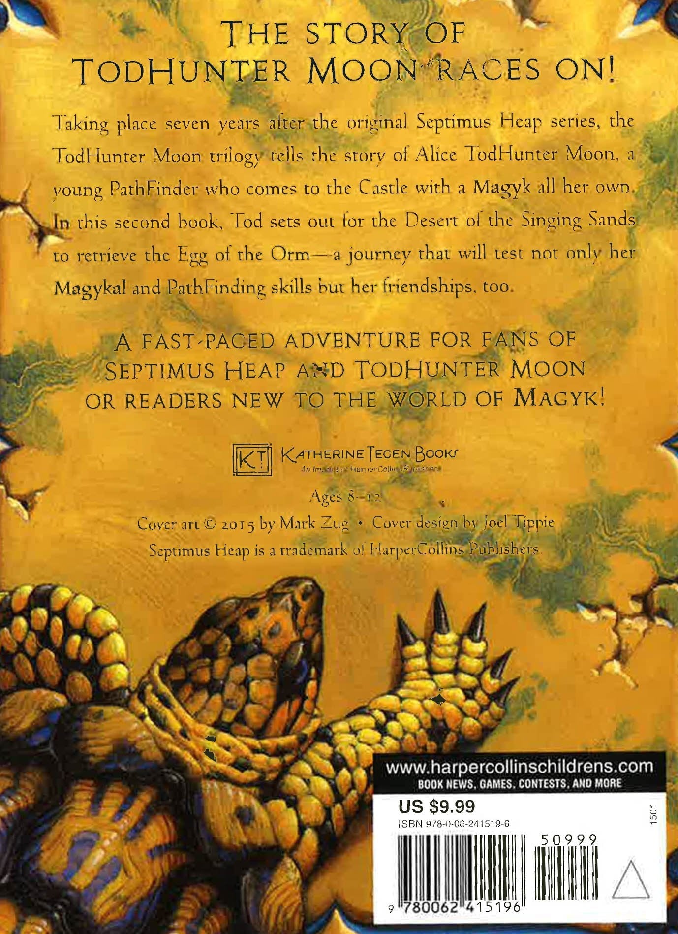 Taking place seven years after the events of the original Septimus Heap series, TodHunter Moon tells the story of Alice TodHunter Moon, a young PathFinder who comes to the Castle with a Magyk all her own. In this second book, Tod sets out for the Desert of the Singing Sands to retrieve the Egg of the Orm - a journey that will test not only her Magykal and PathFinding skills, but her friendships, too.