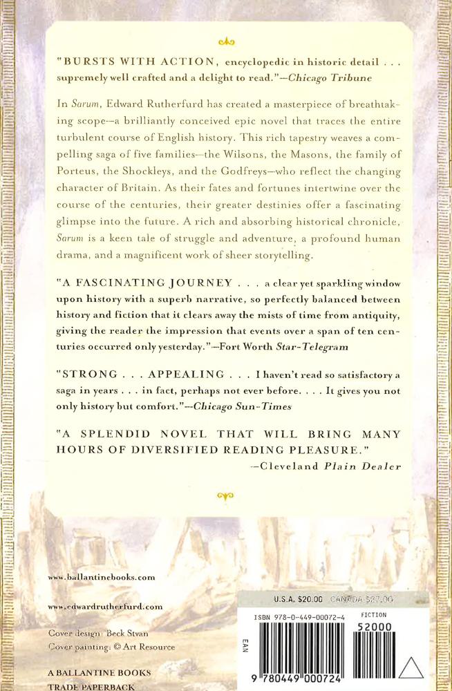 A masterpiece of breathtaking scope--a brilliantly conceived epic novel that traces the entire turbulent course of English history This rich tapestry weaves a compelling saga of five families--the Wilsons, the Masons, the family of Porteus, the Shockleys, and the Godfreys--who reflect the changing character of Britain. As their fates and fortunes intertwine over the course of the centuries, their greater destinies offer a fascinating glimpse into the future. An absorbing historical chronicle, Sarum is a keen tale of struggle and adventure, a profound human drama, and a magnificent work of sheer storytelling. Praise for Sarum "Bursts with action, encyclopedic in historic detail . . . supremely well crafted and a delight to read."--Chicago Tribune "A fascinating journey . . . a clear yet sparkling window upon history with a superb narrative, so perfectly balanced between history and fiction that it clears away the mists of time from antiquity, giving the reader the impression that events over a span of ten centuries occurred only yesterday."--Fort Worth Star-Telegram "Strong . . . appealing . . . I haven't read so satisfactory a saga in years . . . in fact, perhaps not ever before. . . . It gives you not only history but comfort."--Chicago Sun-Times "[Edward] Rutherfurd holds us all consistently intrigued. In Sarum he has created a splendid novel that will bring many hours of diversified reading pleasure."--The Plain Dealer "A richly imagined vision of history, written with genuine delight."--San Francisco Chronicle "Rutherfurd is at his best. . . . His storytelling skills are substantial. . . . One of the best books of the season."--Kansas City Star "Absorbing . . . a superior historical novel . . . This blockbuster saga should appeal to discriminating readers, since Rutherfurd has an excellent grasp of his subject and a compelling story to tell."--Publishers Weekly