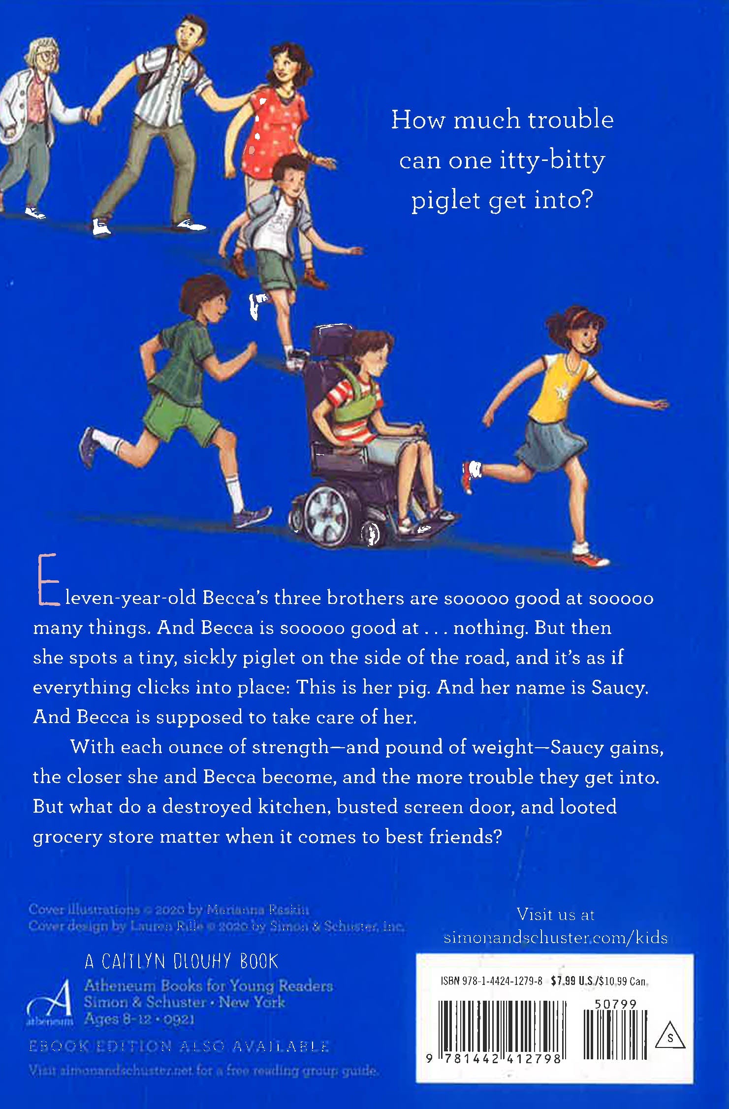 But when she finds a tiny, sick piglet on the side of the road, Becca knows this is it. This is her thing. She names the piglet Saucy and between her own pleading and Saucy’s sweet, pink face, Becca convinces her family to take her in. Soon, Saucy is as big a part of the family as anyone else—and getting bigger. With each pound Saucy gains, the more capable she becomes of destroying the house and landing Becca in trouble.