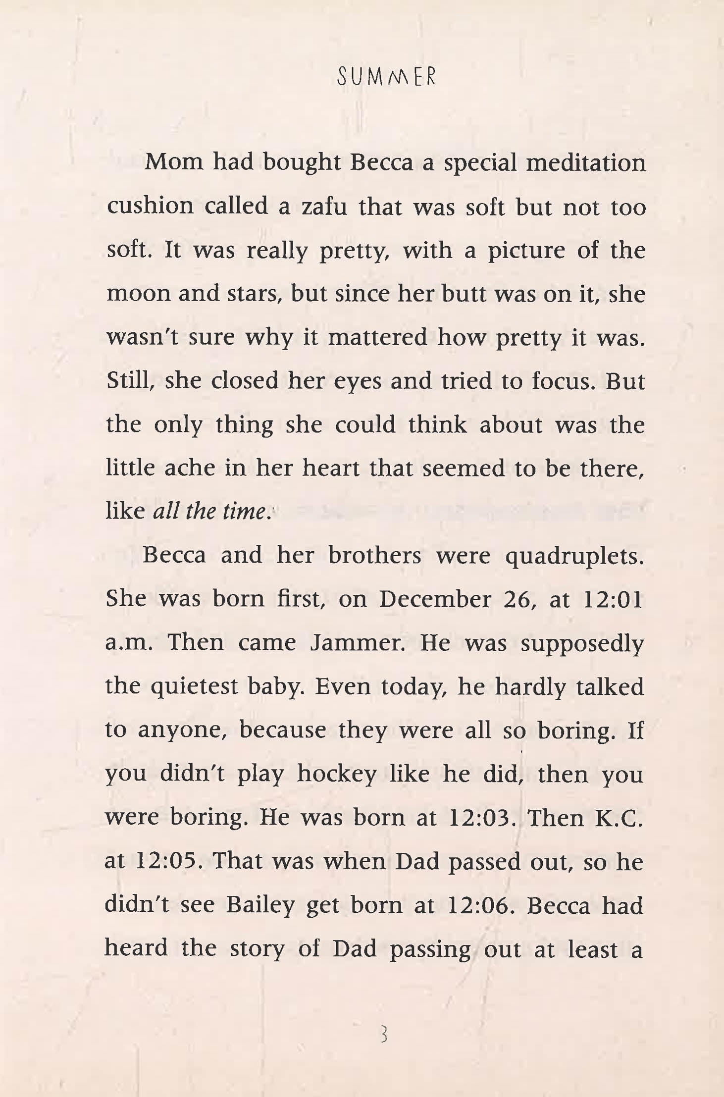 Being a quadruplet can make it hard to stand out from the crowd. Becca’s three brothers all have something that makes them...them. Jake has his music, Jammer plays hockey, and K.C. thinks they’re all living in a simulation and doesn’t see the point of doing much of anything. Becca is the only one with nothing to make her special.
