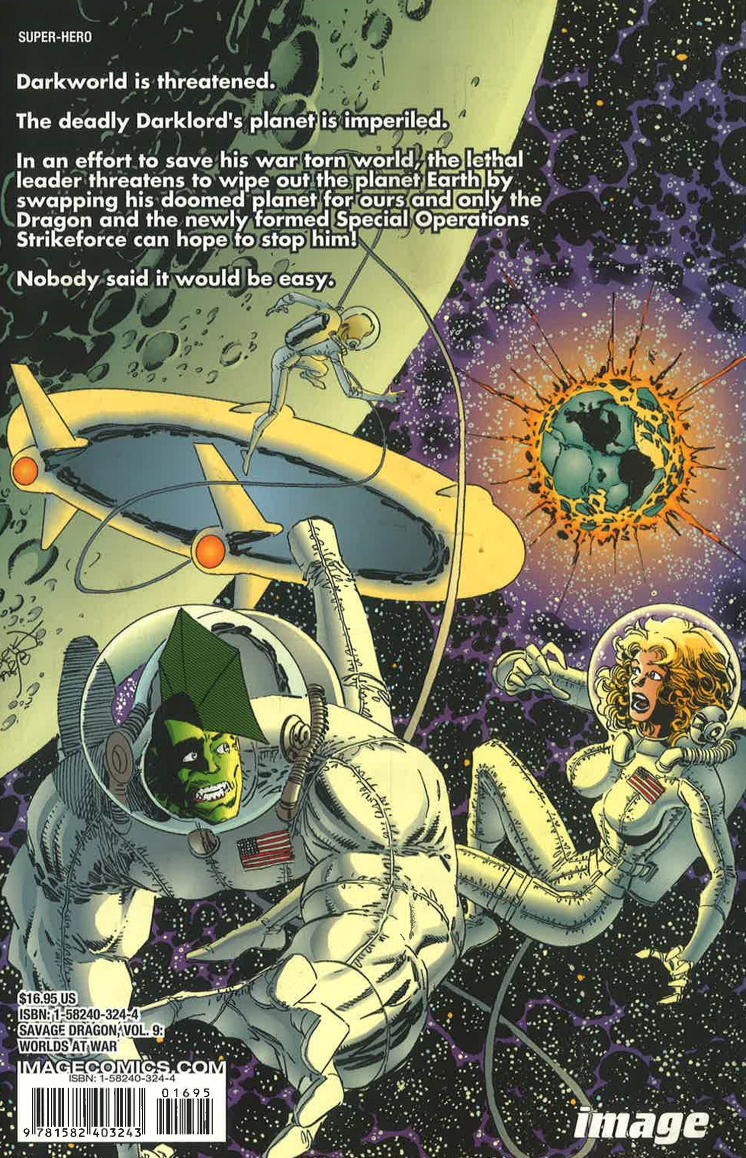 The deadly Darklord threatens to wipe out the planet Earth by swapping his doomed planet for ours and only the Dragon and the newly formed Special Operations Strikeforce can hope to save our imperiled planet! The destruction of a planet hangs in the balance! Plus, the Dragon and Jennifer Murphy travel to Godworld and witness the deadliest battle of all as the legendary God of Thunder, Thor takes on Hercules - and the winner gets Earth! All this and a guest star studded wedding of Barbaric and Ricochet, which included Hellboy, Zot, Bone, Vampirella, Shadowhawk, Flaming Carrot, Cerebus, the DNAgents and a host of others!