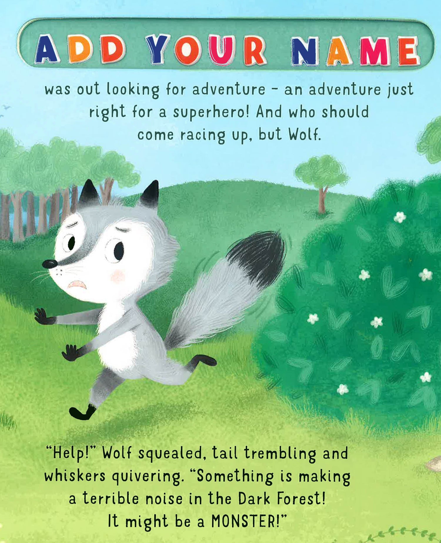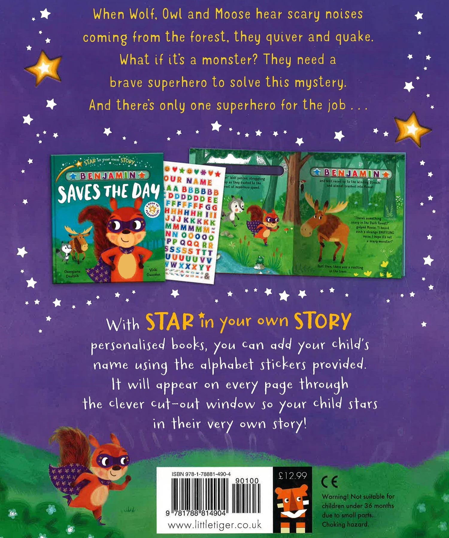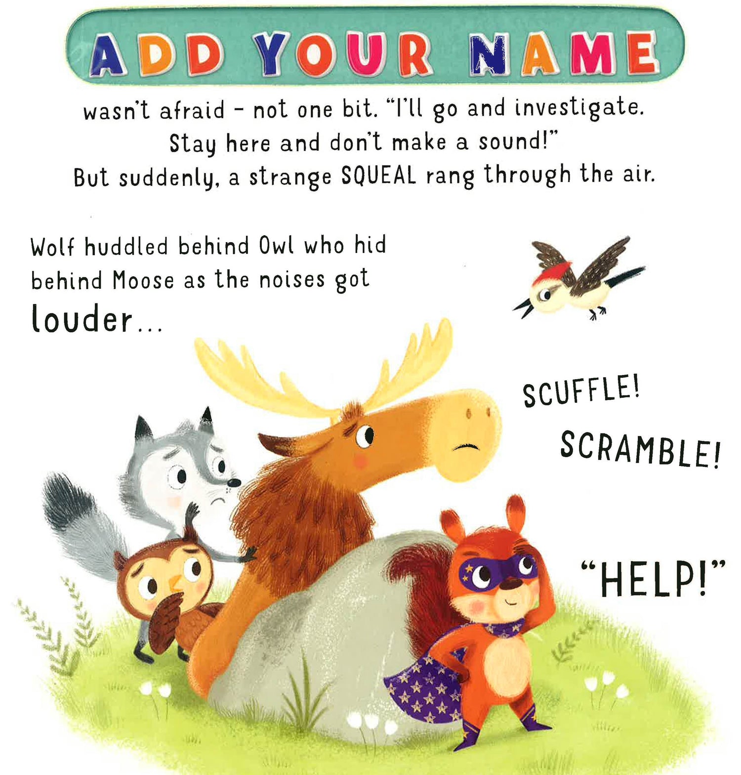 With Star in Your Own Story personalised books, you can add your child's name using the alphabet stickers provided. It will appear on every page through the clever cut-out window so your child stars in their very own story. When Wolf, Owl and Moose hear scary noises coming from the forest, they quiver and quake. What if it's a bear? They need a brave superhero to solve this mystery. And there's only one superhero for the job . . .