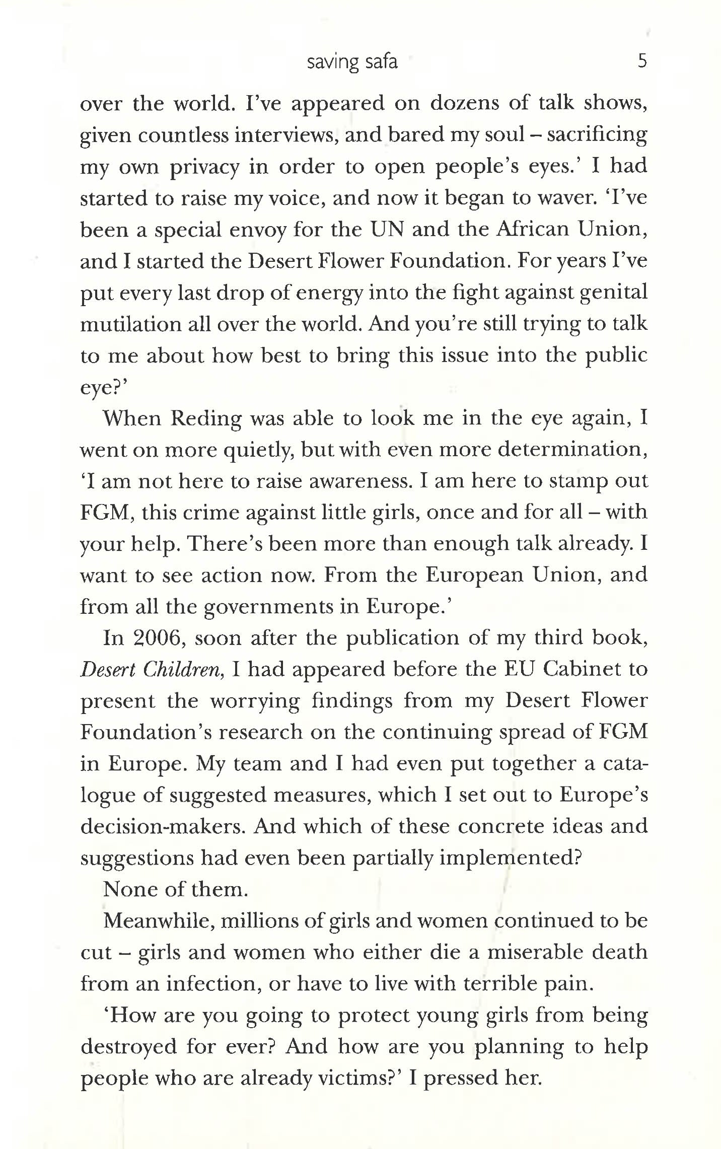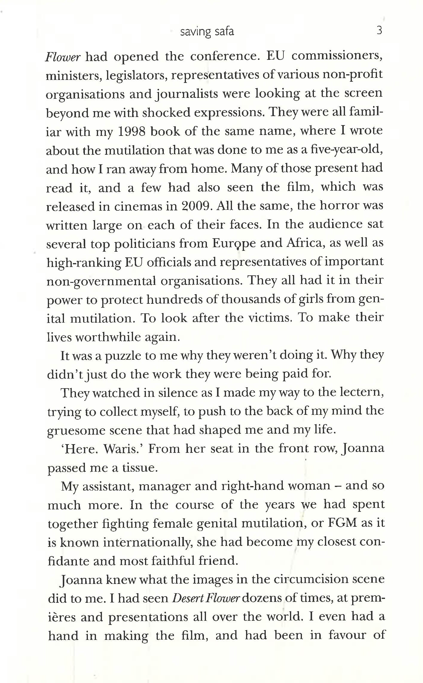 Waris Dirie, the Somalia nomad who became a supermodel, and an anti-FGM activist, first came to the world's attention with the publication of her autobiography, Desert Flower. The book was subsequently made into a film and little Safa Nour, from one of the slums of Djibouti in the Horn of Africa, was chosen to play the young Waris. The book and the film record many extraordinary things - from facing down a tiger, to being discovered by a famous photographer in London - but it also tells the grim story of female circumcision, an ordeal that the young Waris had to endure. Saving Safa opens with a letter from Safa, now aged seven, who explains that she is worried that she will undergo FGM in spite of the contract her parents have signed with Dirie's Desert Flower Foundation stating that they will never have their daughter cut. Waris drops everything and flies to Djibouti where she meets Safa's father and mother who thinks her daughter should be cut to stop the community ostracising them. As Safa was saved from FGM through a contract with her parents, the Foundation believes a thousand other girls can be saved through providing their families with aid in return for a promise not to mutilate their daughters