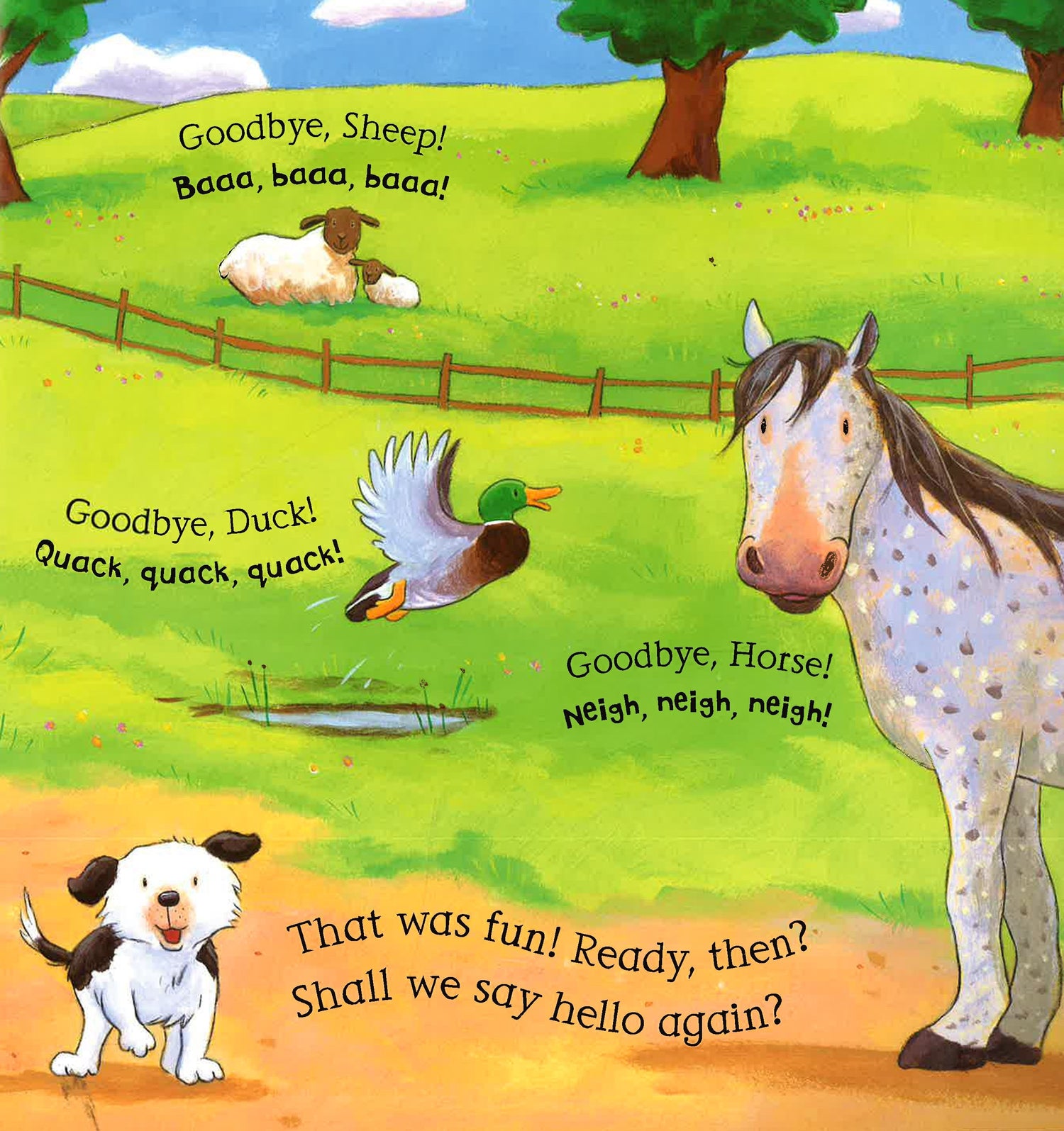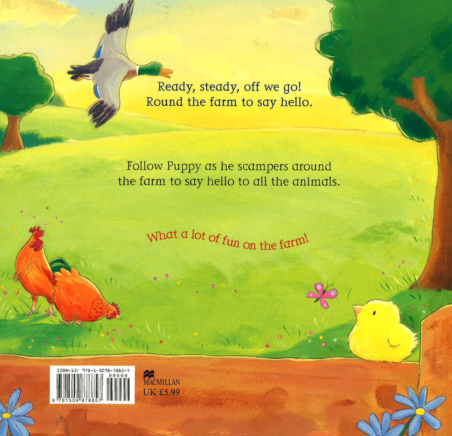 Look who's hiding under those sticks. Say hello to the fluffy chicks. Follow the friendly puppy as he scampers around the farmyard saying hello to all the animals. Toddlers will love the farmyard animals and joining in making their noises.