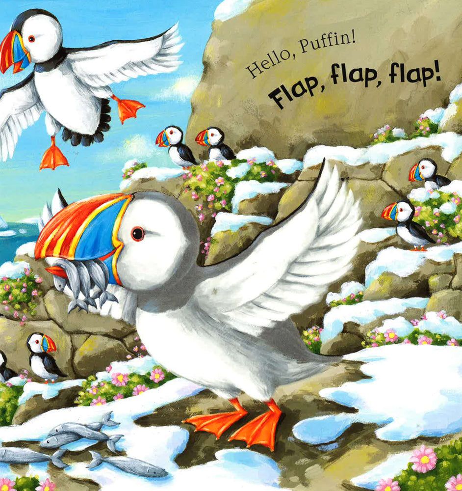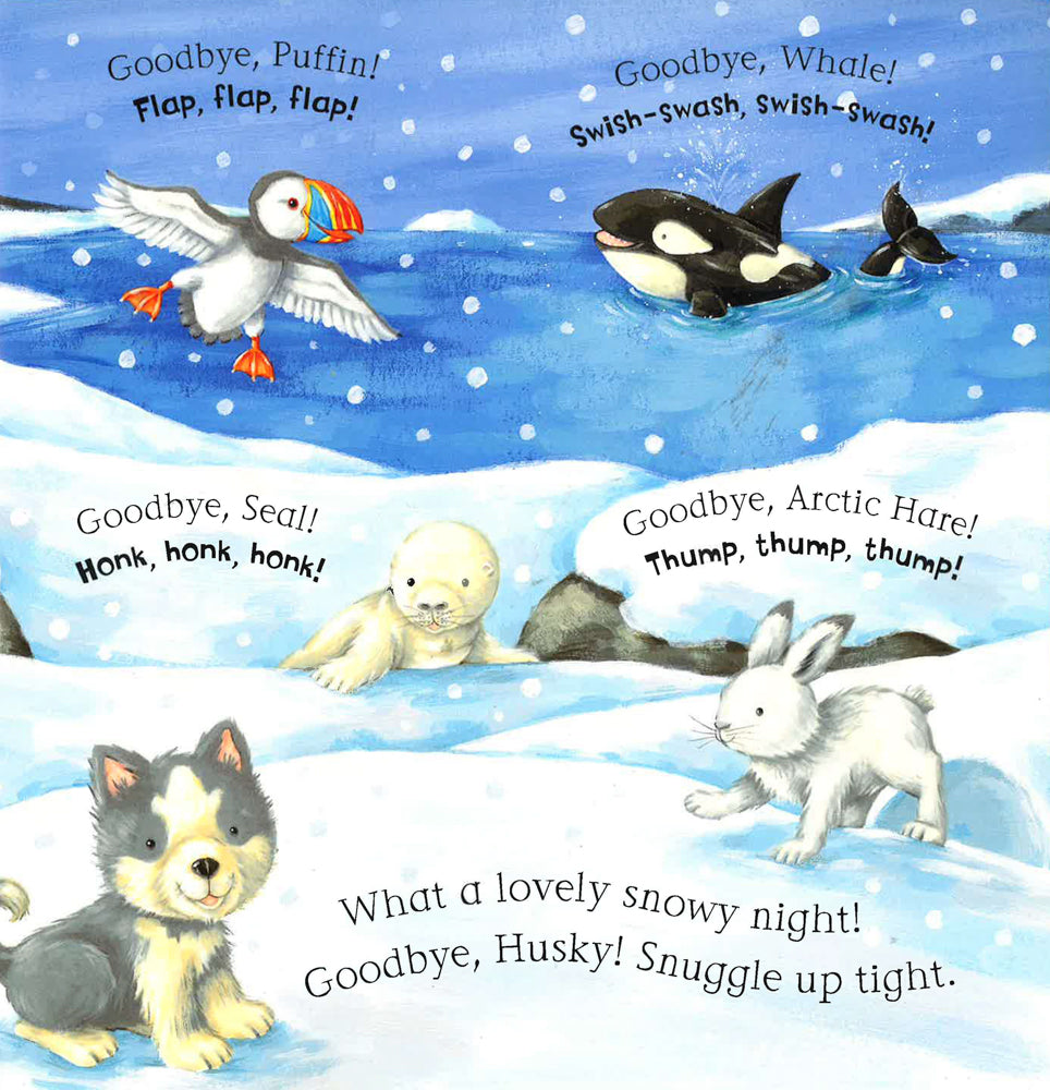Join the little husky as he scampers off on the snow and ice to say hello to all his animal friends. Meet a polar bear, a seal and a caribou too! Toddlers will love to join in calling out the animals` noises as they turn the pages of this beautiful book. The satisfying rhyming text and velvety soft-to-touch animals make this book perfect for young children.