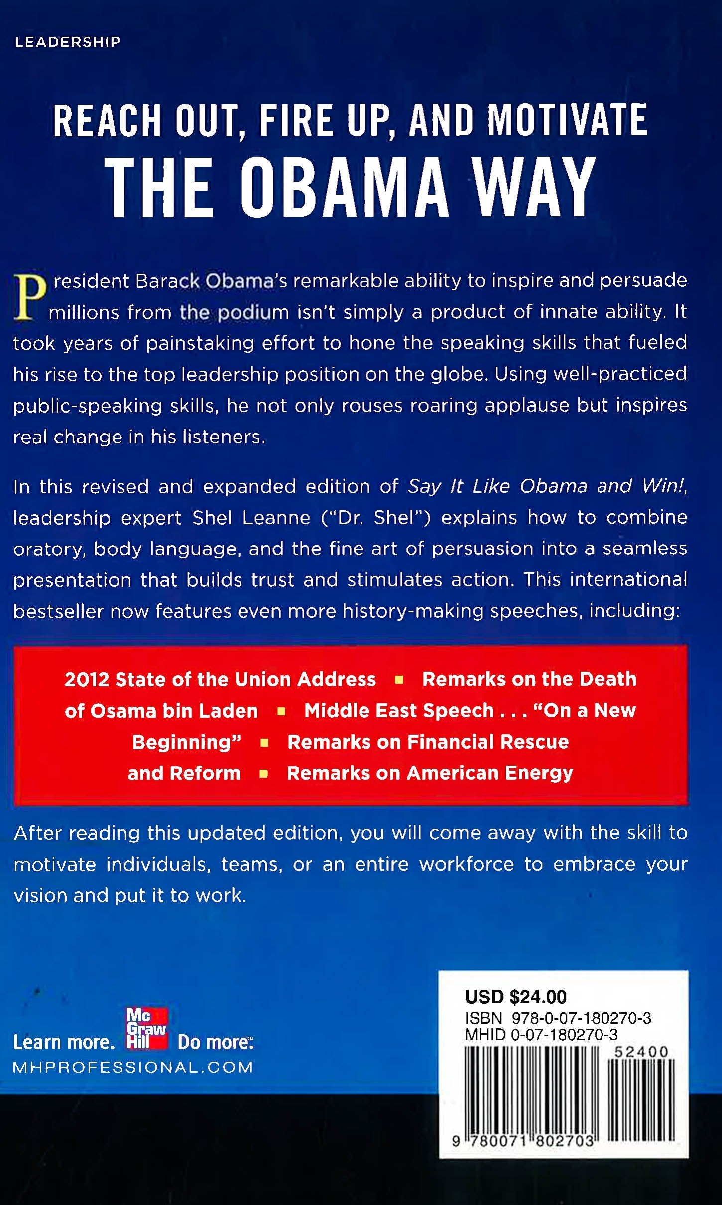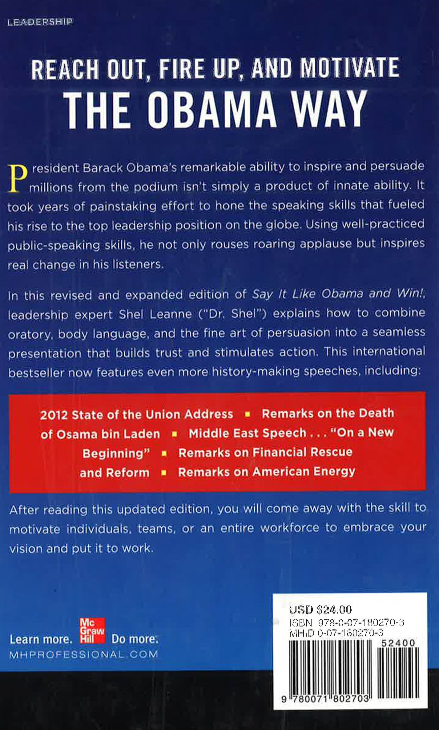 Whether you're a manager, an executive, a public speaker, a business owner, or a community leader, Say It Like Obama and Win! provides you with presentation techniques that have inspired and mobilized audiencesof every size.