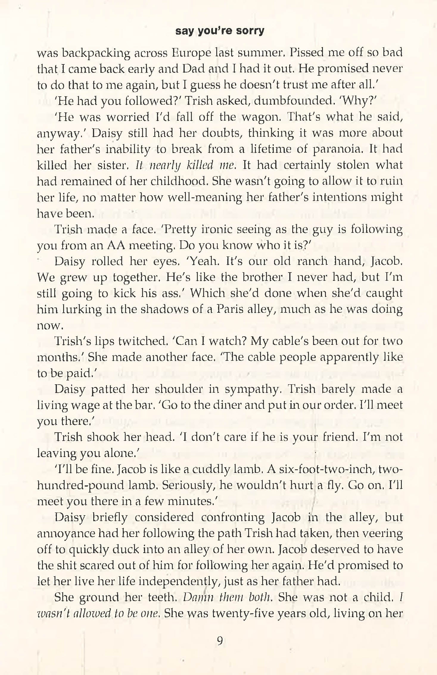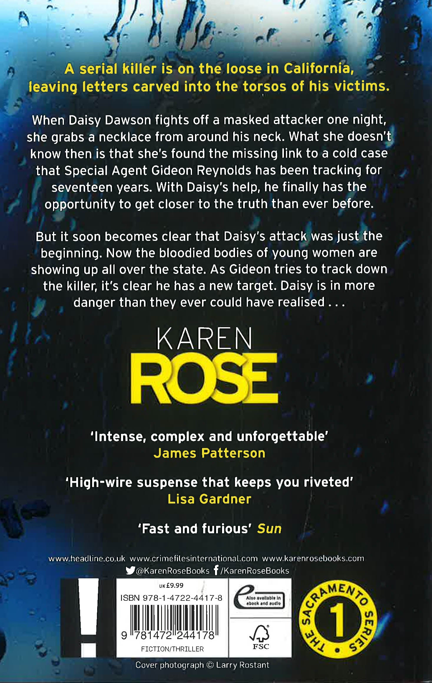When a killer closes in, there's only one way to stay alive. Say You're Sorry is the gripping first book in a brand new series from Sunday Times bestselling author Karen Rose.A serial killer is on the loose in California, leaving letters carved into the torsos of his victims.When Daisy Dawson fights off a masked attacker one night, she grabs a necklace from around his neck. What she doesn't know then is that she's found the missing link to a cold case that Special Agent Gideon Reynolds has been tracking for seventeen years. With Daisy's help, he finally has the opportunity to get closer to the truth than ever before. But it soon becomes clear that Daisy's attack was just the beginning. Now the bloodied bodies of young women are showing up all over the state. As Gideon tries to track down the killer, it's clear he has a new target. Daisy is in more danger than they ever could have realised...Praise for KAREN ROSE:'Intense, complex and unforgettable' - James Patterson'A high-octane thrill ride' - Lisa Jackson'Fast and furious' - Sun