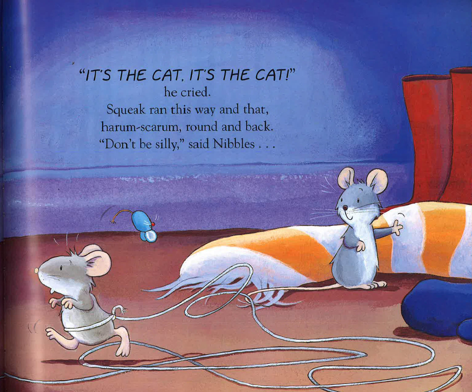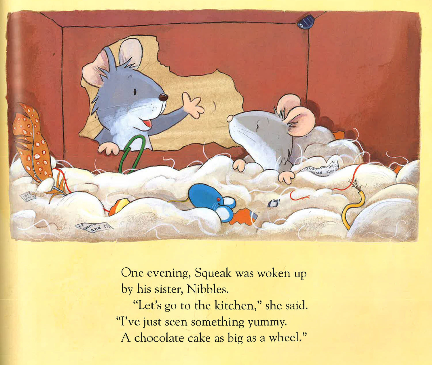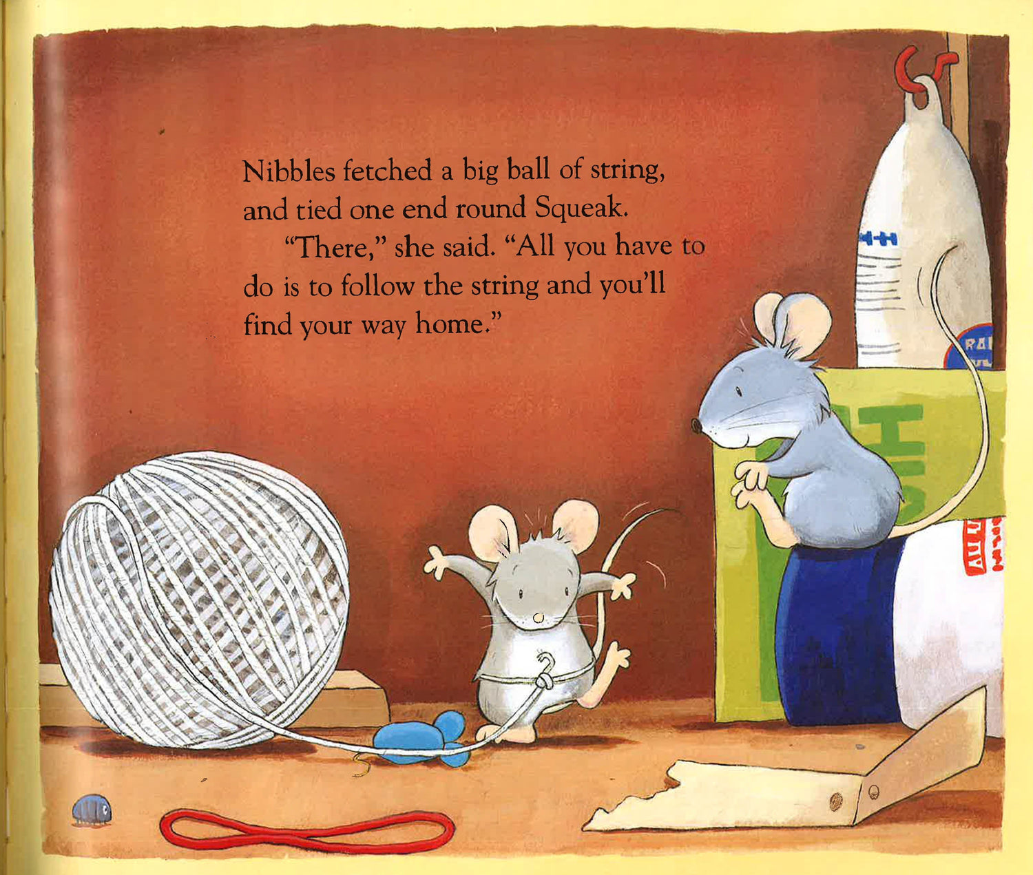 Squeak is a scared mouse, a stay-at-home mouse, until the day he goes out in search of some chocolate cake. But what if he gets lost, or comes face to face with the ginger cat? With a piece of string tied to his tail so that he can find his way home, Squeak sets out into the dark, shadowy hall.
