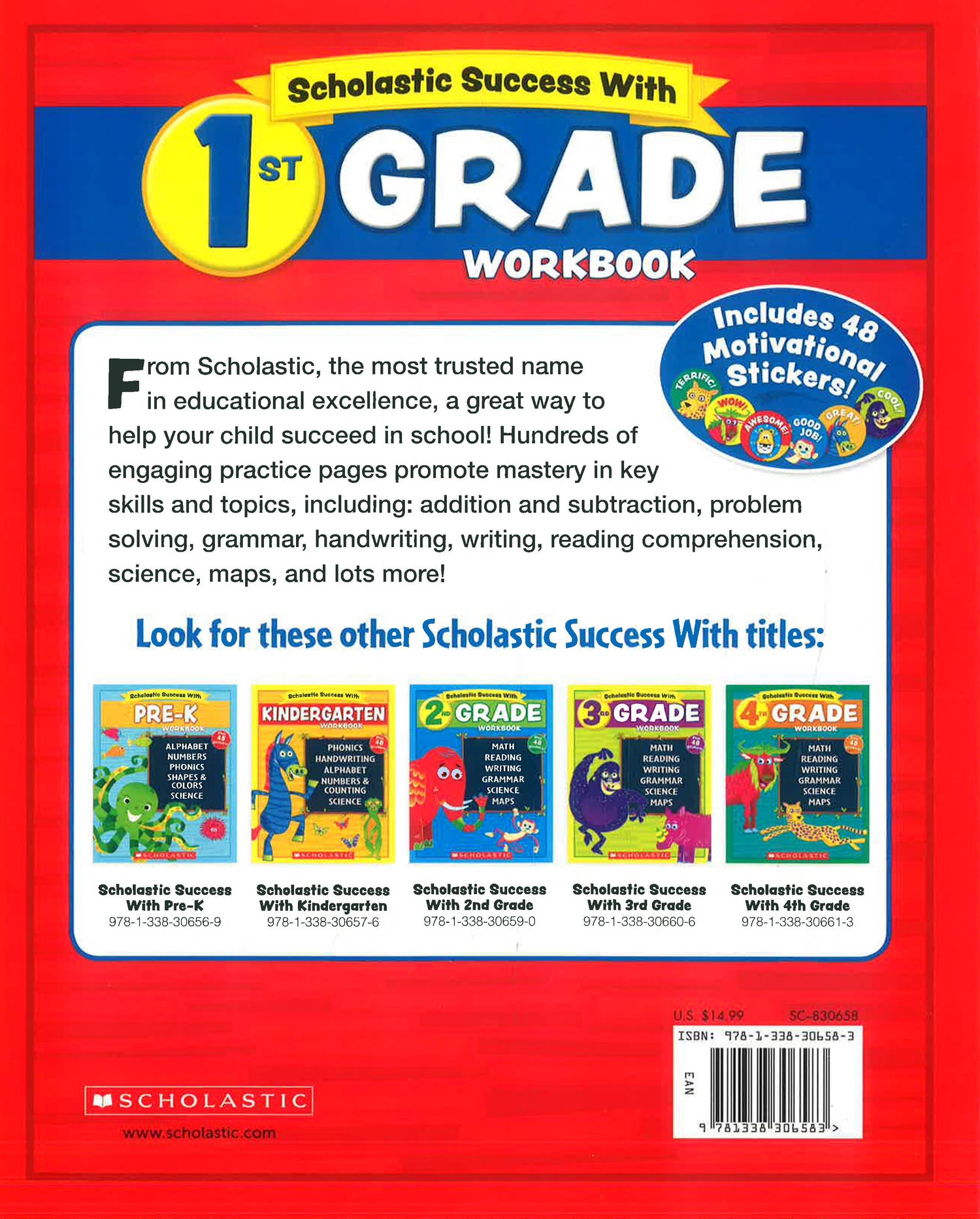 From Scholastic, the most trusted name in educational excellence, here's a great way to help your child succeed in school! This is the latest 2018 Edition which has been updated to include brand new Science content. This 1st Grade Workbook has hundreds of engaging practice pages to promote mastery of key skills and topics, including: the alphabet, numbers and counting, handwriting, phonics, shapes and colors and much more! it also includes 48 motivational stickers!