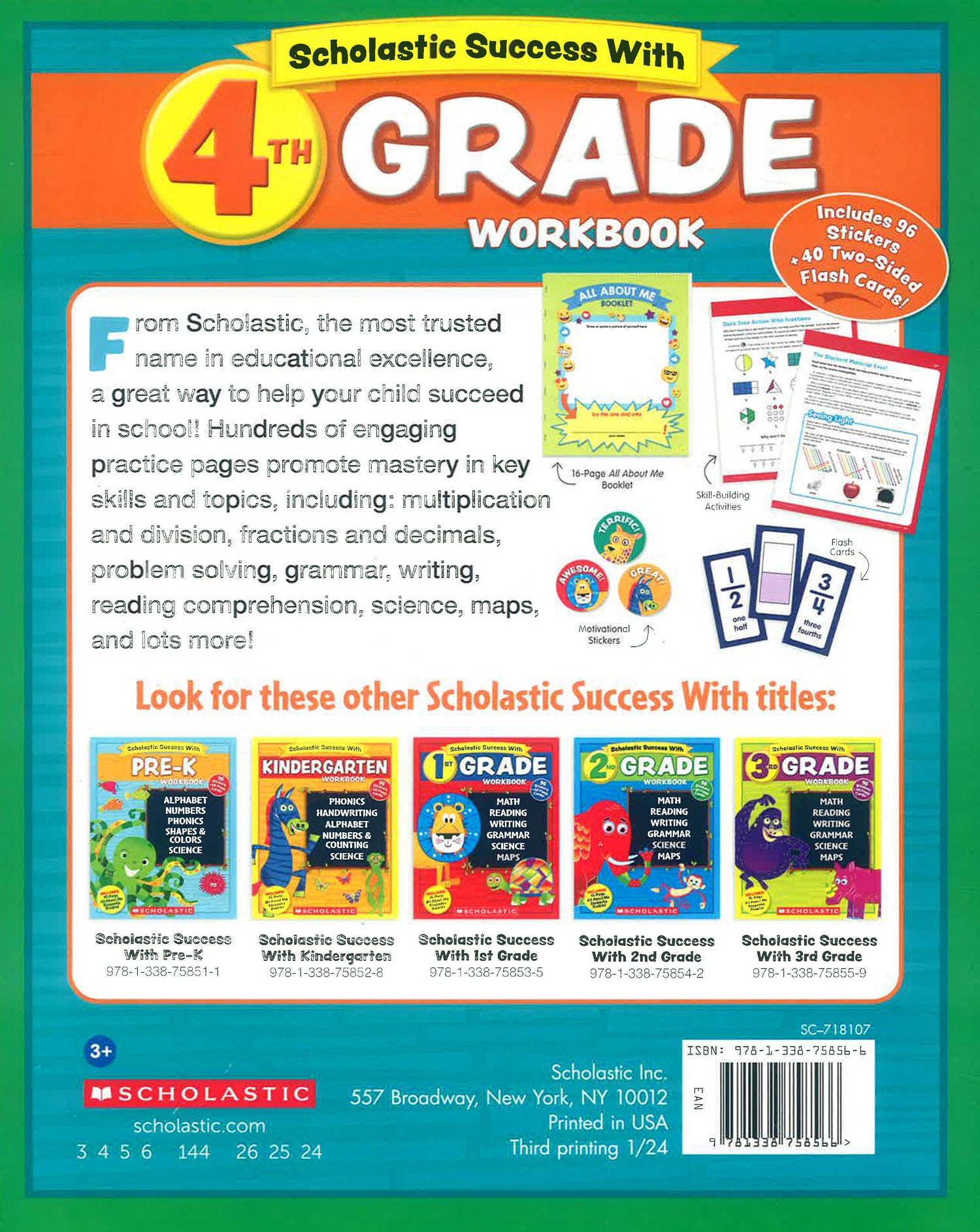 From Scholastic, the most trusted name in educational excellence, a great way to help your child succeed in school! Hundreds of engaging practice pages promote mastery in key skills and topics, including: multiplication and division, fractions and decimals, problem solving, grammar, writing, reading comprehension, science, maps, and lots more!