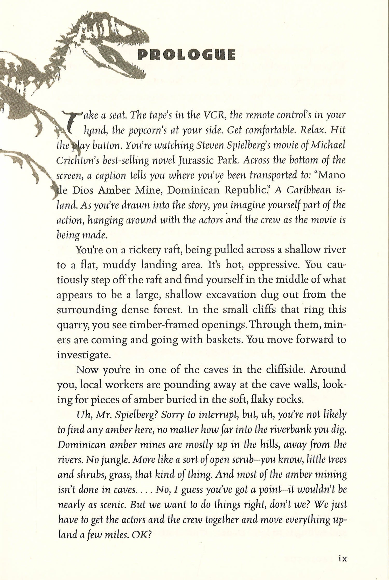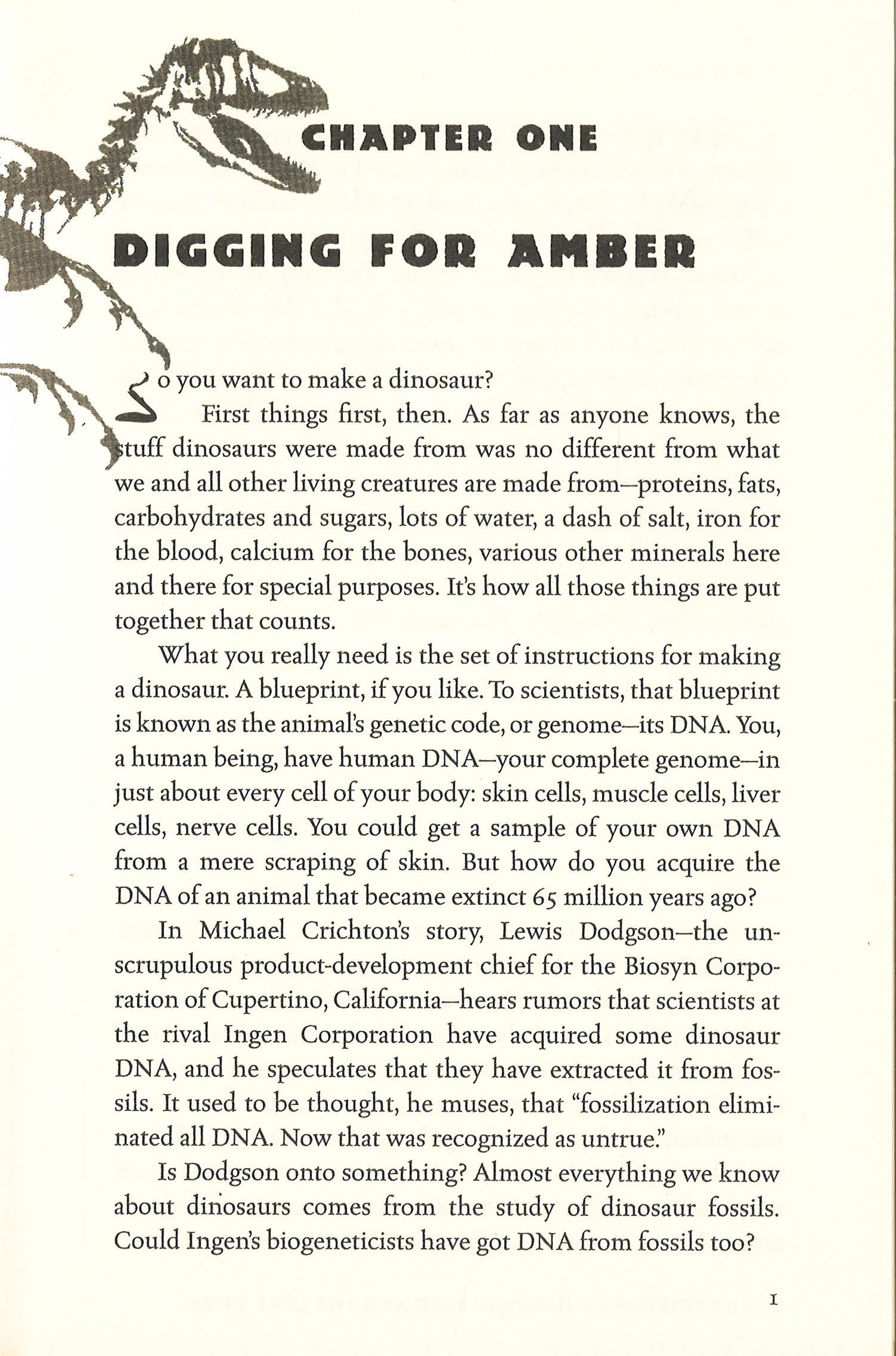 Discussing the scientific ideas behind the book and film "Jurassic Park", this text considers whether modern scientists could extract DNA from an insect, preserved in amber, that had bitten a dinosaur 85 million years ago and use it to clone a dinosaur.