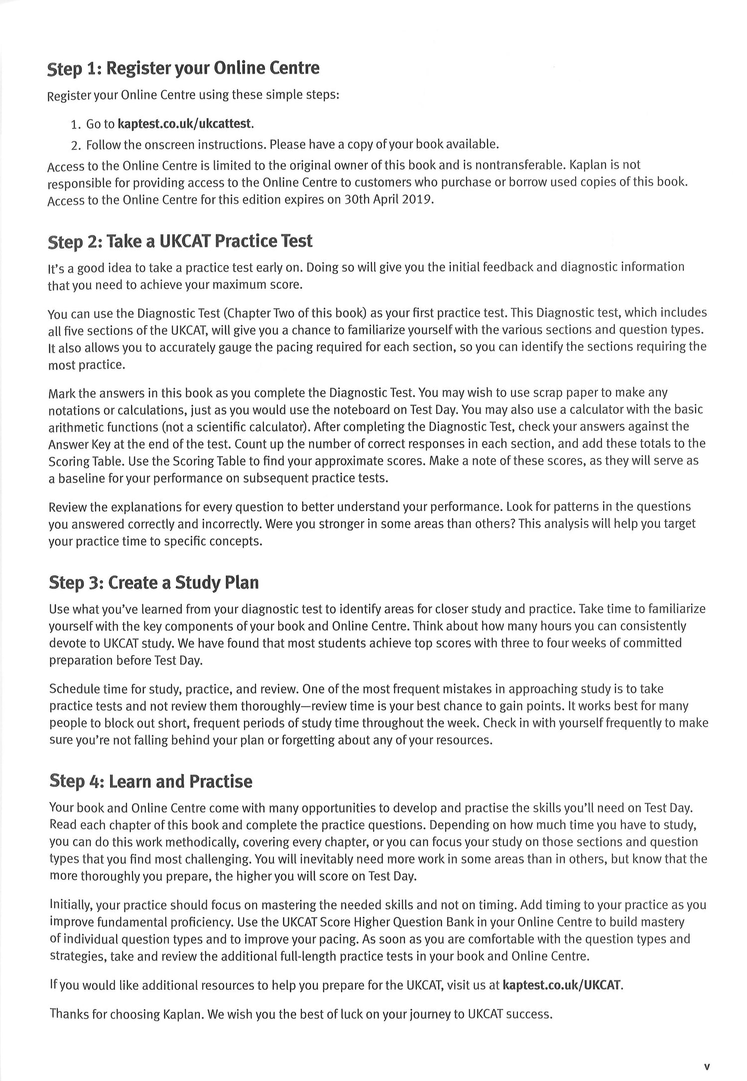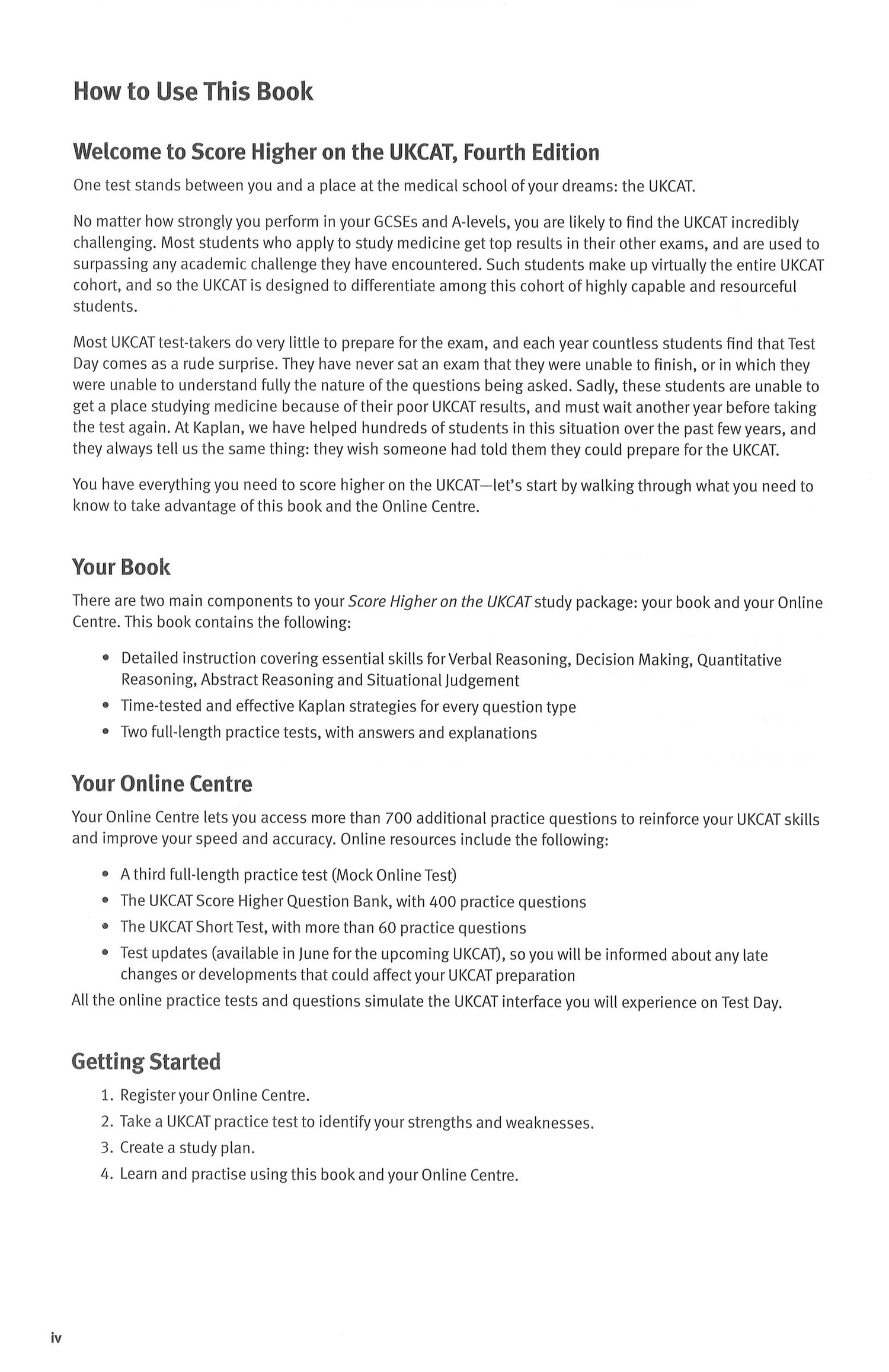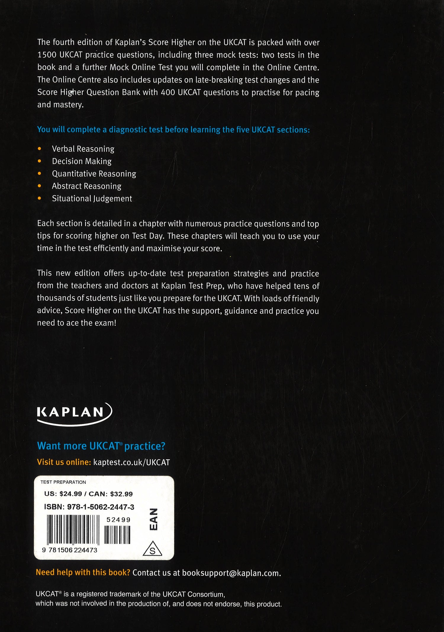 The Expert Guide from Kaplan-Updated for 2019 EntryThe Expert Guide from Kaplan for 2019 entry One test stands between you and a place at the medical school of your dreams: the UKCAT. With 1,500 questions, test-like practice exams, a question bank, and online test updates, Kaplan's Score Higher on the UKCAT, 4th edition, will help build your confidence and make sure you achieve a high score. We know it's crucial that you go into your UKCAT exam equipped with the most up-to-date information available. Score Higher on the UKCAT comes with access to additional online resources, including any recent exam changes, hundreds of questions, an online question bank, and a mock online test with full worked answers to ensure that there are no surprises waiting for you on Test Day.The Most Practice1,500 questions in the book and online-more than any other UKCAT bookThree full-length tests - one mock online test helps you practise for speed and accuracy in a test-like interface and two tests with worked answers in the bookOnline question bank to fine-tune and master your performance on specific question typesExpert GuidanceThe authors of Score Higher on the UKCAT have helped thousands of students prepare for the exam. They offer invaluable tips and strategies for every section of the test, helping you to avoid the common pitfalls that trip up other UKCAT students.We invented test preparation-Kaplan (www.kaptest.co.uk) has been helping students for 80 years. Our proven strategies have helped legions of students achieve their dreams.
