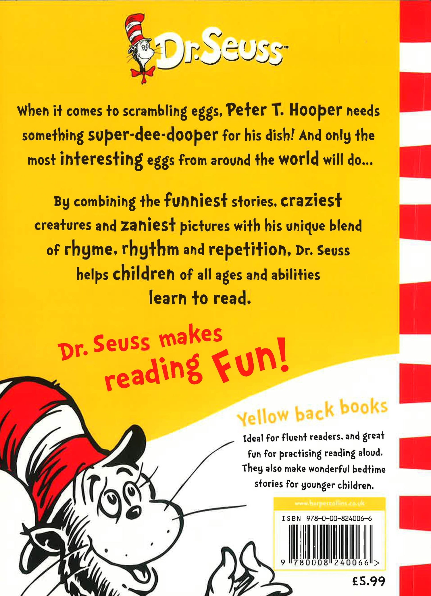 When it comes to scrambling eggs, Peter T. Hooper needs something super special for his super-dee-dooper dish! And only the most interesting and exciting eggs from around the world will do... Peter T. Hooper needs an extraordinary list of eggs for his special omlette...The list of ingredients includes eggs of the Stroodel, whose sort of a stork but with fur like a poodle, and of the moth-watching Sneth - a bird who's so big she scares people to death!Follow him on his zany journey in this Dr. Seuss classic. As part of a major rebrand programme, HarperCollins is relaunching Dr. Seuss's bestselling books, including such perennial favourites as The Cat in the Hat, Green Eggs and Ham and Fox in Socks. In response to consumer demand, the bright new cover designs incorporate much needed guidance on reading levels, with the standard paperbacks divided into three reading strands - Blue Back Books for parents to share with young children, Green Back Books for budding readers to tackle on their own, and Yellow Back Books for older, more fluent readers to enjoy. Scrambled Eggs Super! belongs to the Yellow Back Books range.
