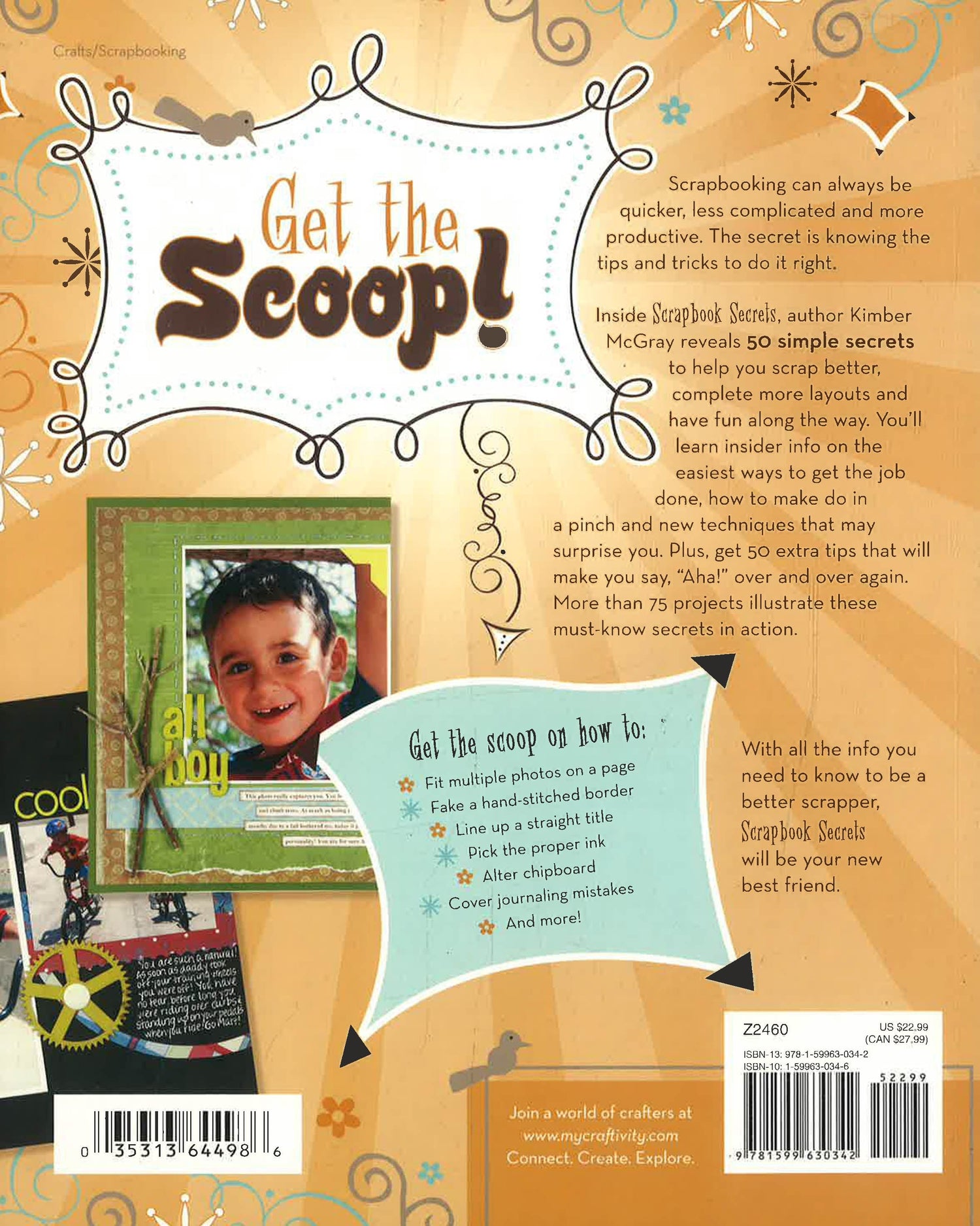 Inside Scrapbook Secrets, author Kimber McGray reveals 50 simple secrets to help you scrap better, complete more layouts and have fun along the way. You'll learn insider info on the easiest ways to get the job done, how to make do in a pinch and new techniques that may surprise you. Plus, get 50 extra tips that will make you say "Aha!" over and over again. More than 75 projects illustrate these must-know secrets in action.