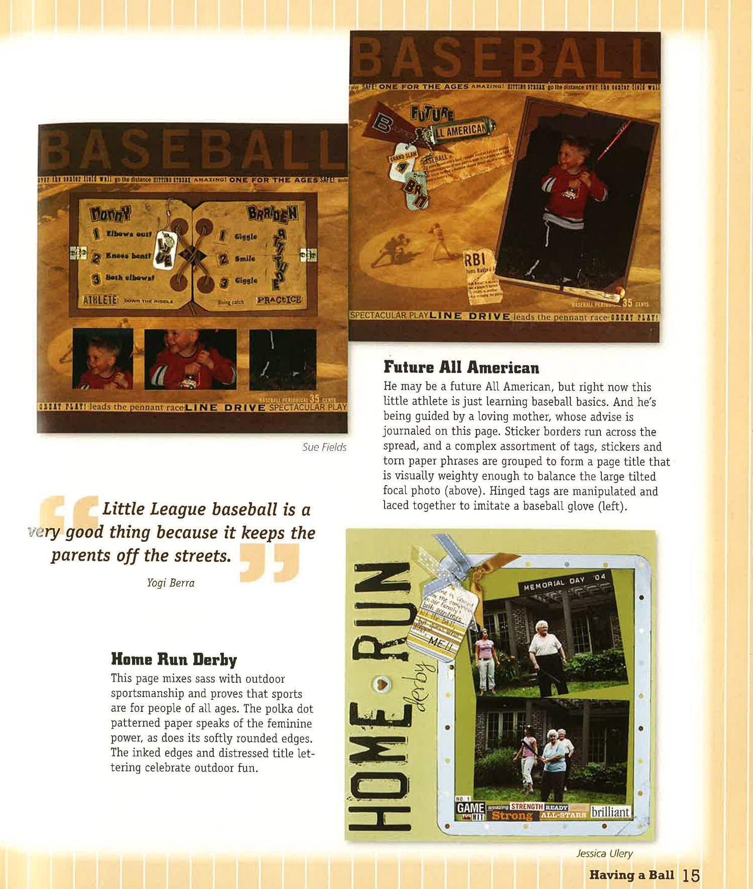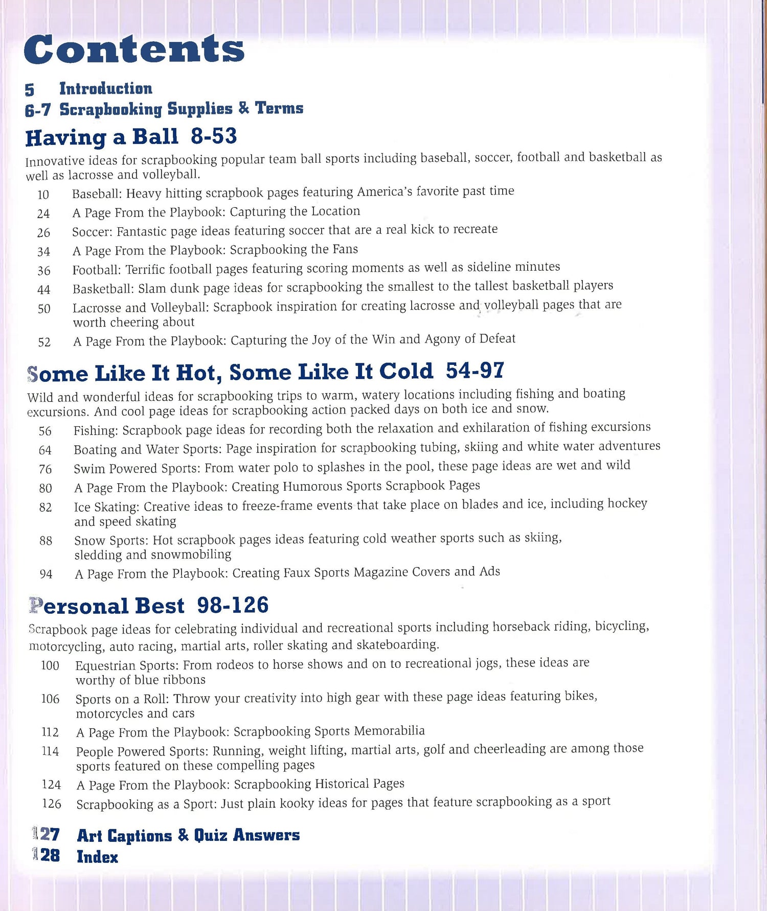 Whether it's a picture of a child's sports tournament or a photograph of a World Series showdown, show off your treasured snaps in an exciting scrapbook. With these super ideas for displaying everything from action shots and athletes' portraits to memorabilia, sports fans can jump right on in and get creative. Eye-catching layouts show how to commemorate a game's high points and play with football, baseball and basketball images or how to capture the thrill of tennis, gymnastics and martial arts. Plus, try the fun suggestions for getting wet and wild with photographs of various water sports - even snorkelling and scuba diving.
