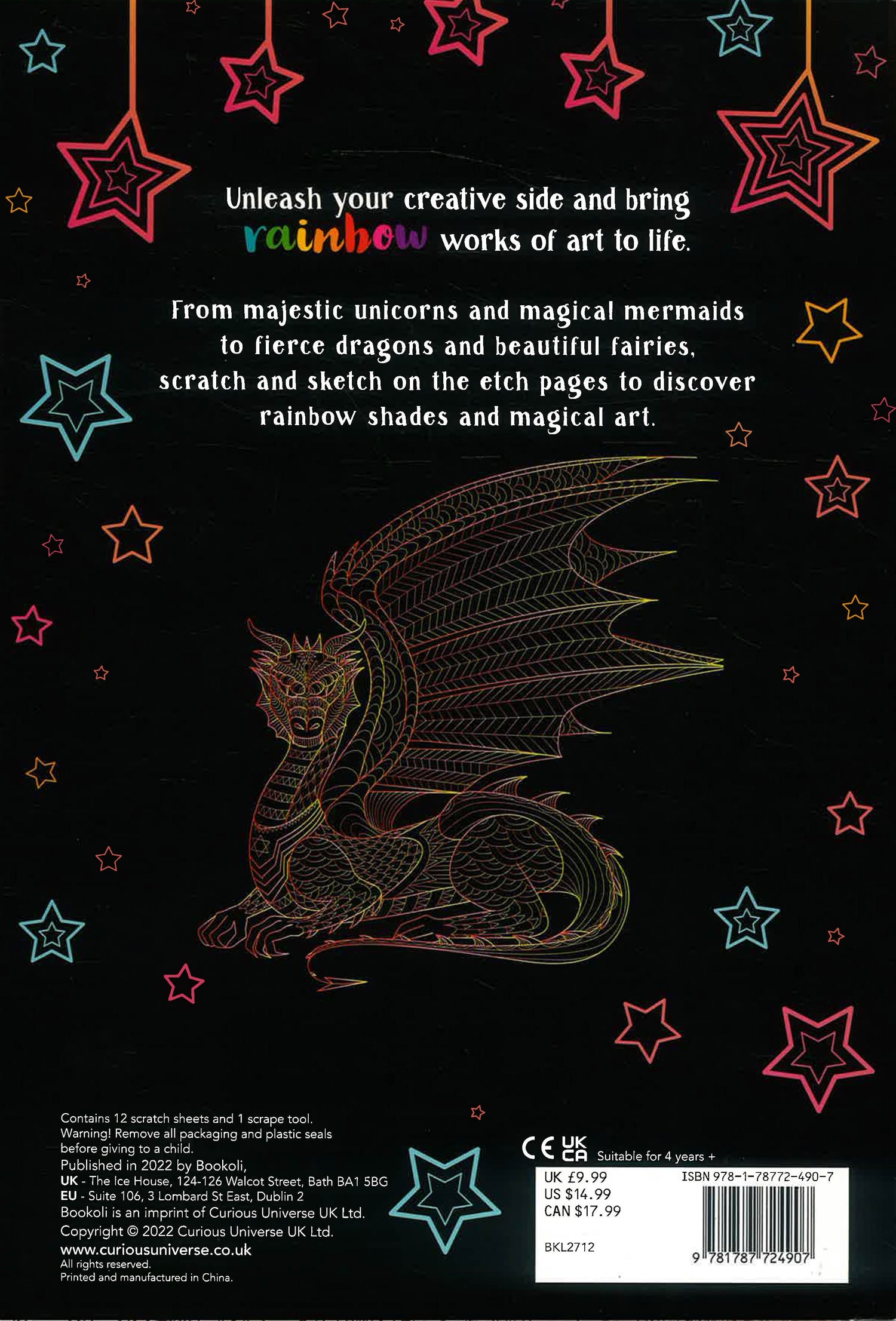 Unleash your creative side and bring rainbow works of art to life. From beautiful butterflies and cute pandas to fierce dragons and majestic unicorns, scratch and sketch on each page to discover rainbow shades and hidden magic. Includes a scrape tool to help you create your etch masterpieces, plus creative tips on mark-making and pattern design.