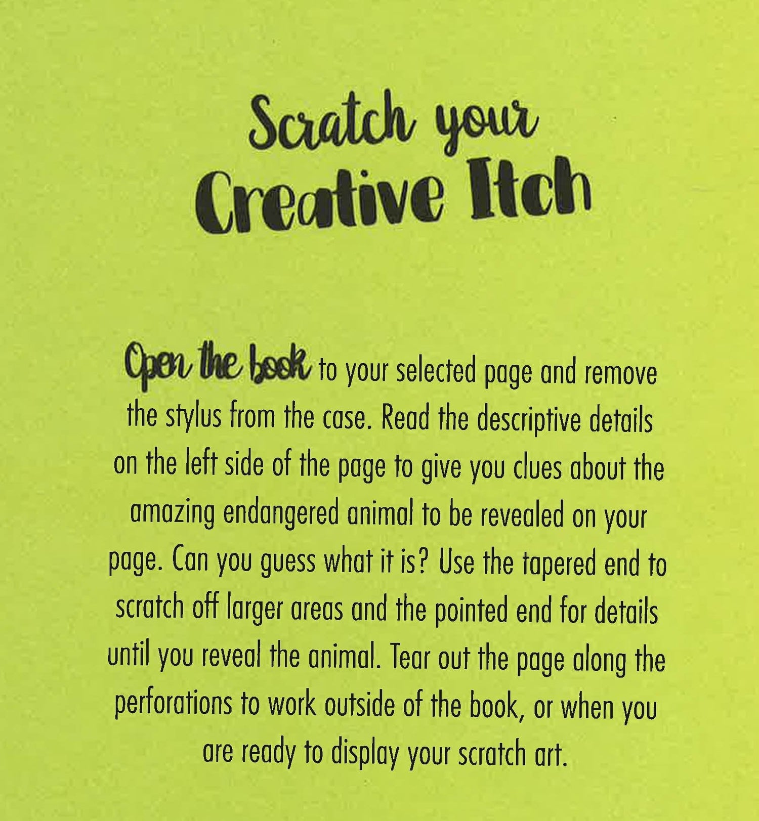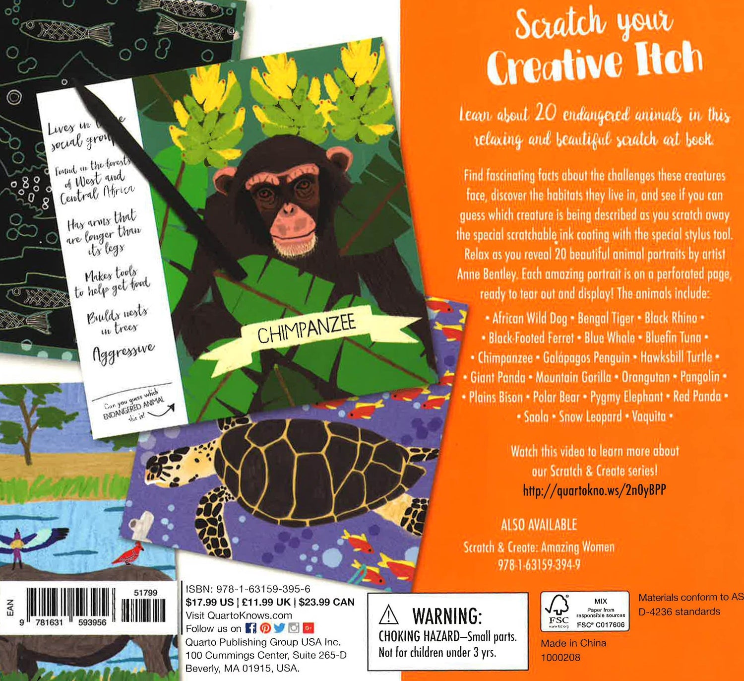 Learn about 20 endangered animals in this relaxing and beautiful scratch art book. Read fascinating facts about their challenges and habitats and see if you can guess which creature they describe as you scratch away the metallic coating to reveal 20 beautiful animal portraits by the arist, Anne Bentley. Each of the amazing animal portraits are on perforated pages, ready to tear out and display!