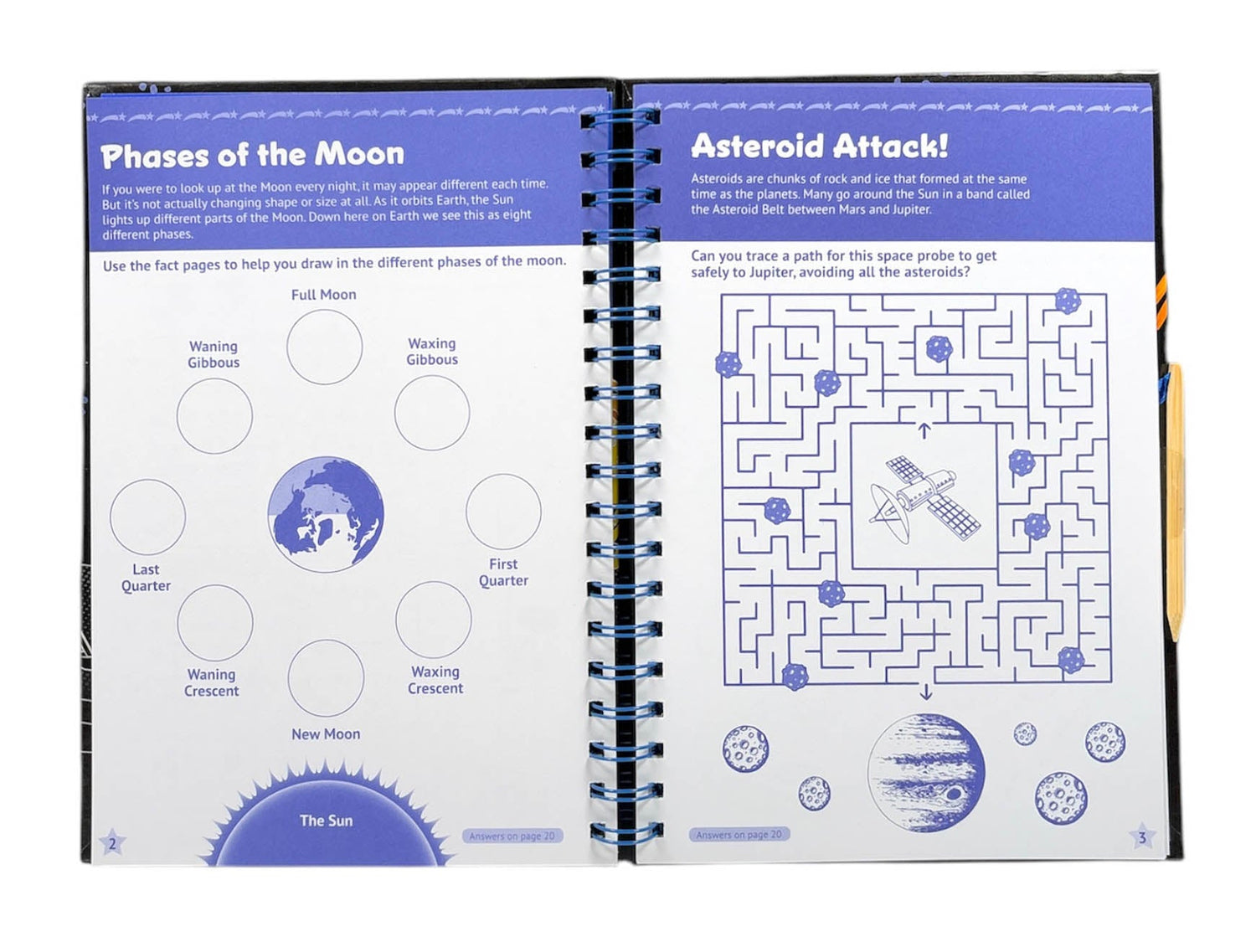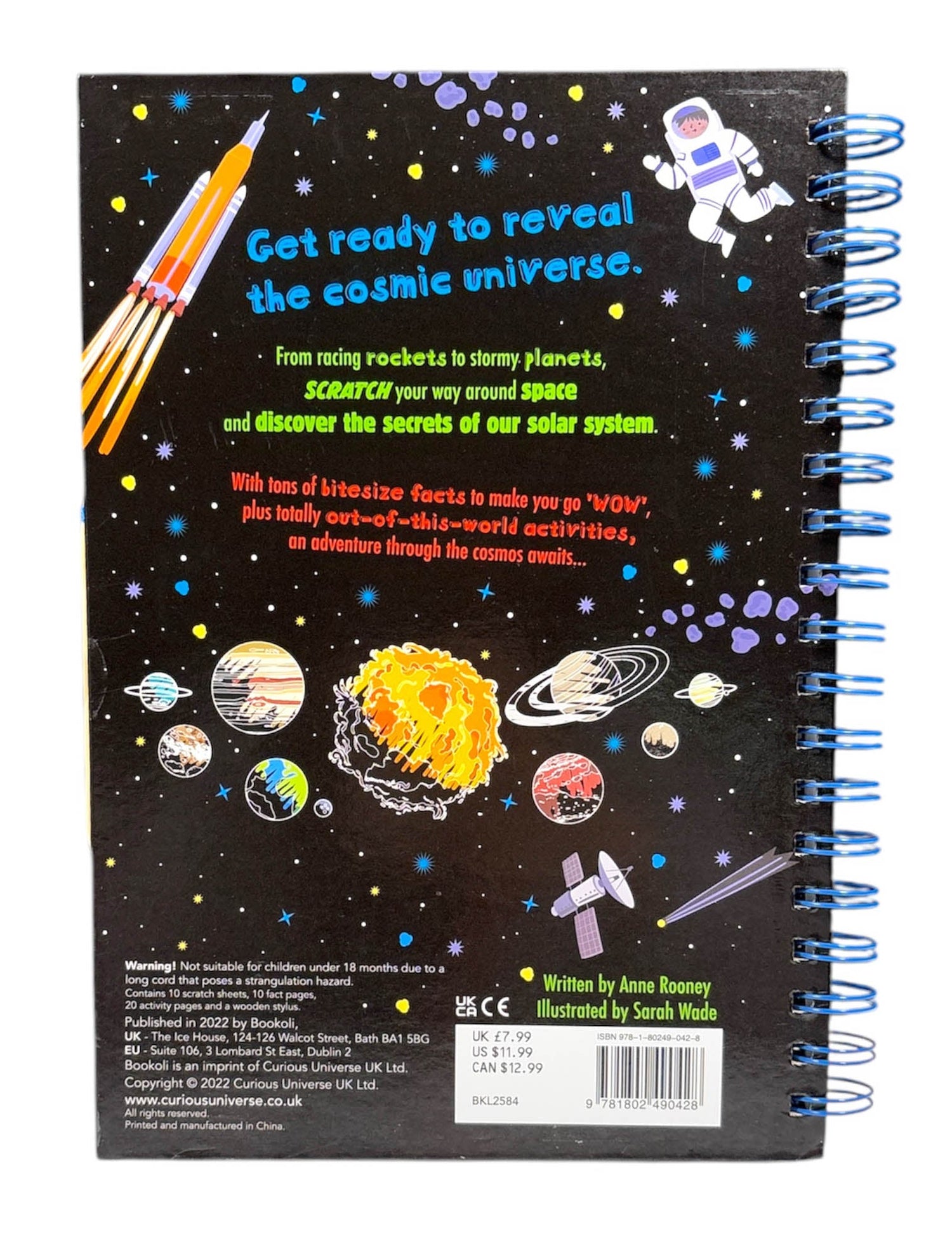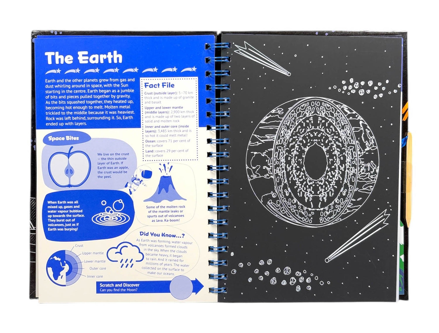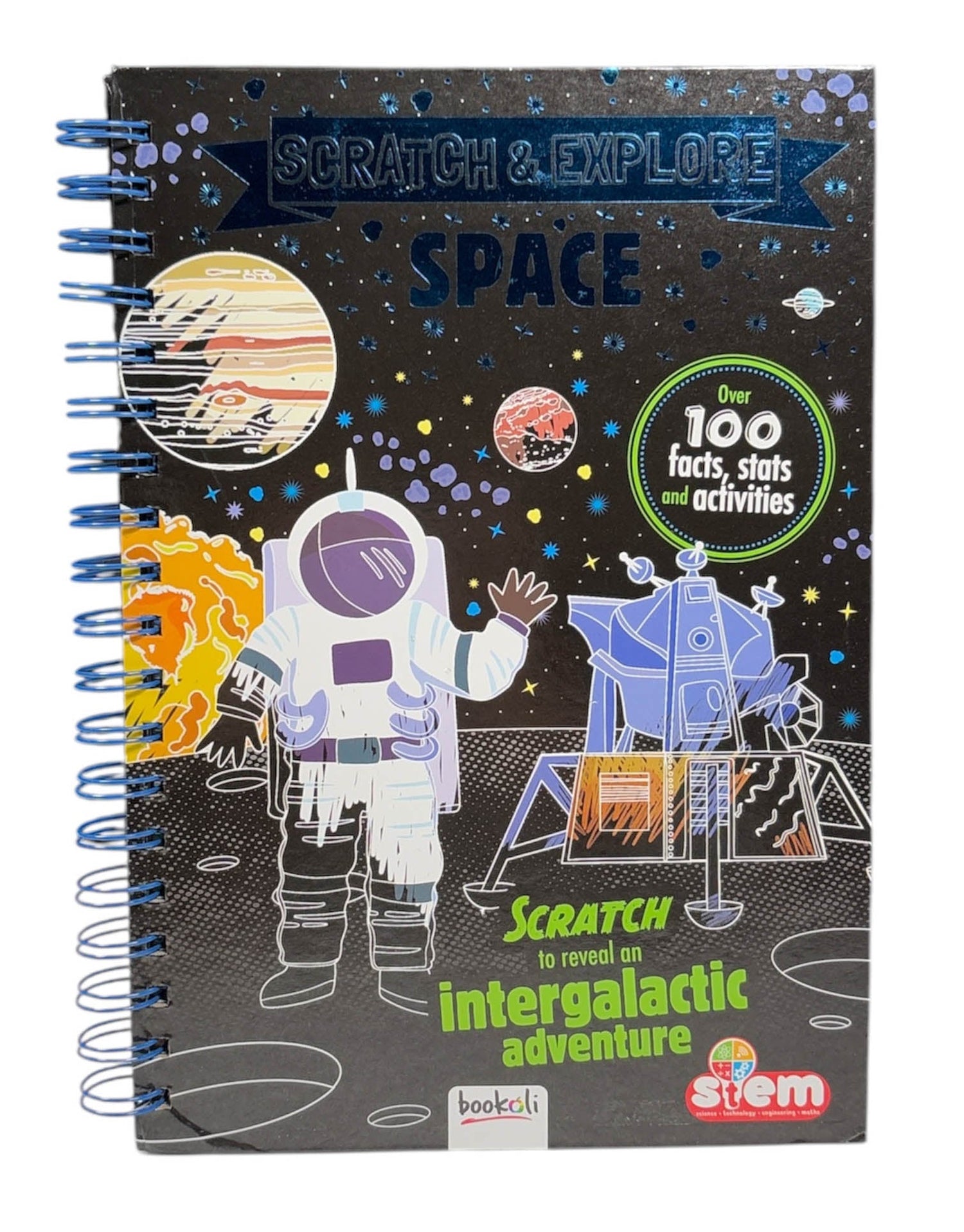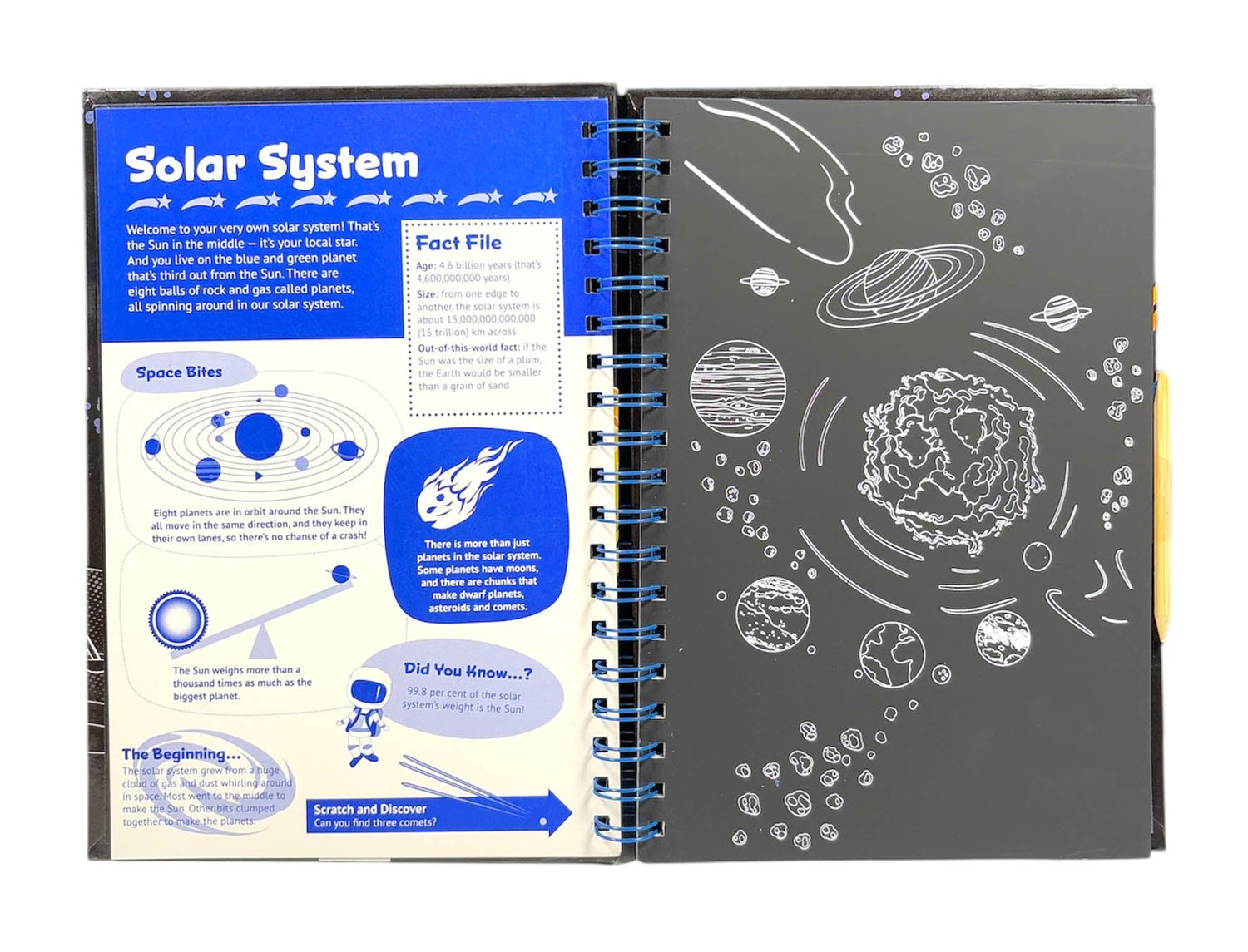 This book contains 10 outer space scratch pictures that you can customise with your stylus to reveal bright colours hiding underneath the scratch ink. Then, on the back of each scratch picture is a page full of interesting facts about the outer space scenes featured in the book, from the moon landing to ISS in space there's so much to learn!