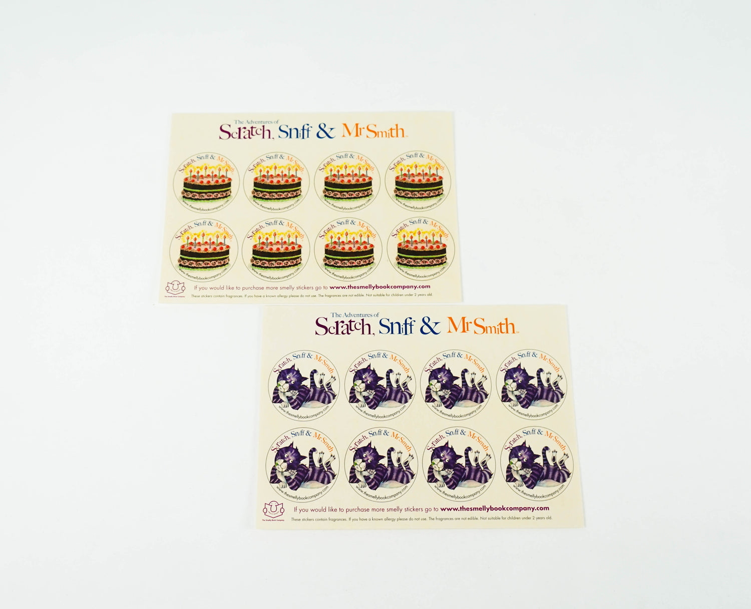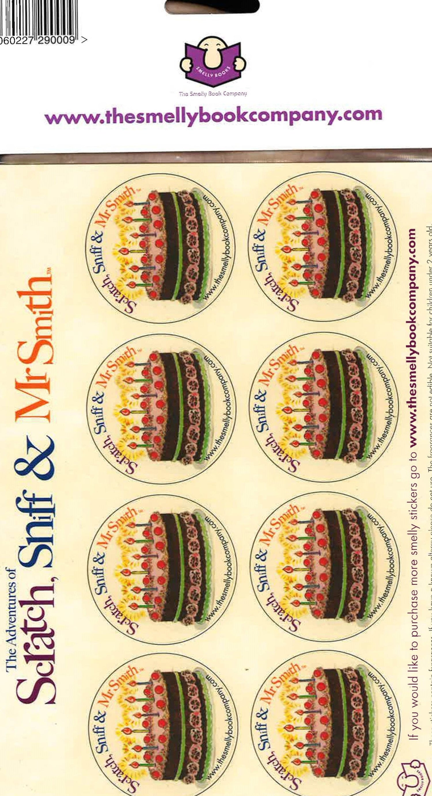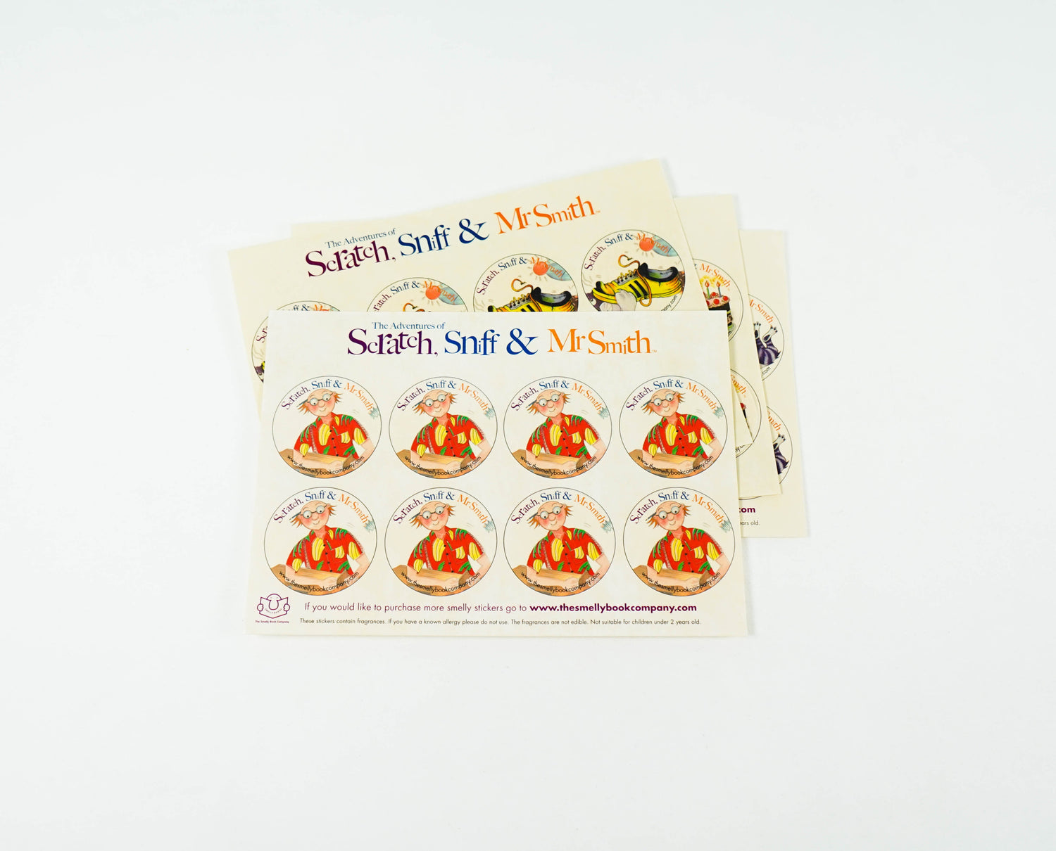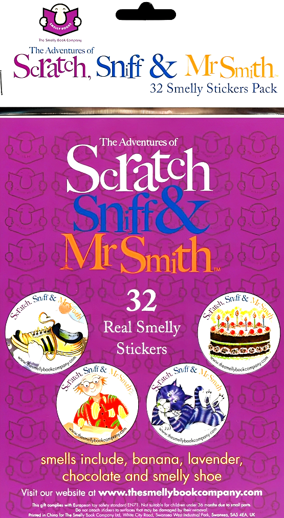The Advetures of Scratch, Sniff & Mr Smith , 32 smelly stickers Pack, Smells include , banana, lavender, chocolate and smelly shoe.