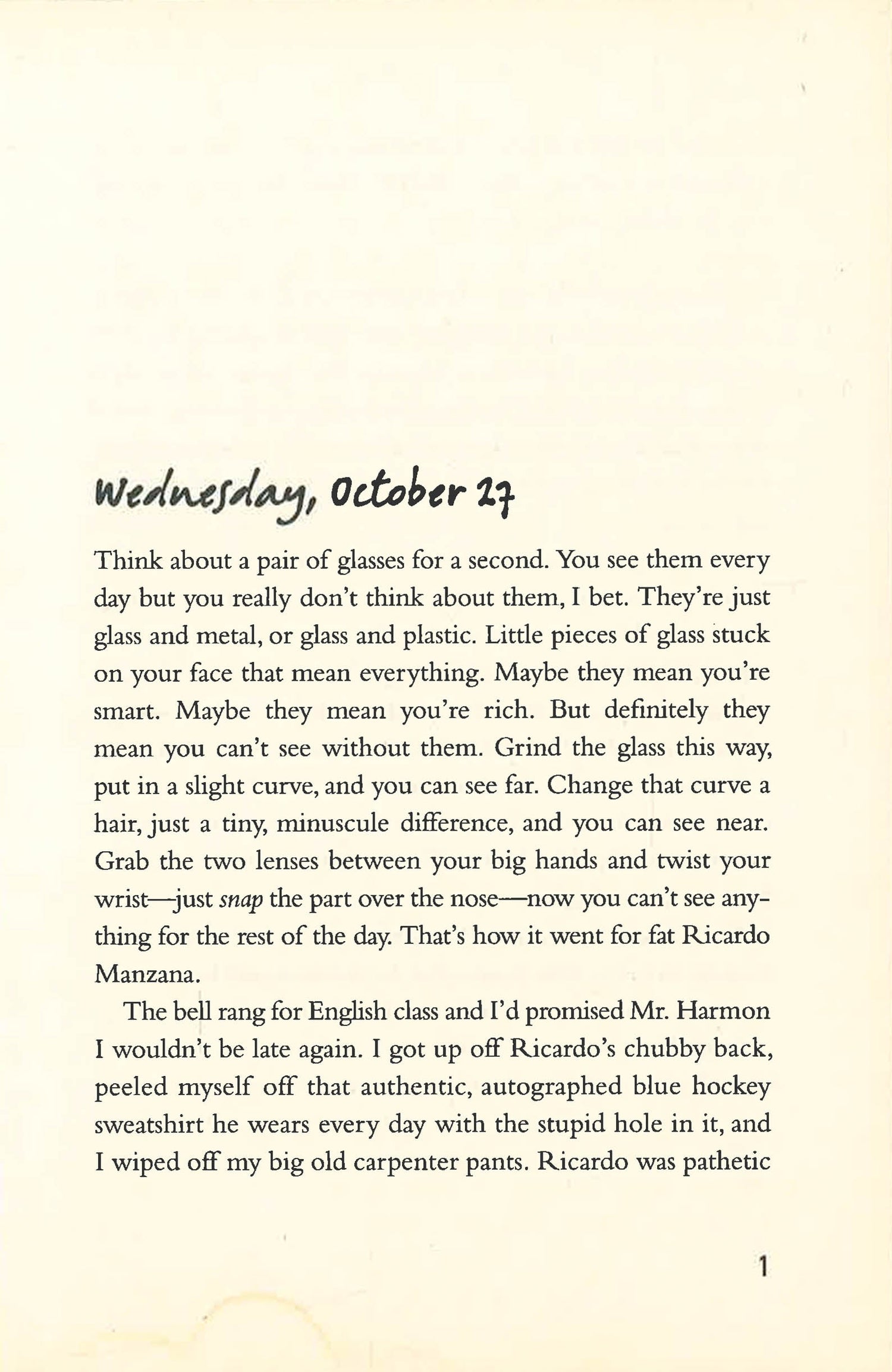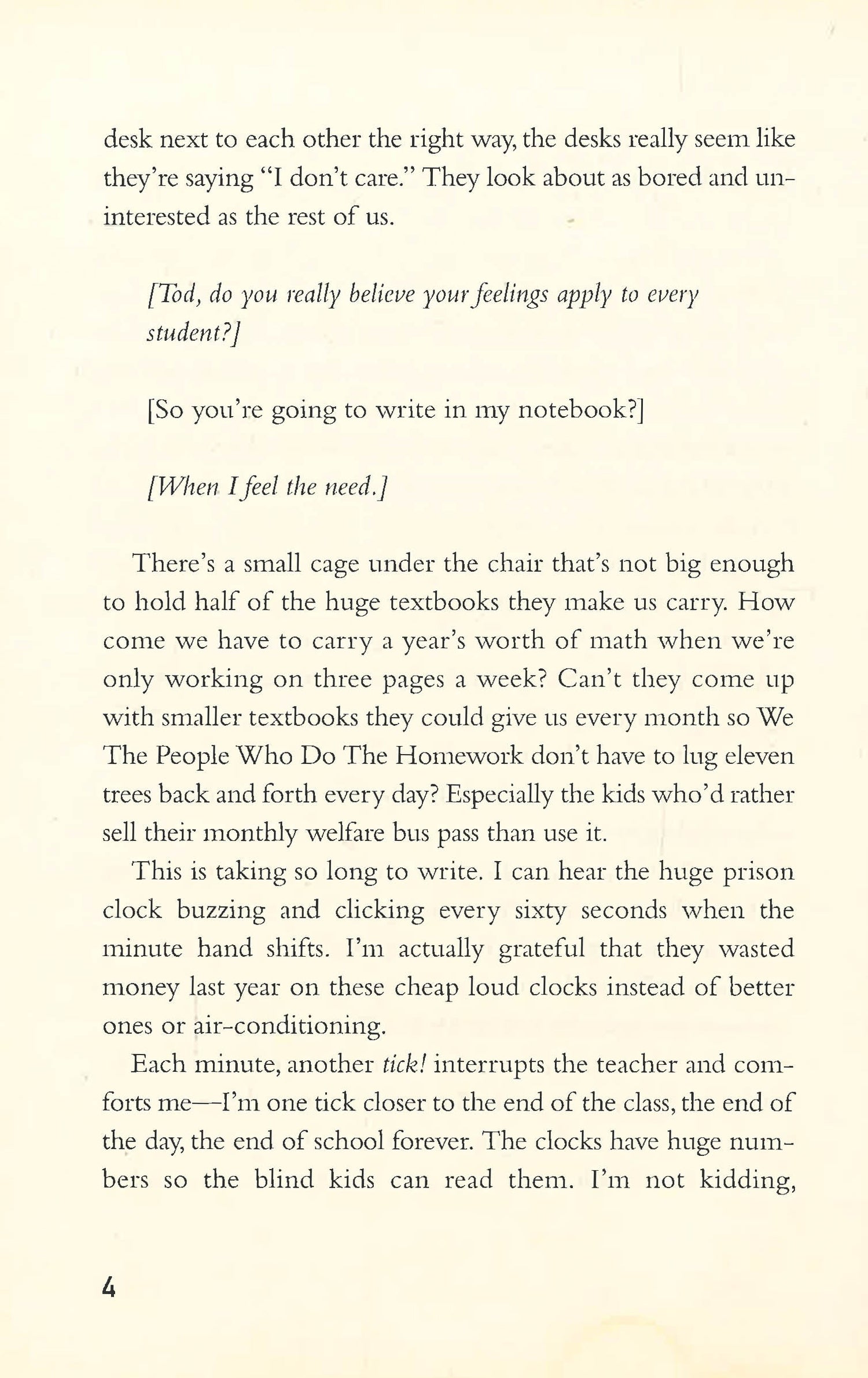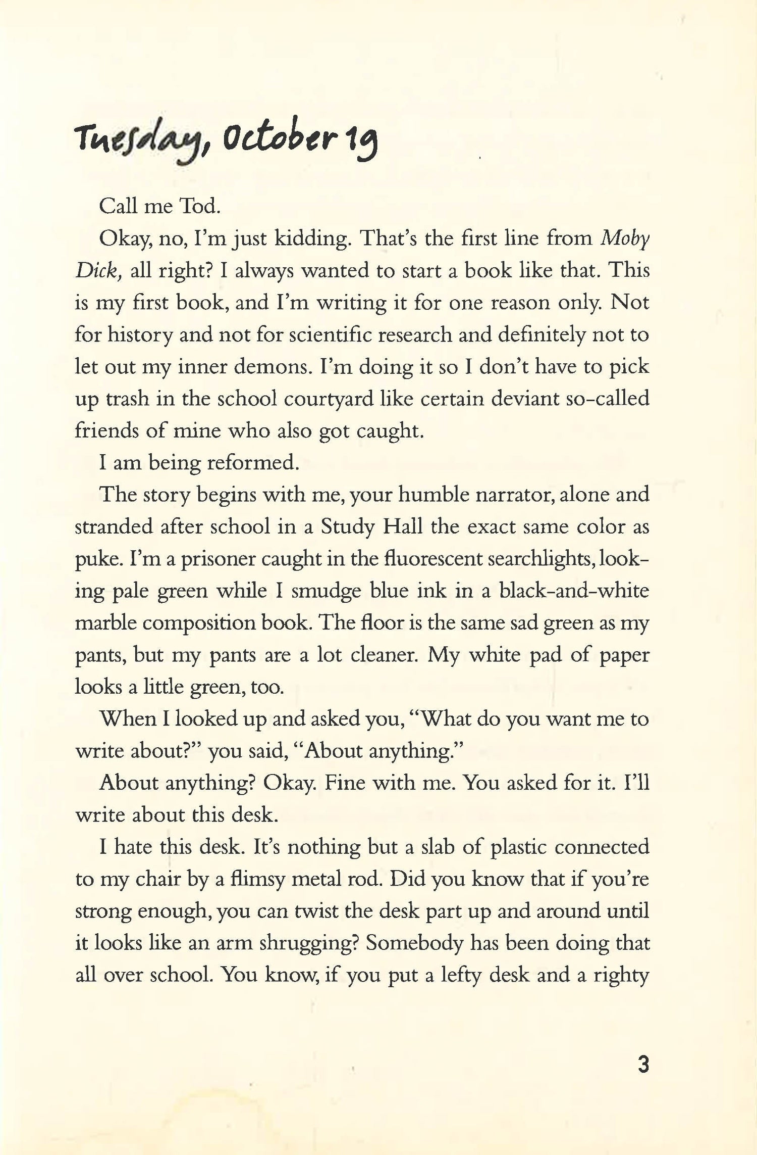 Tod Munn is a bully. He's tough, but times are even tougher. The wimps have stopped coughing up their lunch money. The administration is cracking down. Then to make things worse, Tod and his friends get busted doing something bad. Something really bad. Lucky Tod must spend his daily detention in a hot, empty room with Mrs. Woodrow, a no-nonsense guidance counselor. He doesn't know why he's there, but she does. Tod's punishment: to scrawl his story in a beat-up notebook. He can be painfully funny and he can be brutally honest. But can Mrs. Woodrow help Tod stop playing the bad guy before he actually turns into one . . . for real?