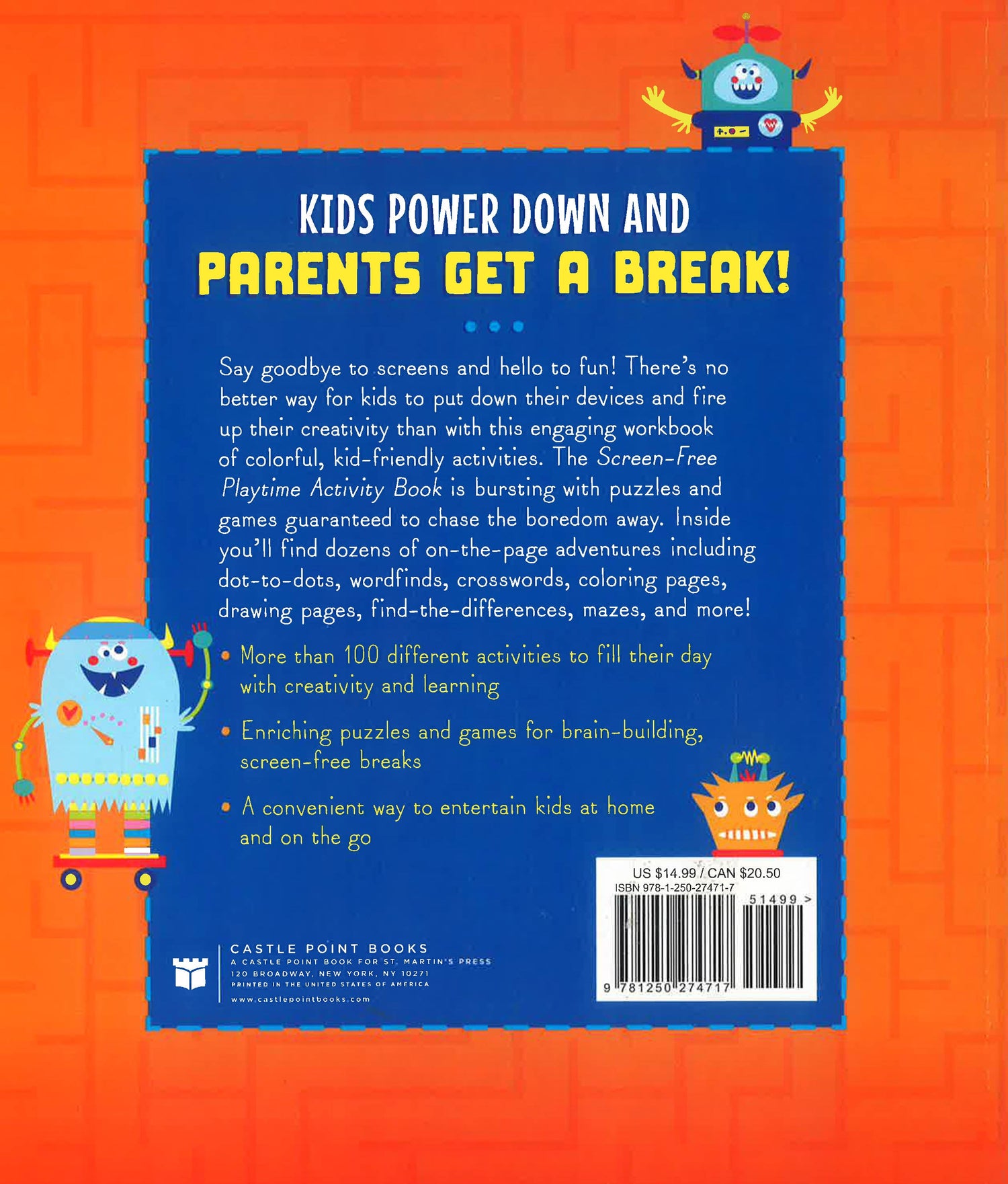 Say goodbye to screens and hello to fun! There’s no better way for kids to put down their devices and fire up their creativity than with this engaging workbook of colourful, kid-friendly activities. The Screen-Free Playtime Activity Book is bursting with puzzles and games guaranteed to chase the boredom away. Inside you’ll find dozens of on-the-page adventures including dot-to-dots, wordfinds, crosswords, colouring pages, drawing pages, find-the-differences, mazes, and more! • More than 100 different activities to fill their day with creativity and learning • Enriching puzzles and games for brain-building, screen-free breaks • A convenient way to entertain kids at home and on the go