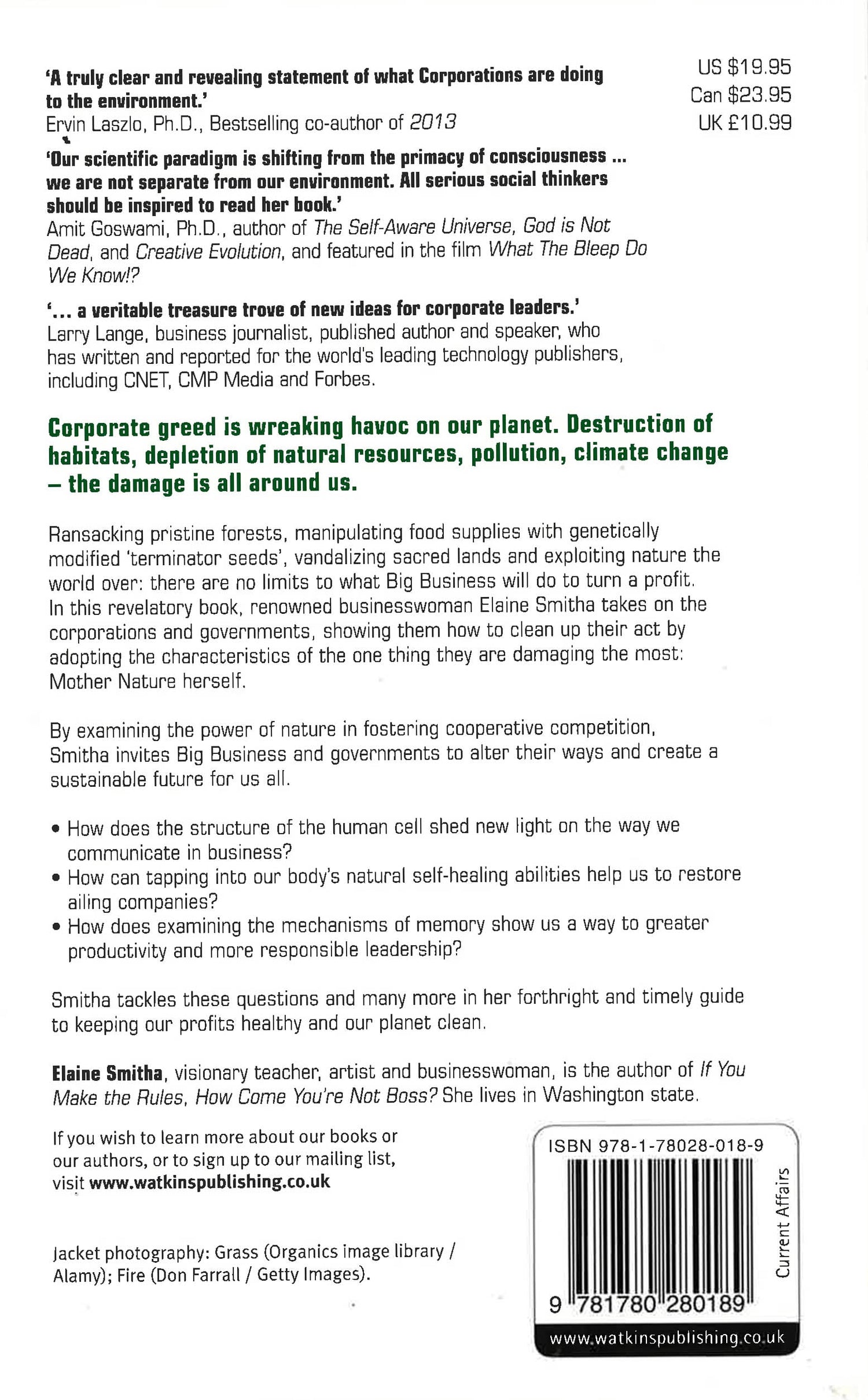 After the Deepwater Horizon exploded in the Gulf of Mexico, it was found that the rig's alarm system had been partly disabled so that workers could sleep. Hence there was no warning before the broken well started pouring oil into the sea. Now Elaine Smitha urges us to sound the alarm! Screwing Mother Nature for Profit is a wake-up call to acknowledge, and heal, the harm that corporate greed is wreaking on our planet. Overpopulation, hunger, pollution, climate change: the damage is all around us. How can we live in harmony with each other and with nature? For answers, Elaine Smitha turns to Mother Nature herself, explaining how her principles of cooperative competition can set corporations and governments on a path of conscious, sustainable growth. Drawing on concepts from Henry Ford's innovative production line to the findings of the 'new biology', she reveals a startling correlation between businesses and living systems - then uses this as the basis for a model of leadership oriented towards benefits much bigger than cash flow. Some of the topics covered include: * The danger of manipulating the food supply with 'terminator seeds' * The possibilities of collective intelligence and crowd-sourcing * Innovative solutions for health care, communications and corporate governance * Ways for businesses to tap into the self-healing processes of the body and the power of the mind. In the words of one seasoned journalist, her book 'goes worlds beyond ...tired, ineffective and faddish theories' to hold out fresh hope - not only for the corporate world, but for our whole world.