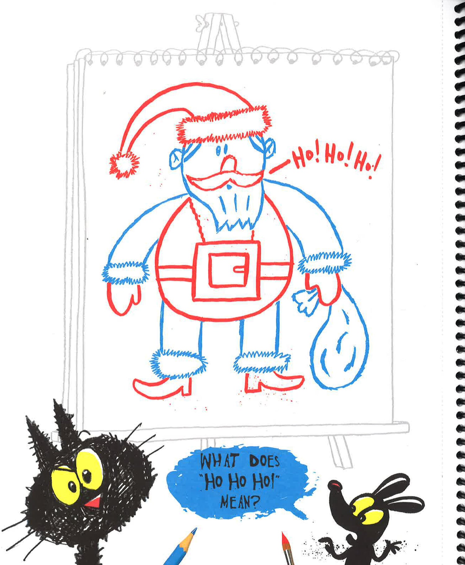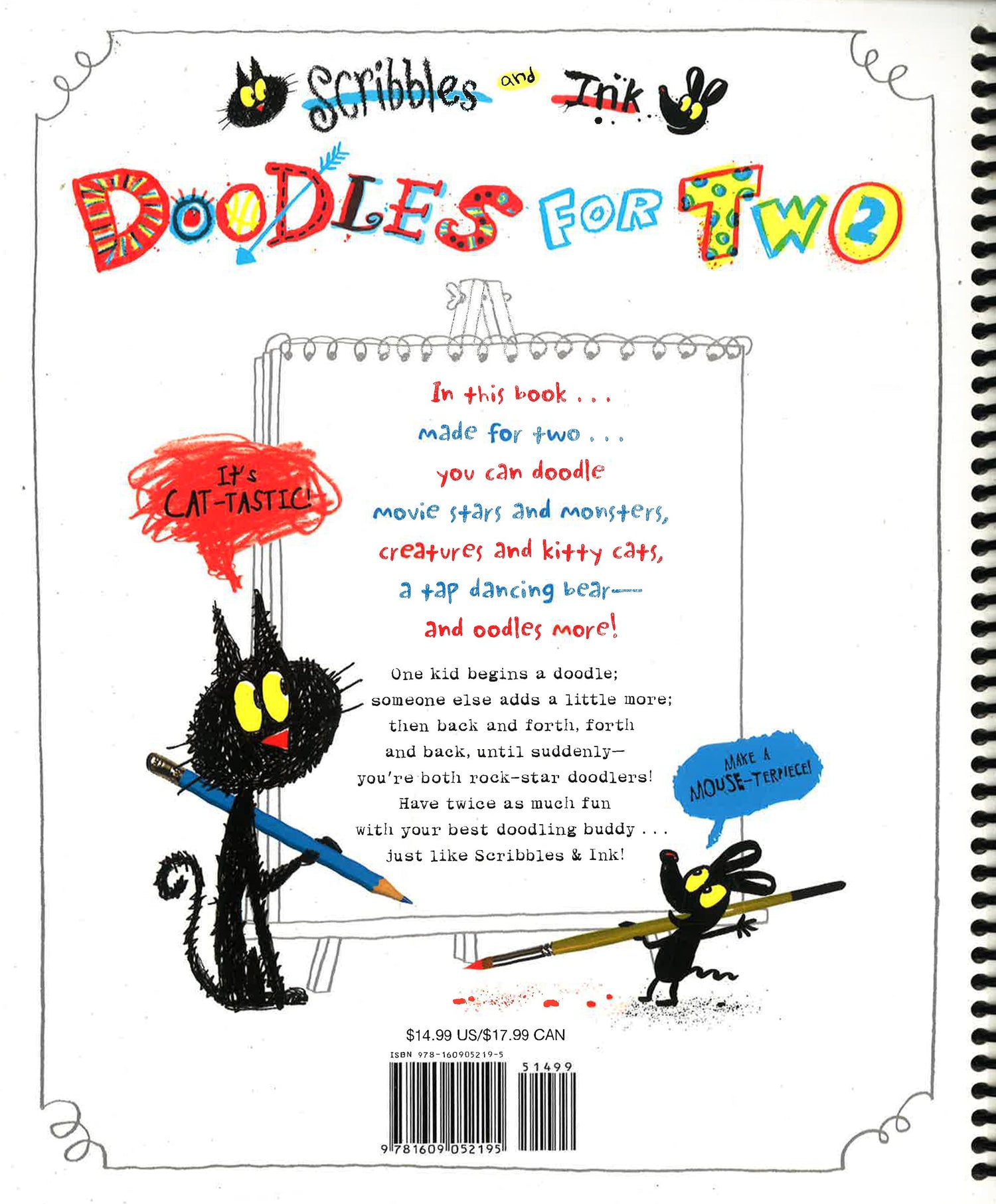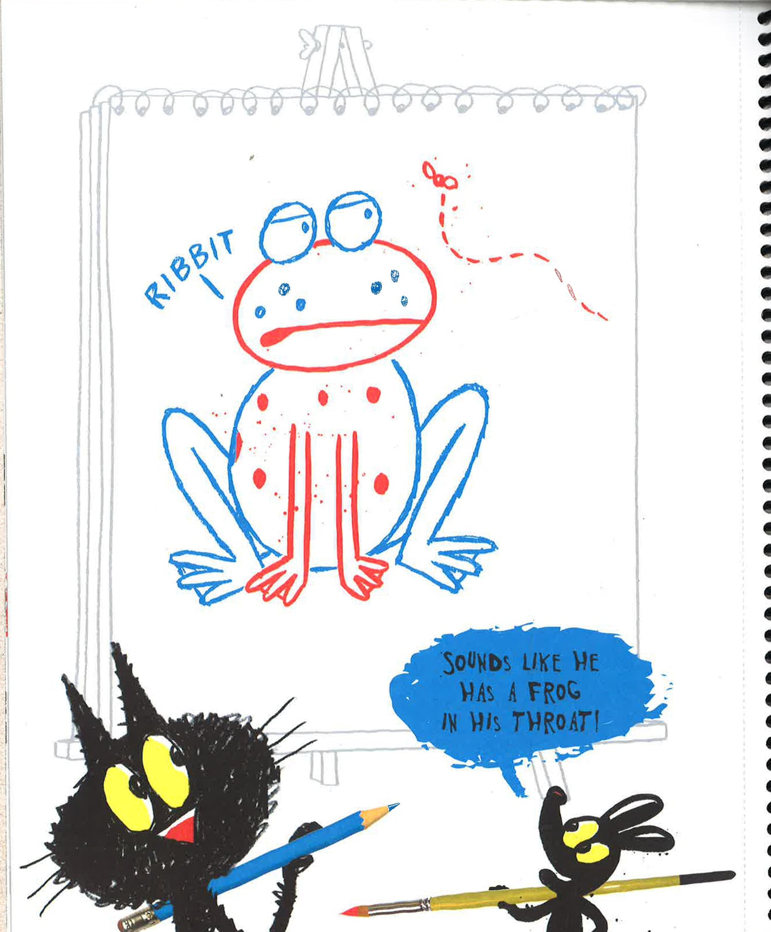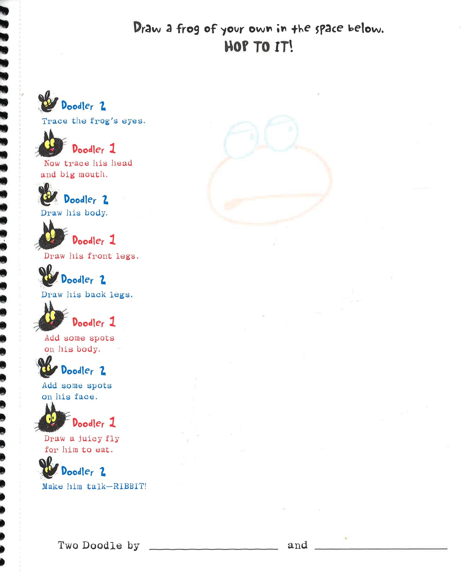 A mother and son alligator show kids how to make a drawing with two people involved. A silly sentence/description of the drawing subject accompanies a space where the partners can draw it. Some pages have spaces for two drawings, others will feature a single drawing on a large spread.
