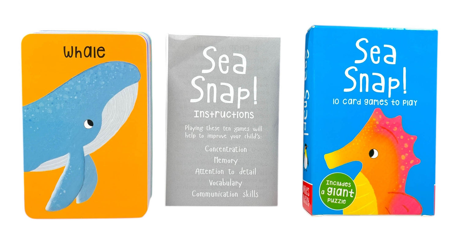 Sea Snap is only the start of the fun with these highly creative cards there are nine more ways to play with your young child, including a giant floor puzzle to assemble. 52 cards in a sturdy box Includes instructions for 10 ways to play, including a giant floor puzzle Creative games that improve memory, vocabulary, concentration and more This zingy Sea Snap card set provides hours of fun at home or on the go for children aged 3+. From finding pairs and creating stories to completing the giant puzzle, every activity helps children to develop their memory, vocabulary, concentration and attention to detail.