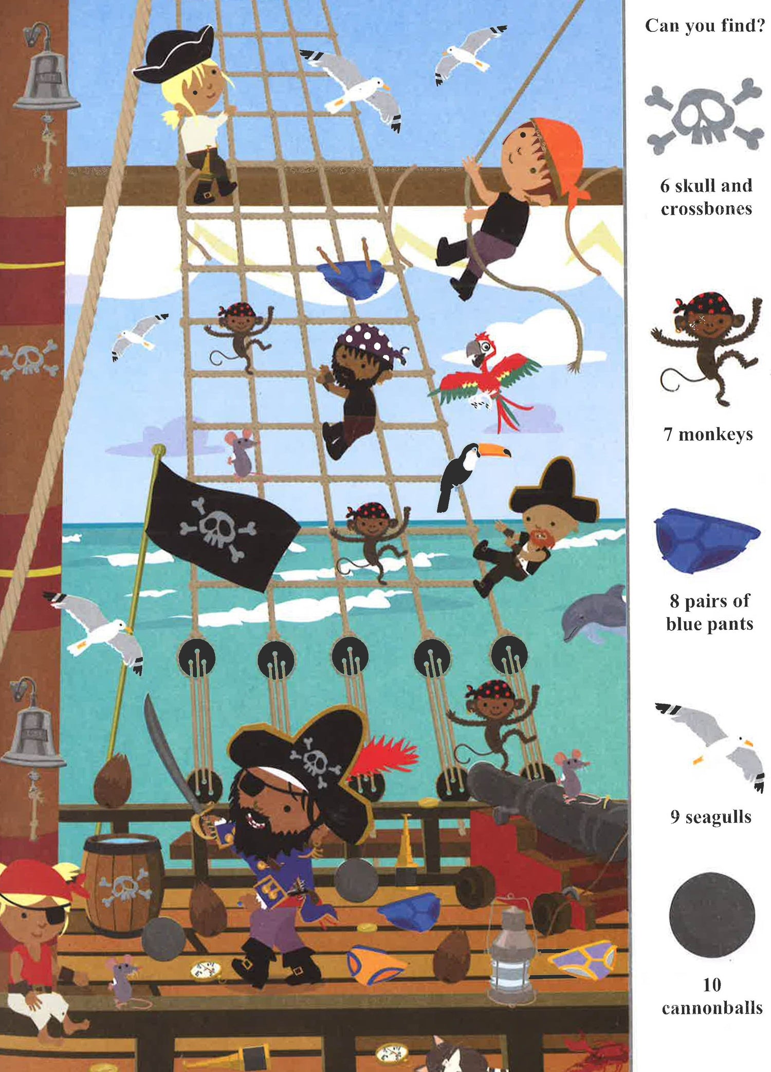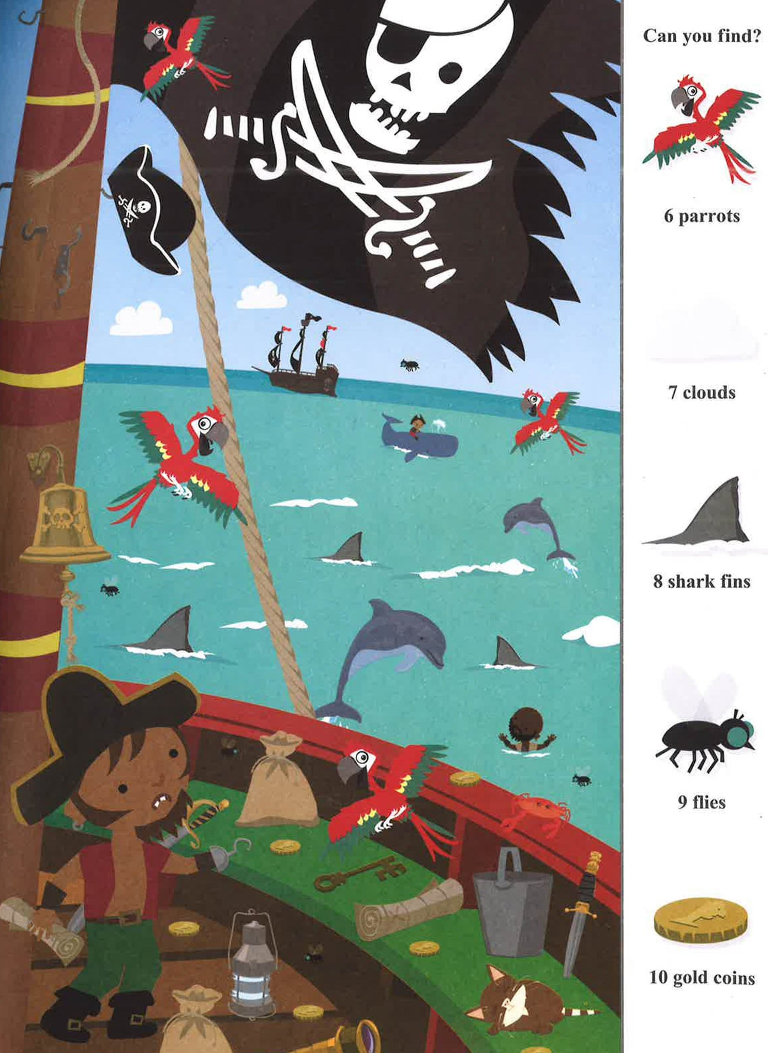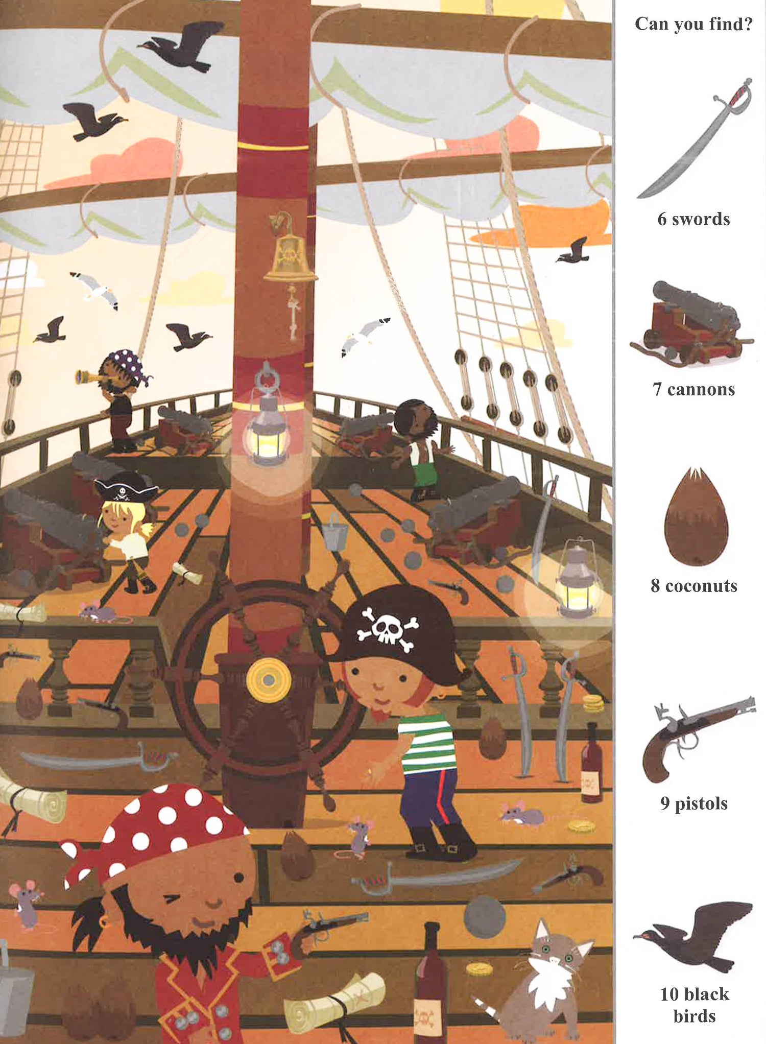 Discover swashbuckling pirate scenes packed with over 1000 things to find. From dingy cabins and the cook's galley to the tresure vault and the secretive map room, get lost in a world of pirate seach-and-find fun!