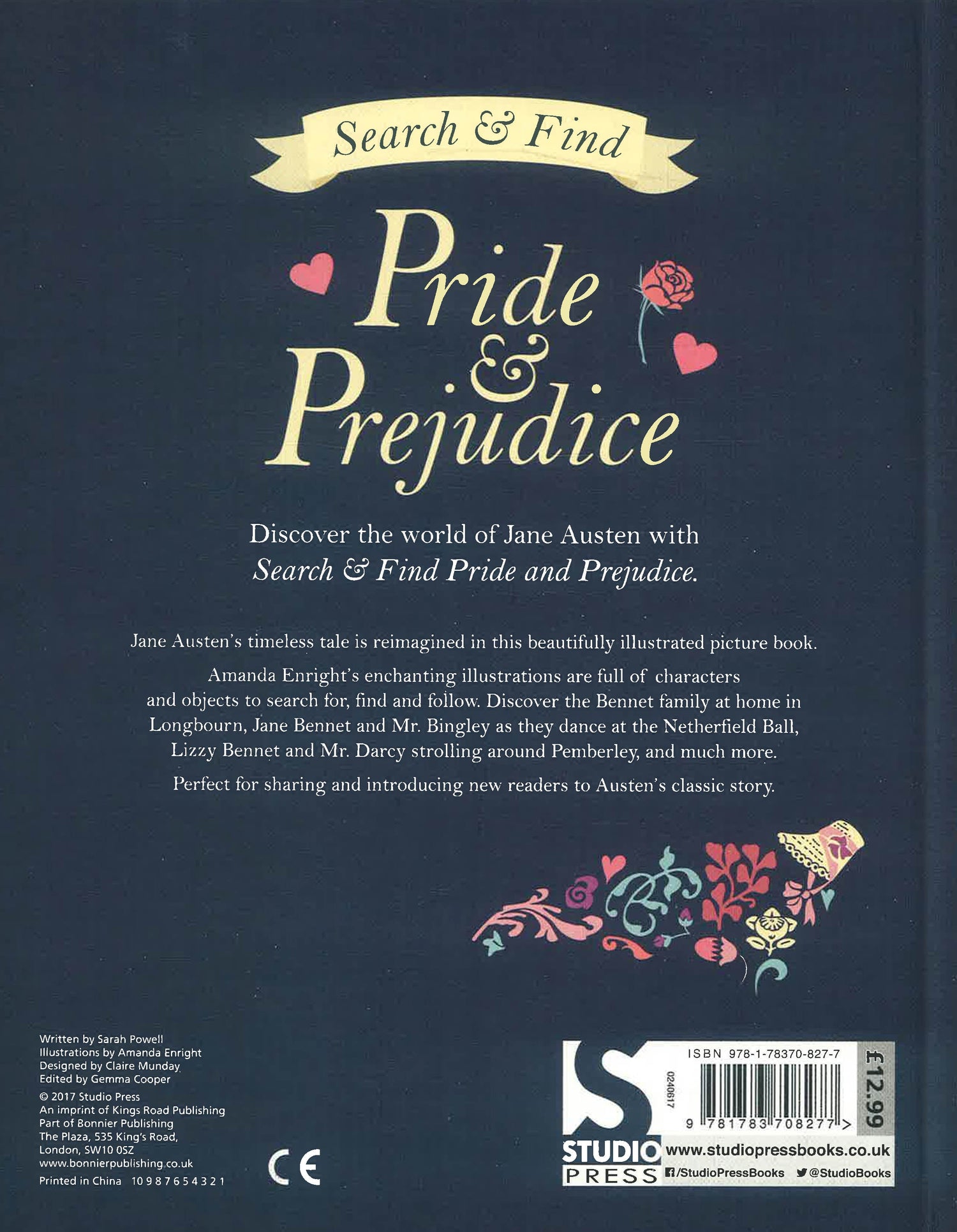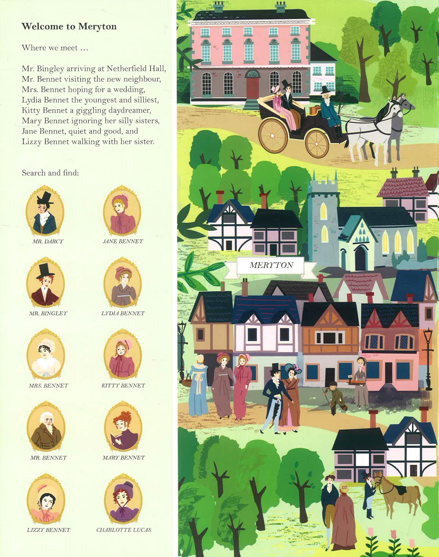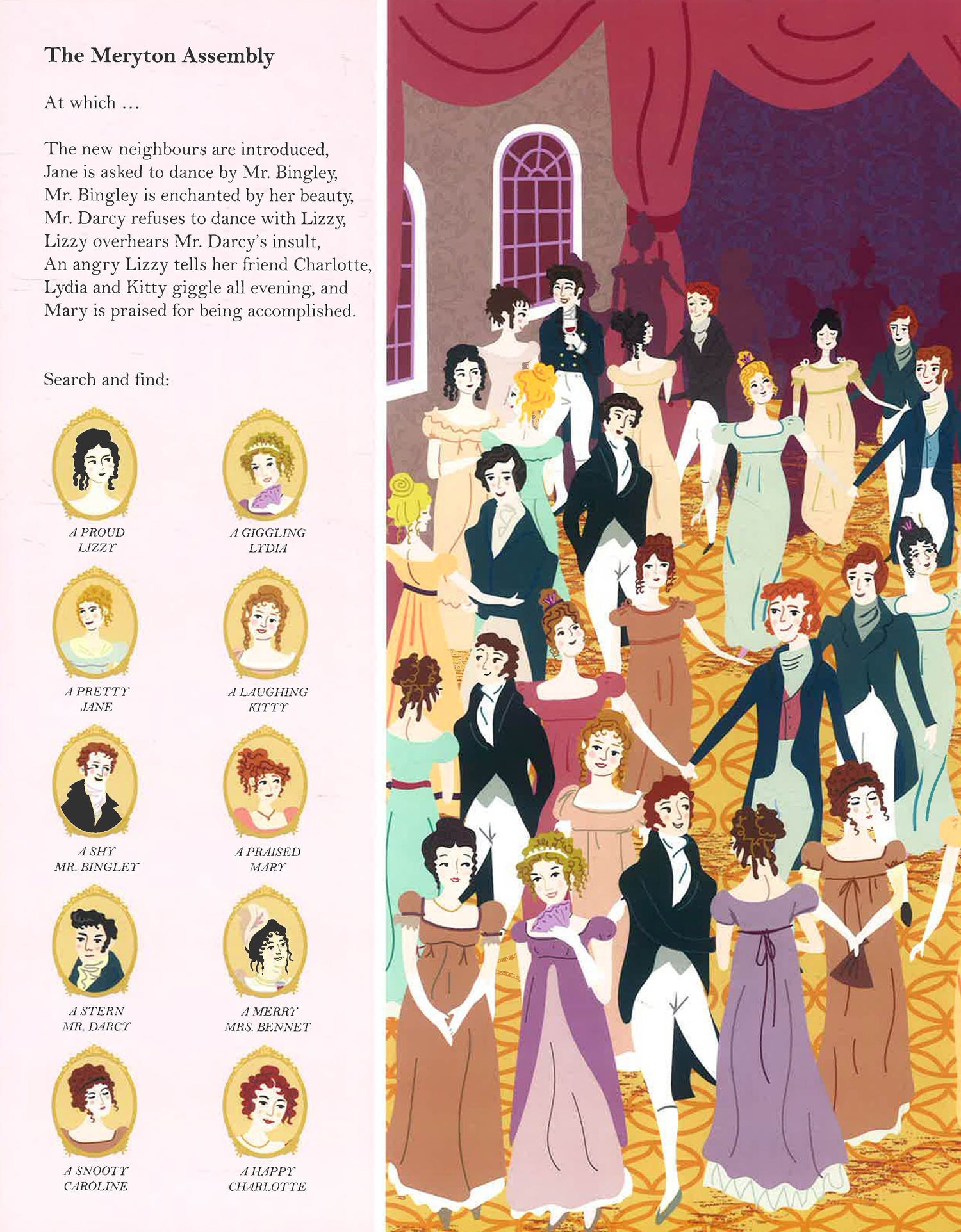 The popular, classic story is retold in beautifully illustrated search and find scenes. Search and discover the characters on the busy pages and follow them through the story. Each page is full of characters to find and details to spot in the busy scenes, such as the Bennet family 'at home' in Longbourn, Jane and Bingley falling in love at the Netherfield Ball, Lizzie and Darcy strolling around Pemberley.