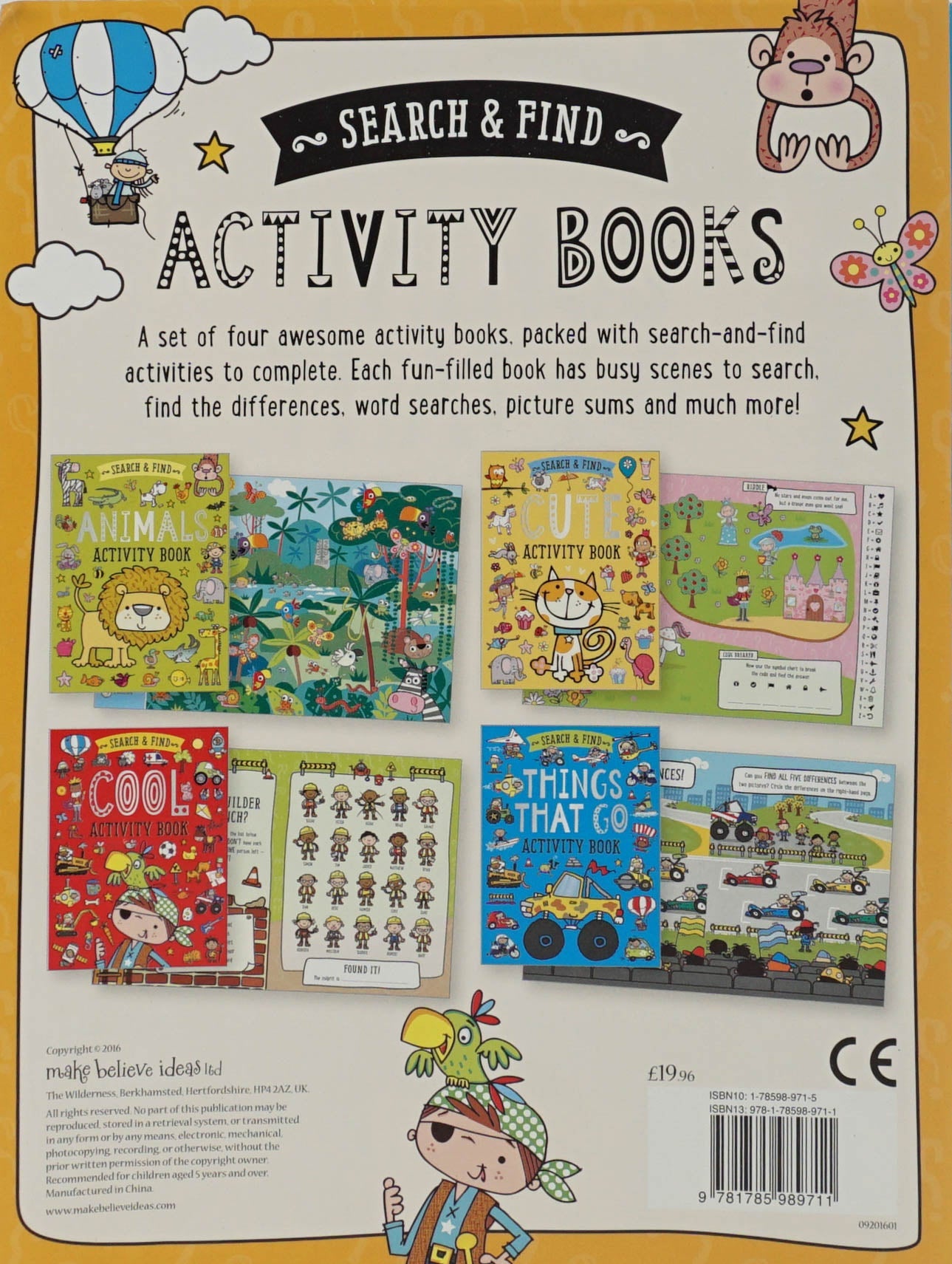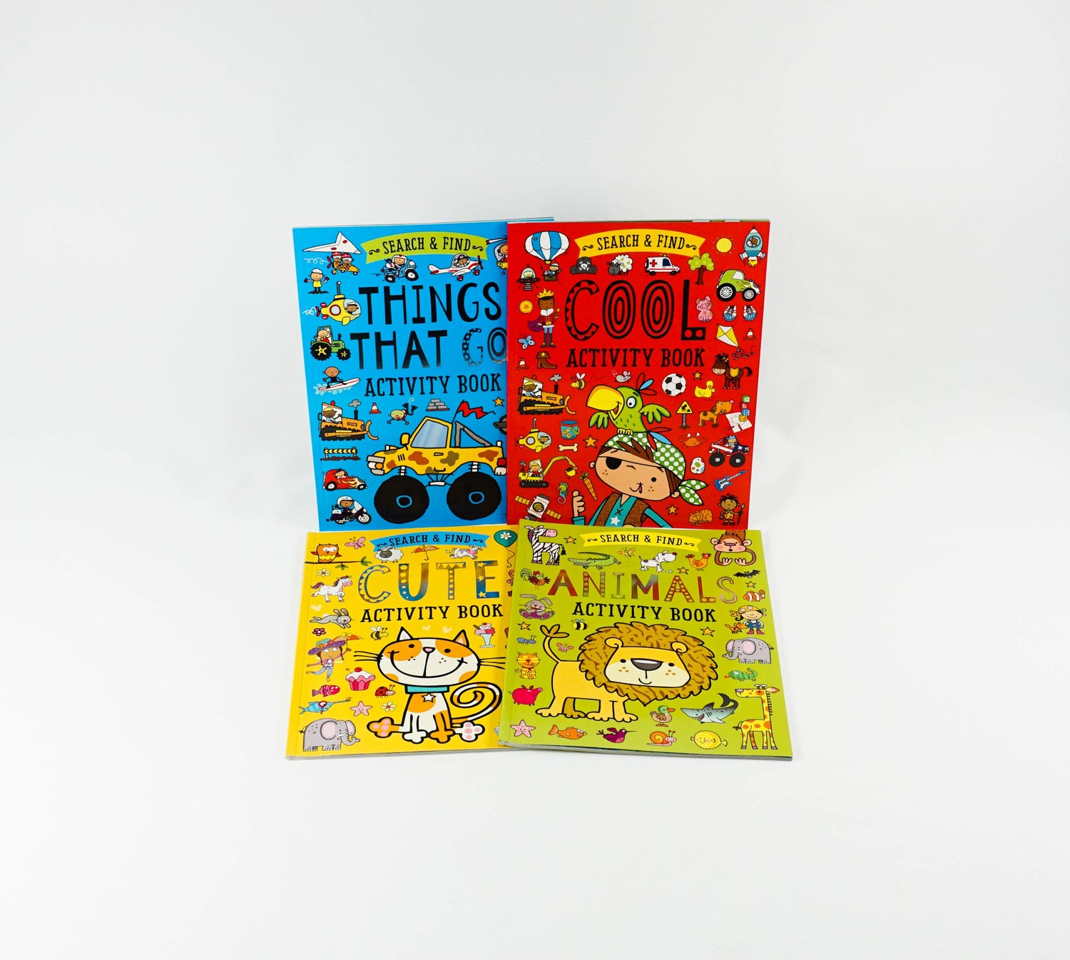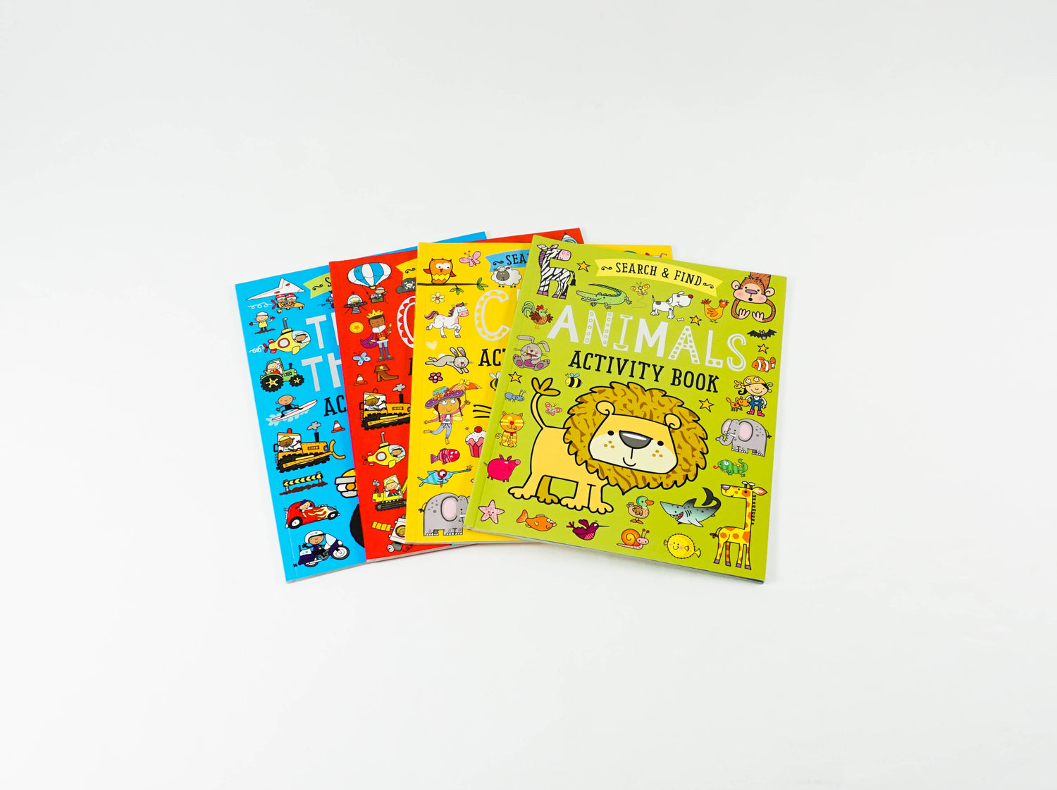 A set of four awesome activity books, packed with search-and-find activities to complete. Each fun-filled book has busy scenes to search, find the differences, word searches, picture sums and much more!