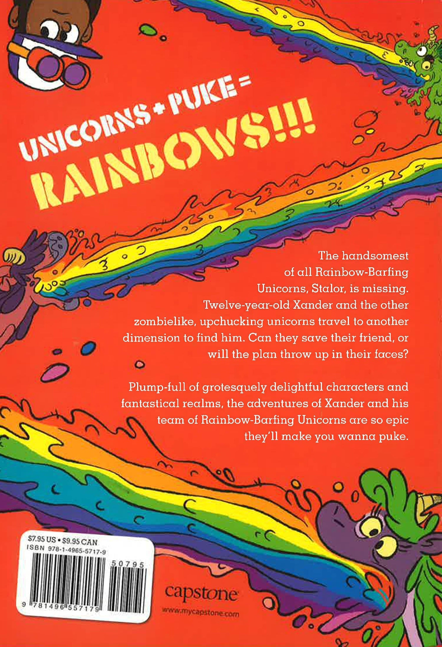 Xander Stone must save the handsomest of all Rainbow-Barfing Unicorns! In this installment, the handsomest of all Rainbow-Barfing Unicorns, Stalor, is missing. (P.S. He's not really that handsome.) Twelve-year-old Xander and his other stinky, zombielike, upchucking unicorns set out to find him. Their naively heroic quest leads them to another dimension ruled by a diabolically bizarre king. Can the Rainbow-Barfing Unicorns save their relatively handsome friend, or will the plan throw up in their faces?