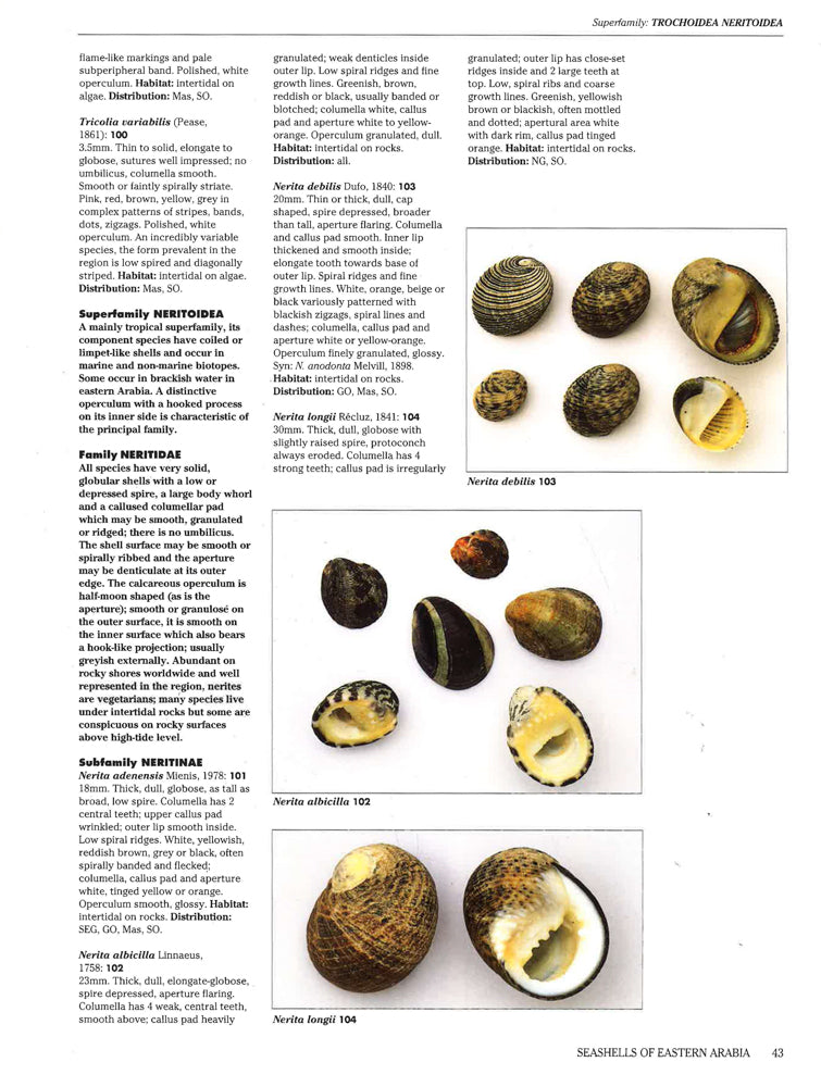 Seashells of Eastern Arabia editor Peter Dance from his own writings and those of Donald Bosch, R.G. Moolenbeek & P. Graham Oliver. ISBN 9781873544648, published by Motivate Press, Abu Dhabi, UAE. It has been a very long time since I have been able to find a copy of this 1995 publication. It is a large format book 32 by 24cm. in size (about 9½ by 12 ½ inches )and it contains 296 pages. Each page contains the text which gives very thorough information about the shells and either large, full color or black and white color photos of the shells on that page. The book has a printed laminated board covers . It is an excellent book and it is the most comprehensive look at the shells from the Red Sea that are often not found in other more generalized shell books. I have one book in stock that is used but looks as if it was a new book. There is some foxing inside the covers and on the endpapers but overall it is a very good copy of this book.