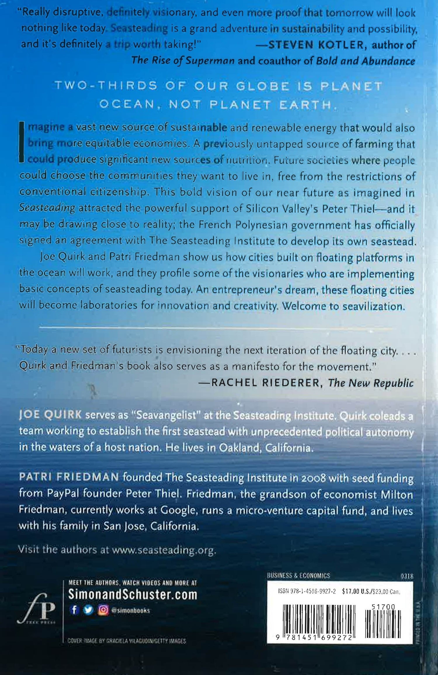 In these “thought-provoking visions of the future” (The Wall Street Journal), Joe Quirk and Patri Friedman of the Seasteading Institute explain how ocean cities can solve many of our environmental, technological, and civic problems, and introduce the visionaries and pioneers who are now making seasteading a reality.Our planet has been suffering from serious environmental problems and their social and political consequences. But imagine a vast new source of sustainable and renewable energy that would also bring more equitable economies. A previously untapped source of farming that could produce significant new sources of nutrition. Future societies where people could choose the communities they want to live in, free from the restrictions of conventional citizenship. This extraordinary vision of our near future as imagined in Seasteading attracted the powerful support of Silicon Valley’s Peter Thiel - and it may be drawing close to reality. Facing growing environmental threats, French Polynesia has already signed on to build some of the world’s first seasteads. Joe Quirk and Patri Friedman show us how cities built on floating platforms in the ocean will work, and they profile some of the visionaries who are implementing basic concepts of seasteading today. An entrepreneur’s dream, these floating cities will become laboratories for innovation and creativity. Seasteading “offers hope for a future when life on land has grown grim” (Kirkus Reviews), proving the adage that yesterday’s science fiction is tomorrow’s science fact.